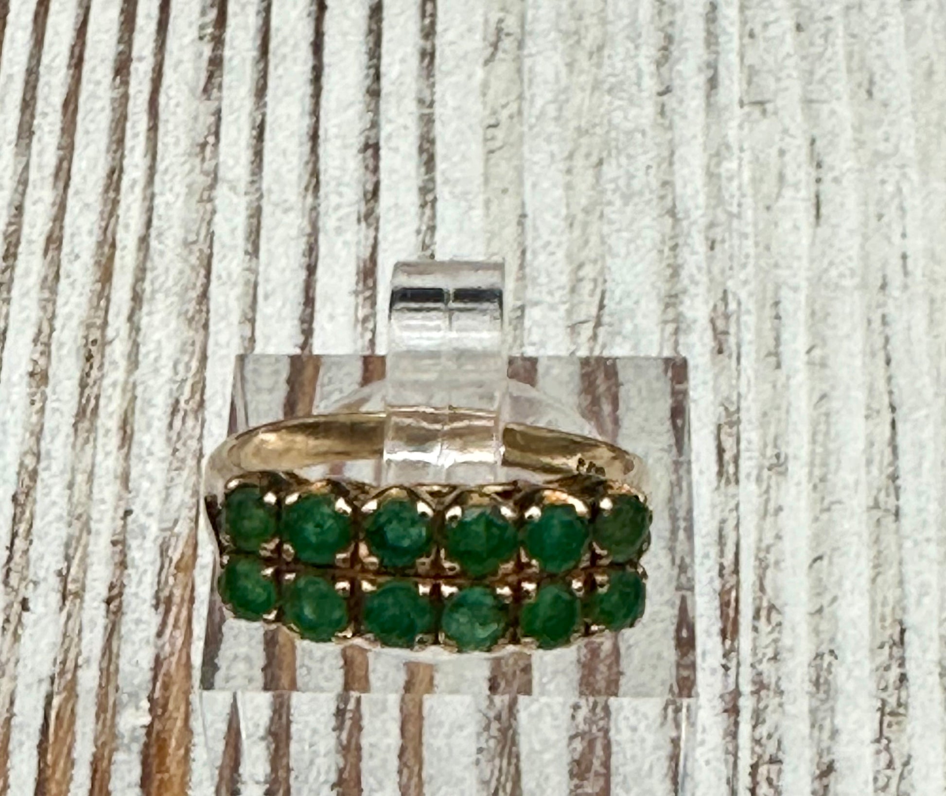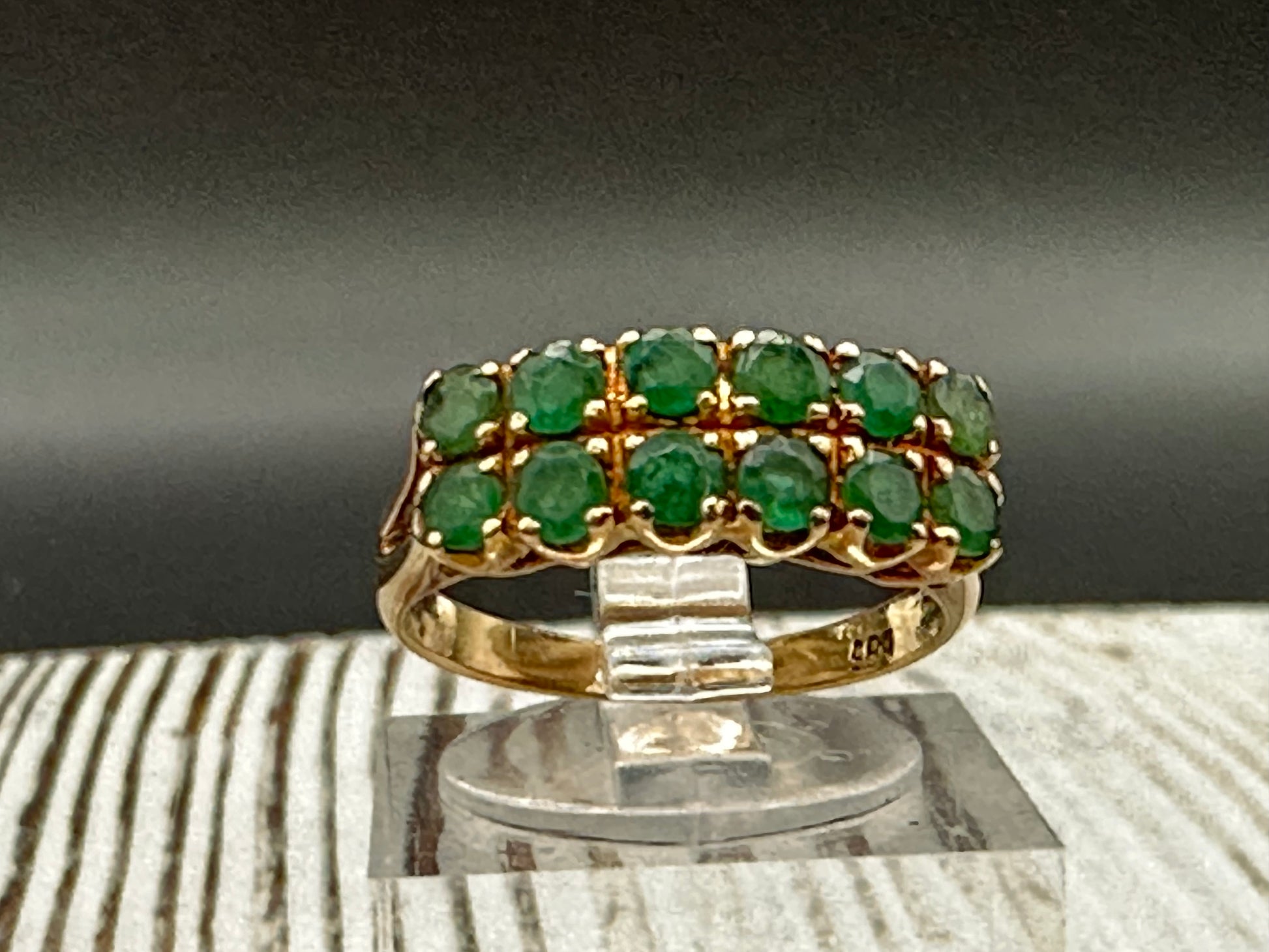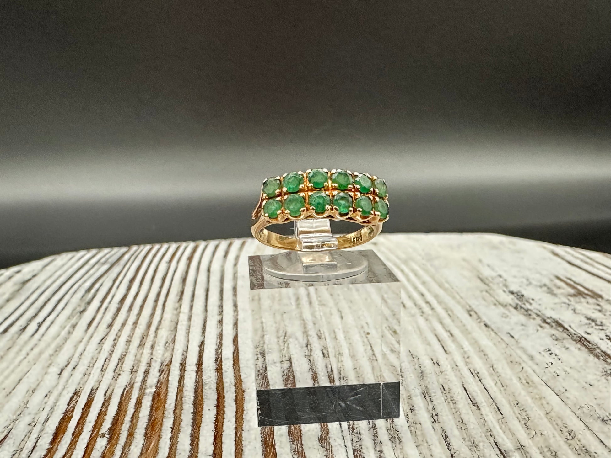 Crafted by expert artisans, this elegant 14K gold ring showcases 12 lustrous round cut Emeralds. The interior of the band is stamped with 585 for authenticity. Its petite size, currently a five, can be adjusted by a jeweler for a perfect fit.