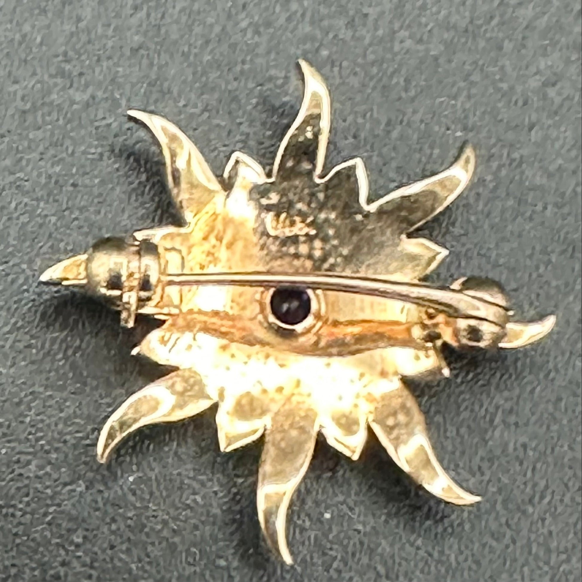 This true vintage Antique Seed Pearl and Amethyst Starburst Brooch is a stunning piece of history. The gold sunburst is adorned with delicate seed pearls and a central amethyst, adding elegance to any outfit. Though showing some wear, it only adds to the authenticity of this 14K marked brooch from circa 1900. Total weight is 2.2 grams and diameter is 2 cm. Experience the beauty of the past with this exquisite vintage piece.
