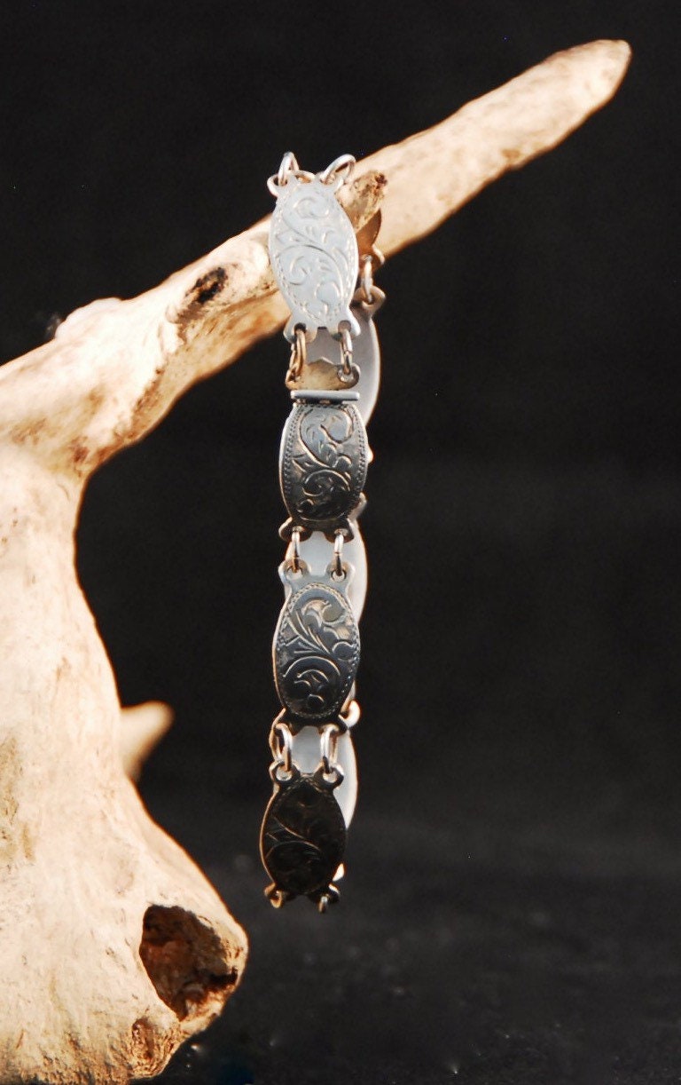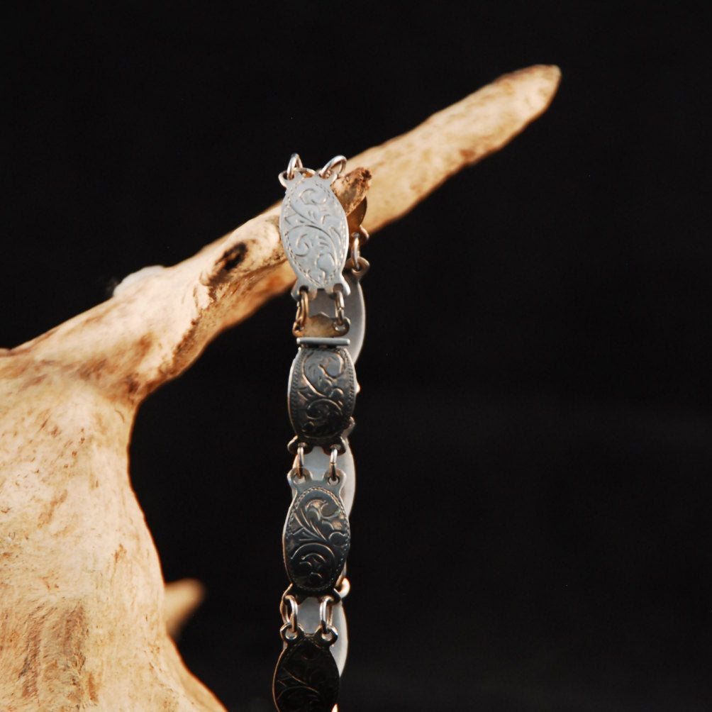 Indulge in the timeless elegance of our Vintage Sterling Silver Mexican Link Bracelet. Hand-tooled and stamped by skilled artisans, each delicate plate is linked to create a dainty and beautiful piece. Measuring 7 inches in length, this bracelet is a stunning addition to any jewelry collection.
