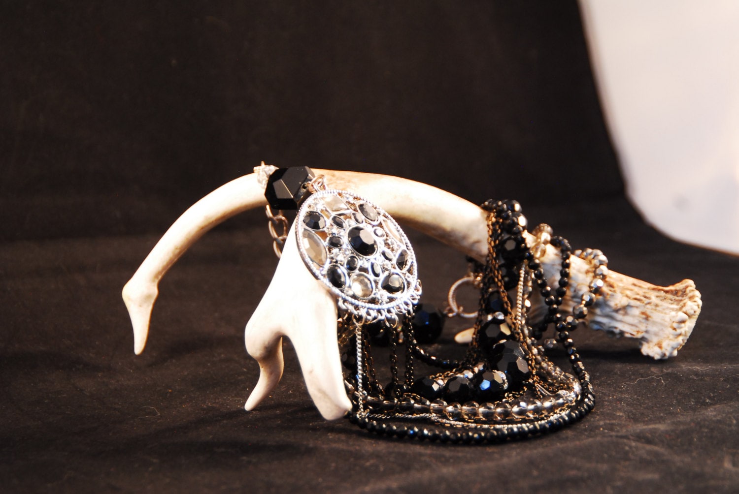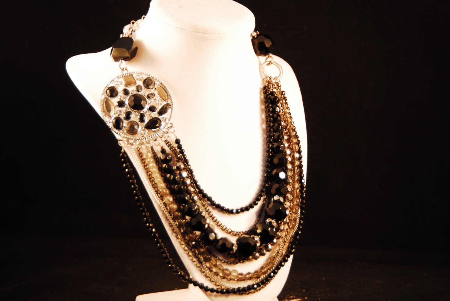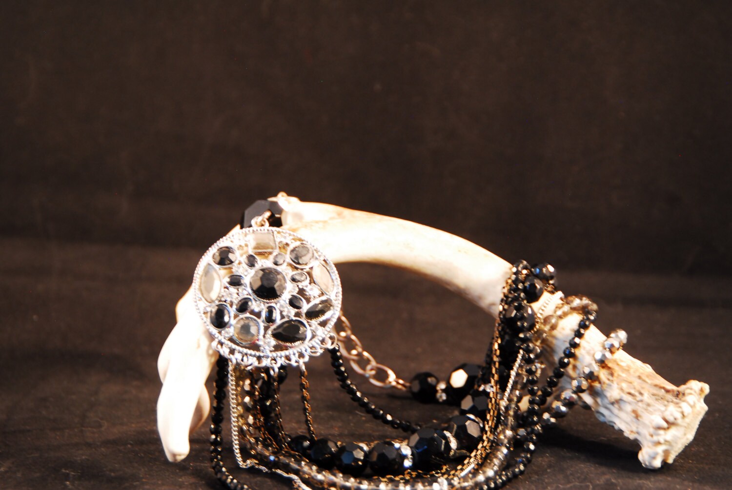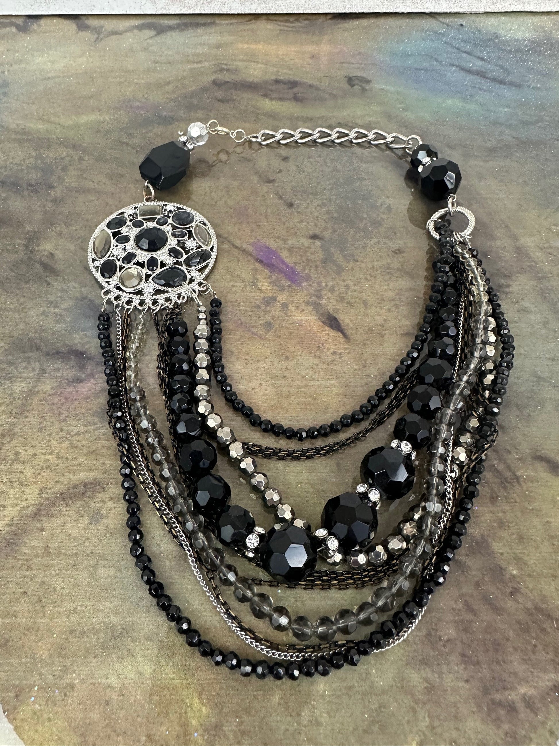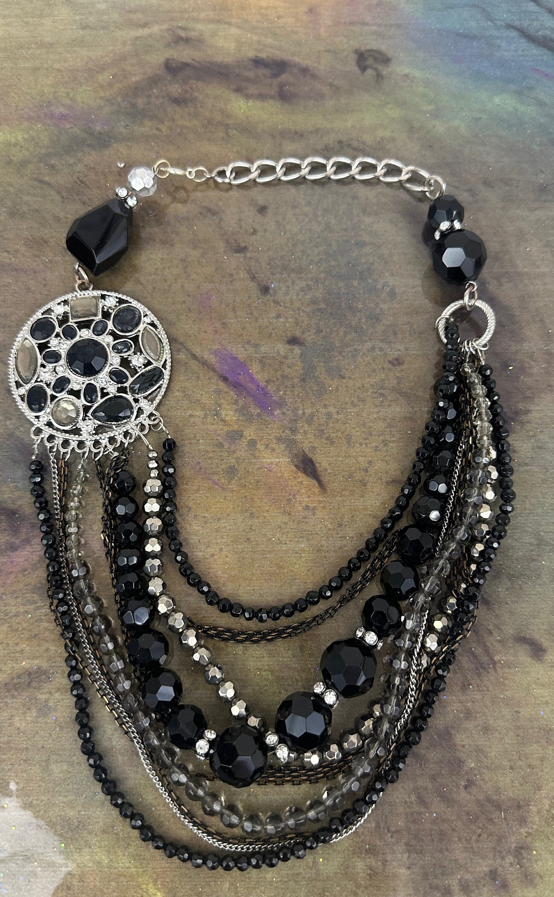 Black bead multistrand necklace- what a fun piece to wear- Show your vintage love! This 9 strand necklace has a silvertone plate with lucite beads. No markings. Length is 42 centimeters and weighs 112 grams. A fun statement piece to liven up any outfit!!