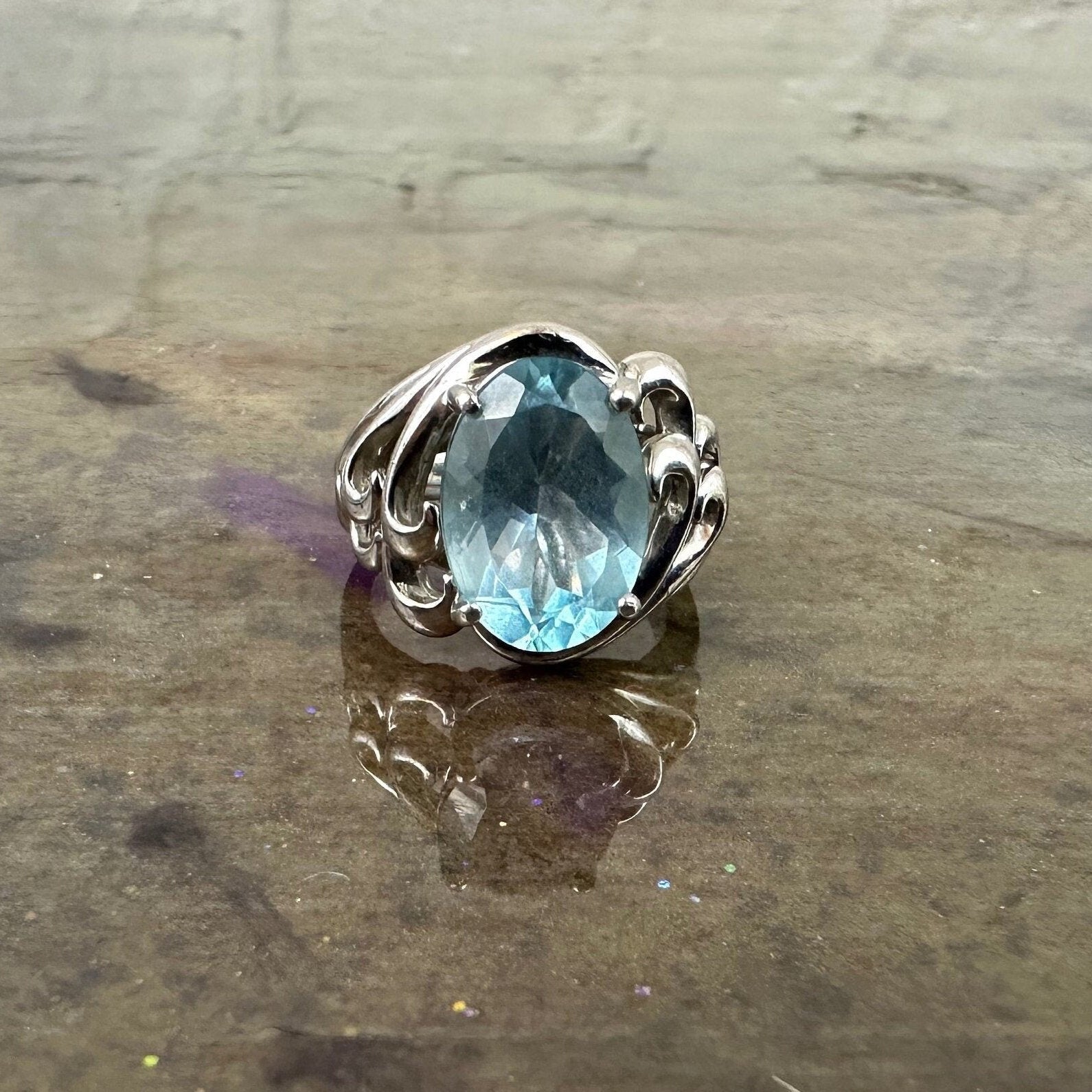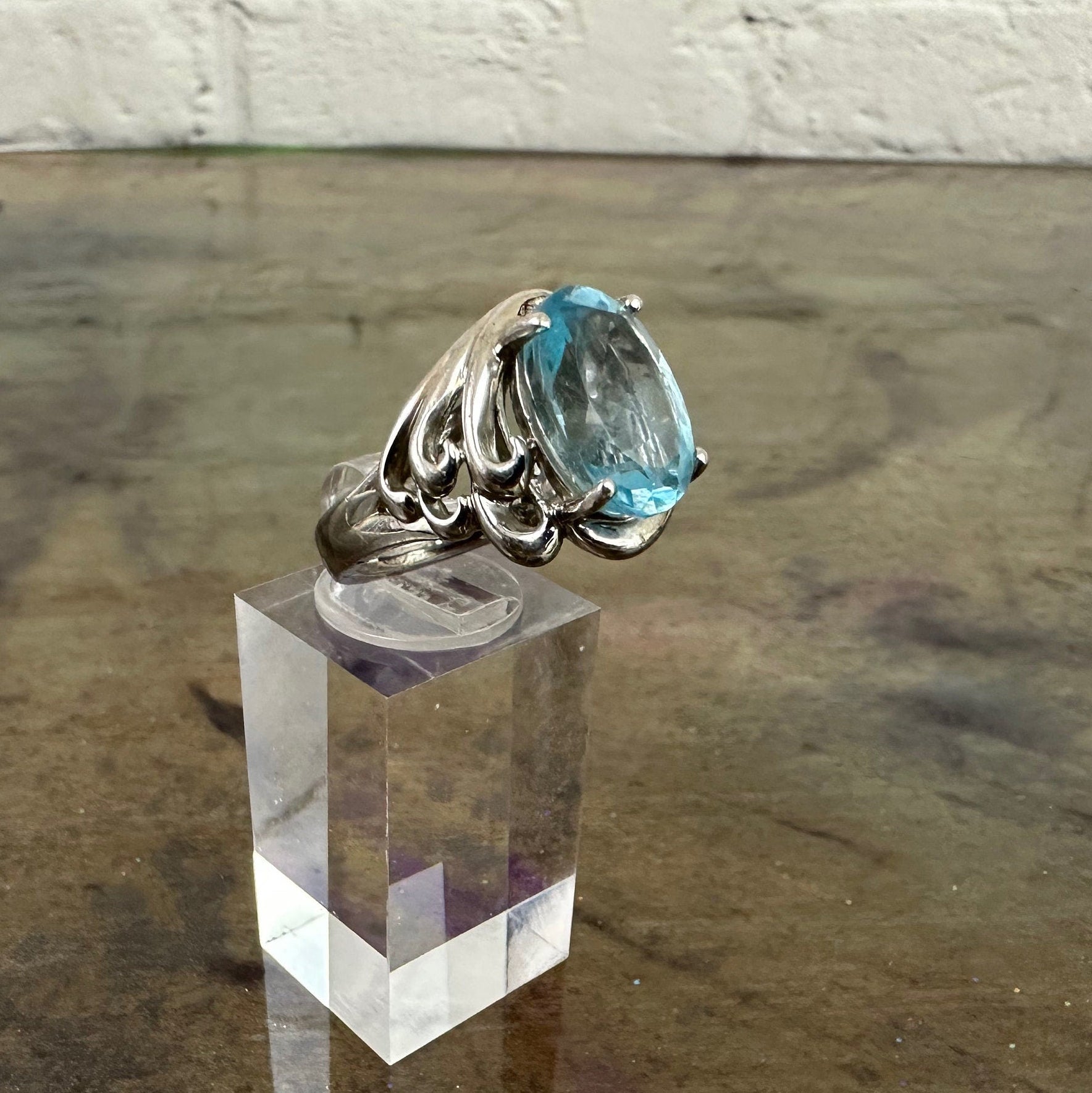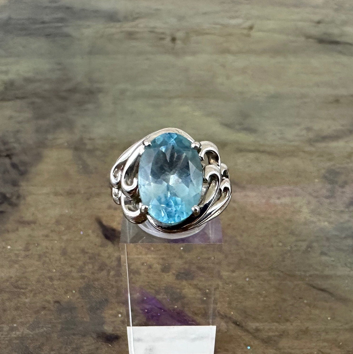 Enhance your wardrobe with this stunning Sterling silver ring featuring a beautiful Blue Topaz stone that weighs approximately 7.5 carats. The intricate wave pattern adds a touch of elegance to this heavy ring, weighing a total of 9.4 grams. Rest assured, this ring has not tarnished over the years, possibly due to its rhodium or platinum plating (although this is unverified).