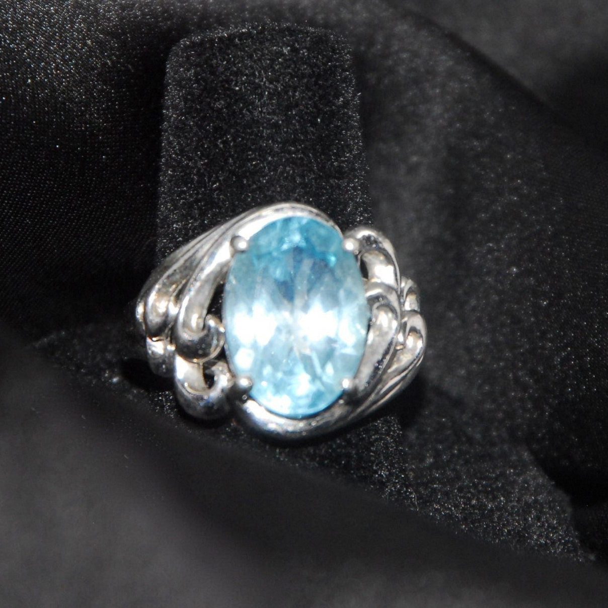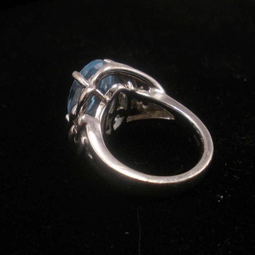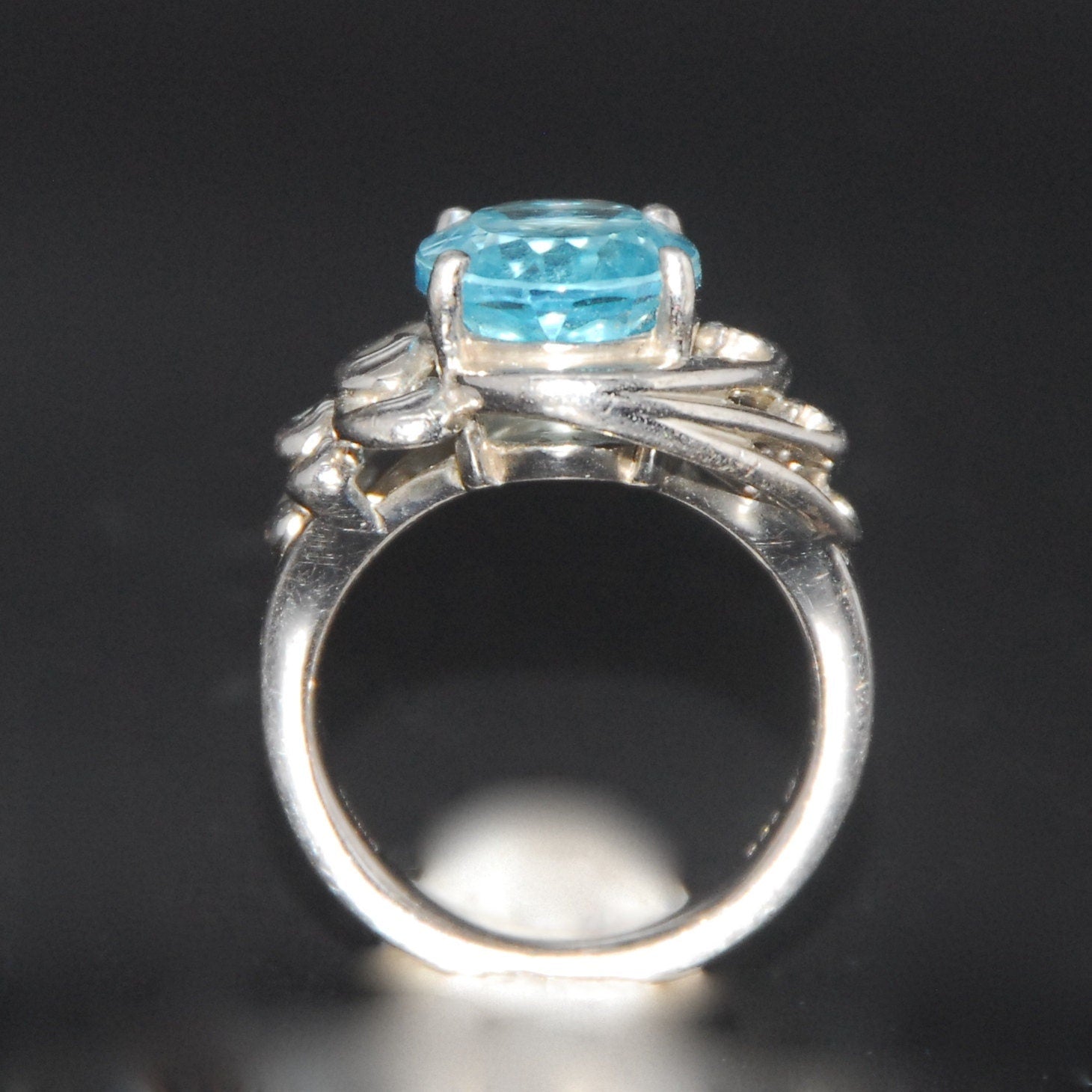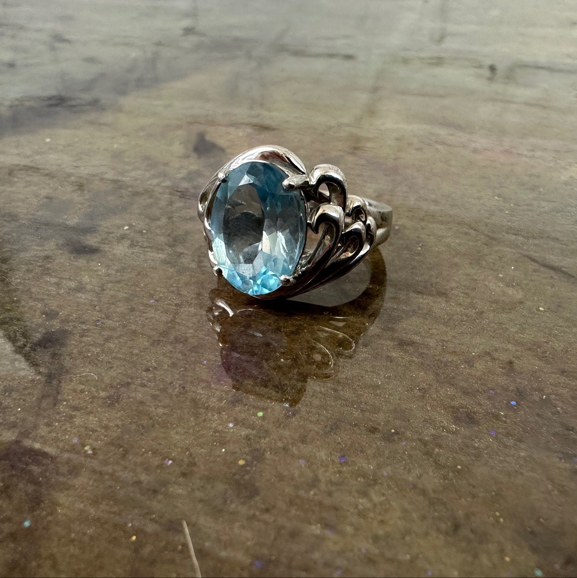 Enhance your wardrobe with this stunning Sterling silver ring featuring a beautiful Blue Topaz stone that weighs approximately 7.5 carats. The intricate wave pattern adds a touch of elegance to this heavy ring, weighing a total of 9.4 grams. Rest assured, this ring has not tarnished over the years, possibly due to its rhodium or platinum plating (although this is unverified).