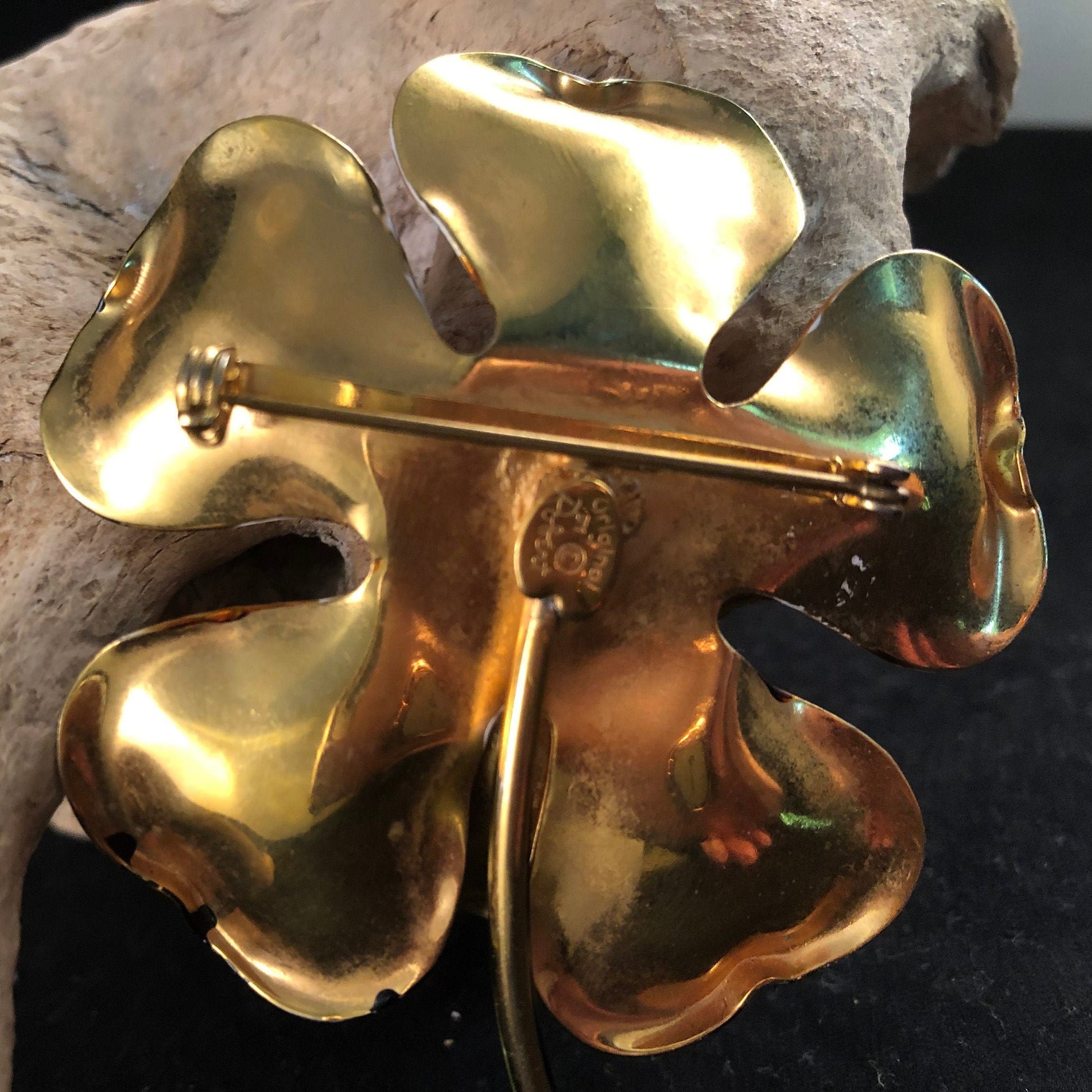 This enamel flower brooch is an original design by Robert featuring beautiful shades of brown and yellow. Expertly crafted, this pin is a stunning addition to any accessory collection. The brooch weighs 18.5 g and measures 3.5 inches tall (9cm) and 2.5 inches wide (6cm). Signed on the back “Original by Robert” in a tag that was use by the the Fashioncraft Jewelry Company from 1942-1979