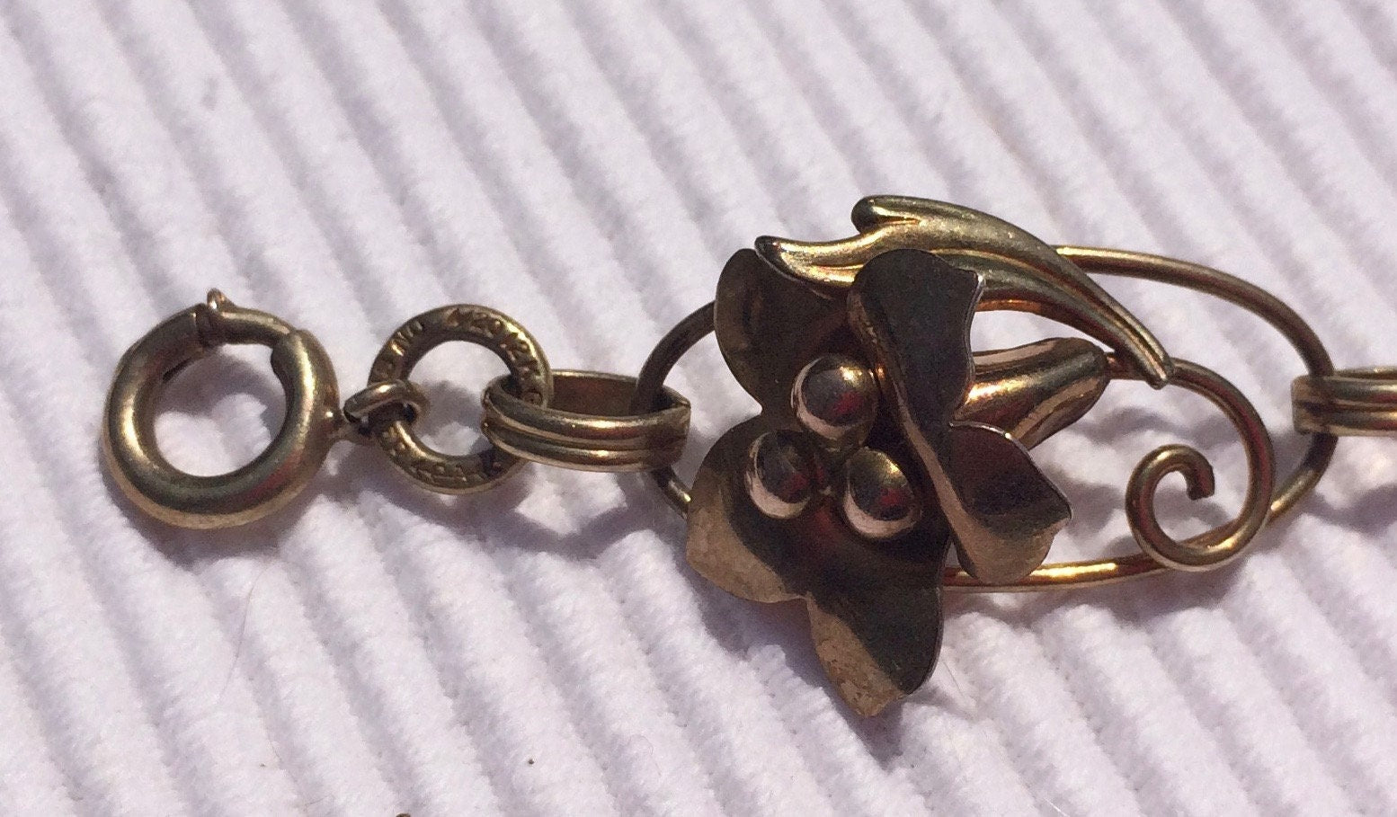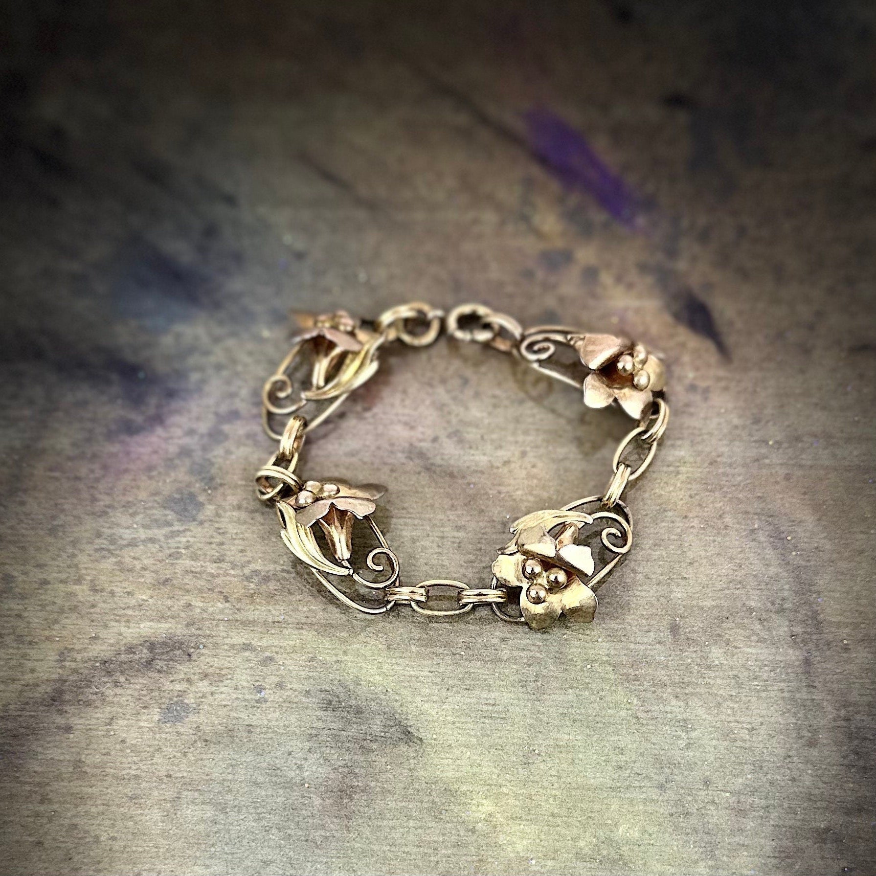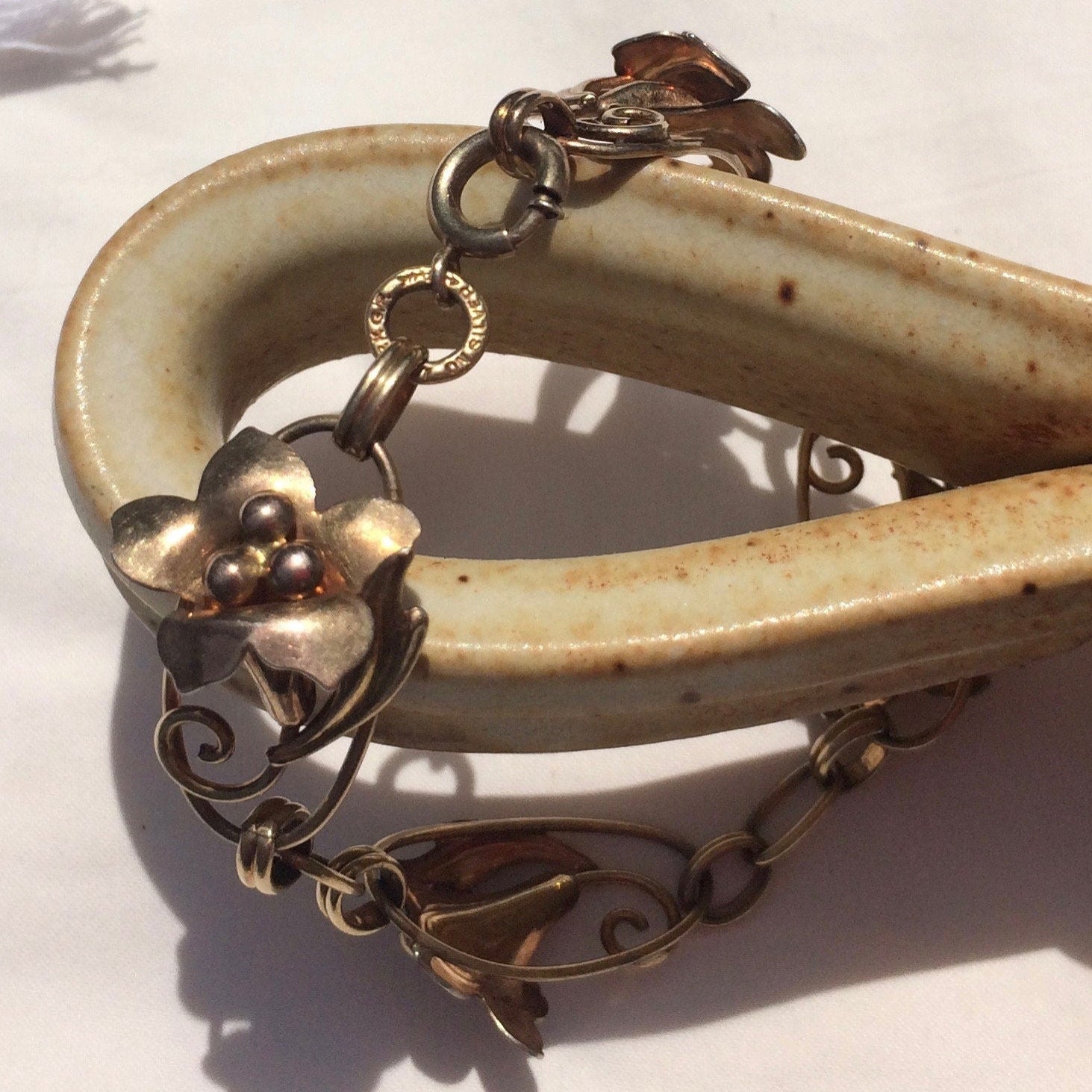 Step back in time with this Art Deco Carl Art signed Lily blossom link bracelet. Crafted in 1/20 12K gold-filled sterling silver, this vintage piece features three-dimensional flowers with the iconic CA arrow signature and patent number 130141. With its timeless design and slight wear marks, this bracelet is perfect for any collector. Weighing 12.5 g, it's a true gem from the 1940's.