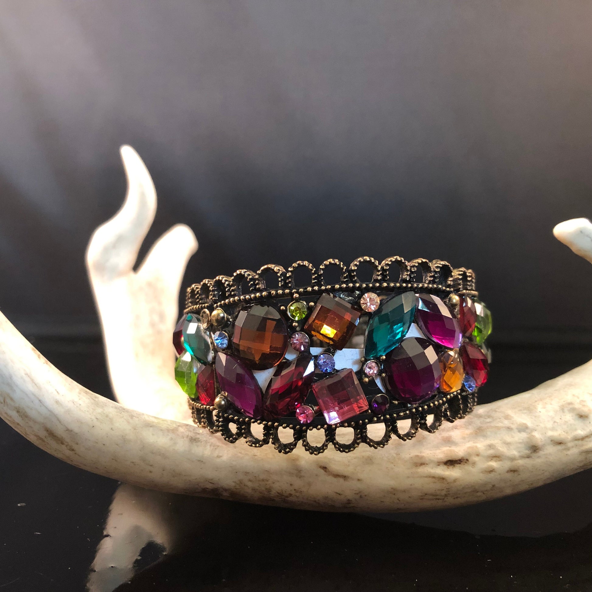 This stylish and colorful bracelet features a dazzling array of paste stones in shades of purple, pink, green, red, brown, and white blue. Its bronze construction adds a touch of elegance to this playful accessory. At 3.5 cm tall and with a flexible width of 5.75 cm, it is perfect for any low key day. With a weight of 37.98 g, it is both lightweight and comfortable to wear. Add a pop of color to your outfit with this vibrant and versatile bracelet.