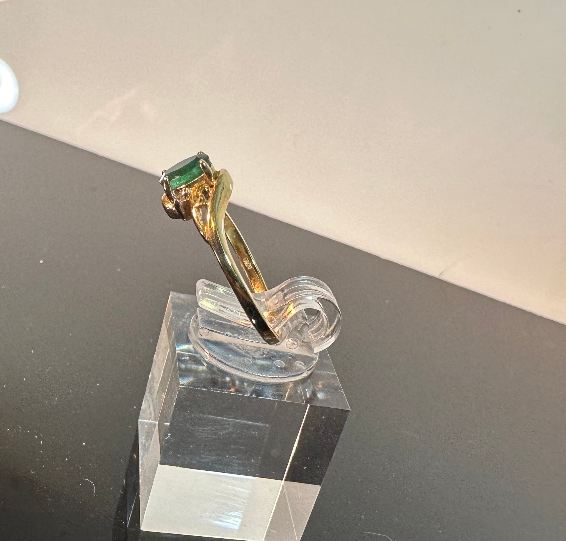 This stunning emerald ring features a beautiful, deep green stone set in 10K gold, with 2 accent diamonds. The simple band adds a touch of elegance, while the .33 carat emerald provides a pop of color. With ADL (French for 10K) stamped inside, this ring is perfect for any occasion. Ring size 6 1/2.