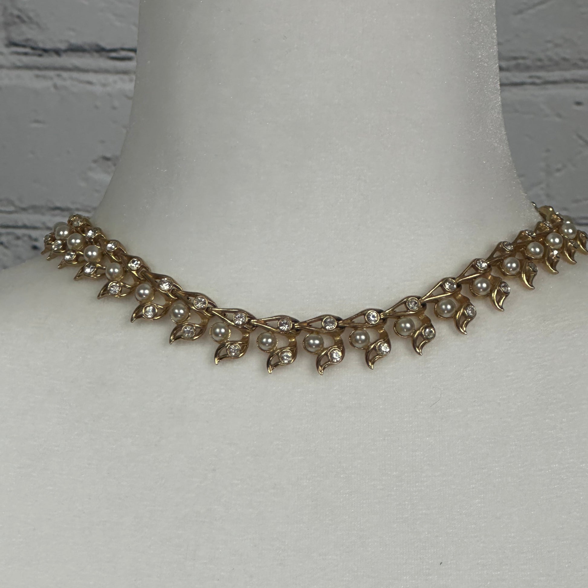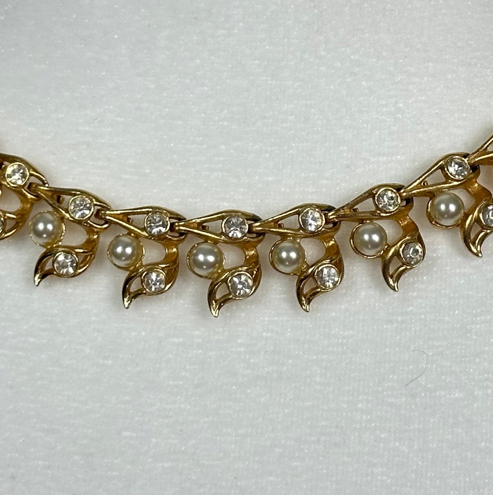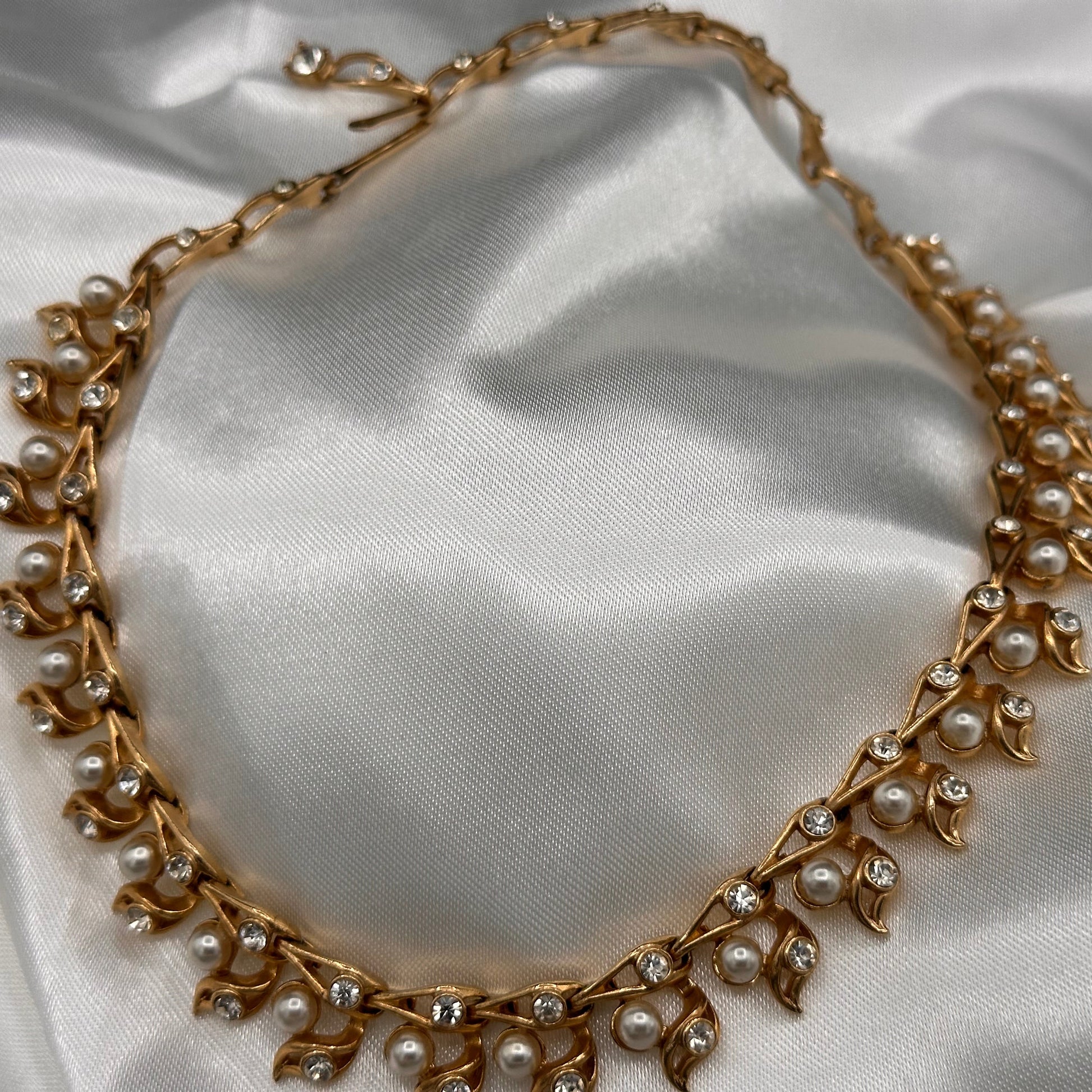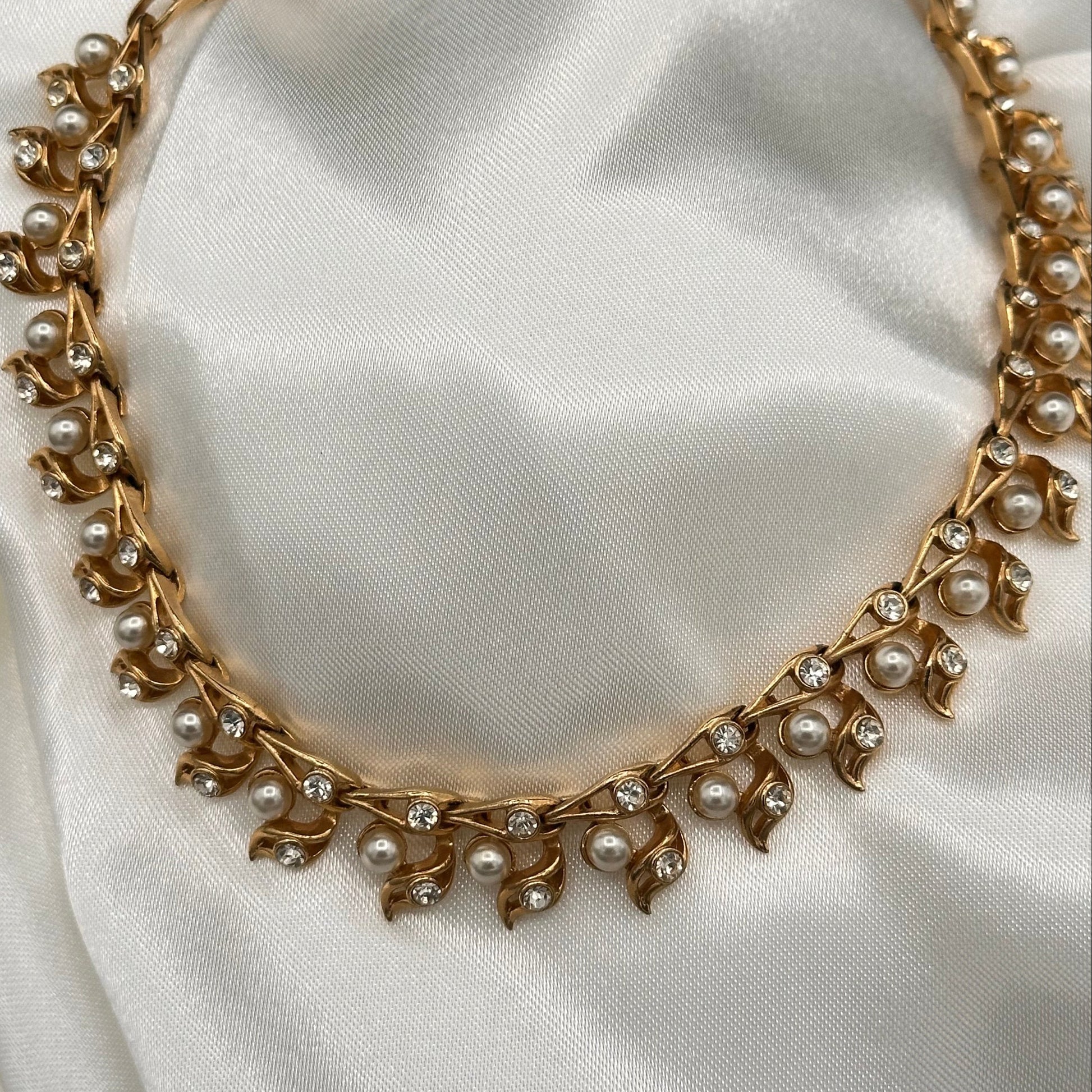 Beautiful and noticeable necklace. Gold tone with pearls and crystals. I wore to an interview and got several compliments on it!! Measures 32 to 42 cm (depends on where you fasten the hook. Unmarked- pristine condition with no missing stones or crystals 46.3 g