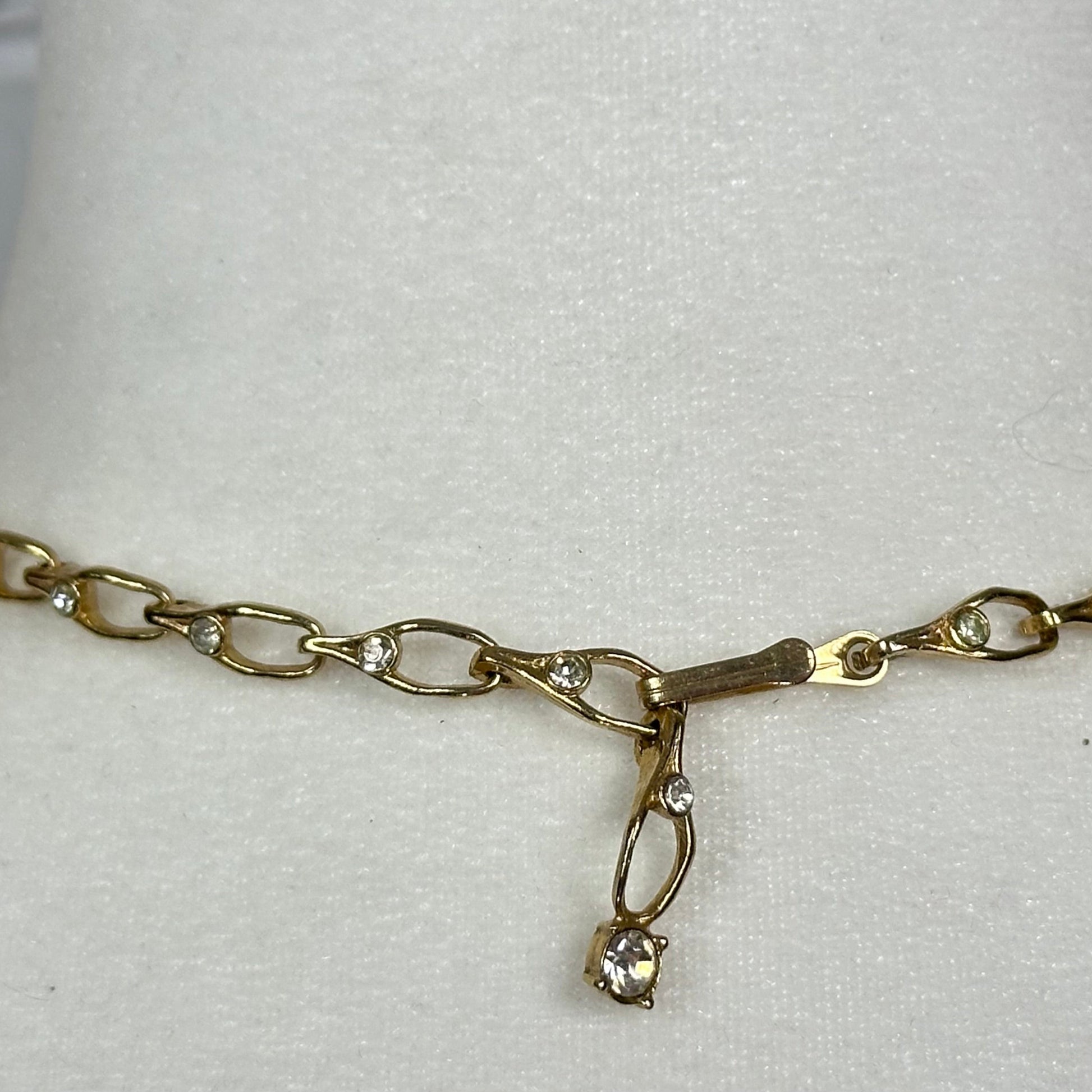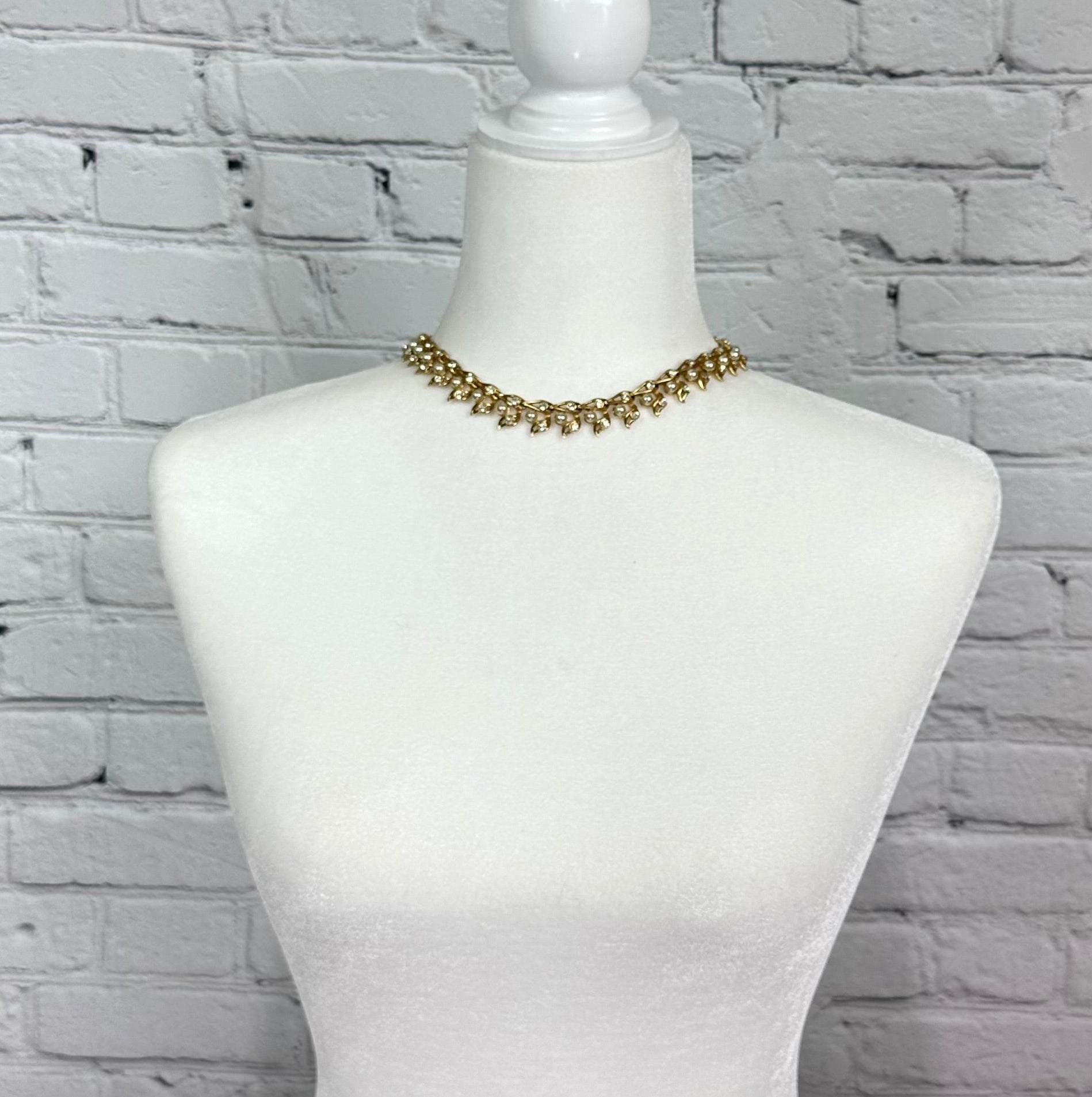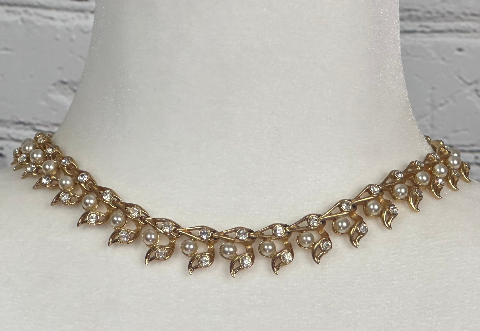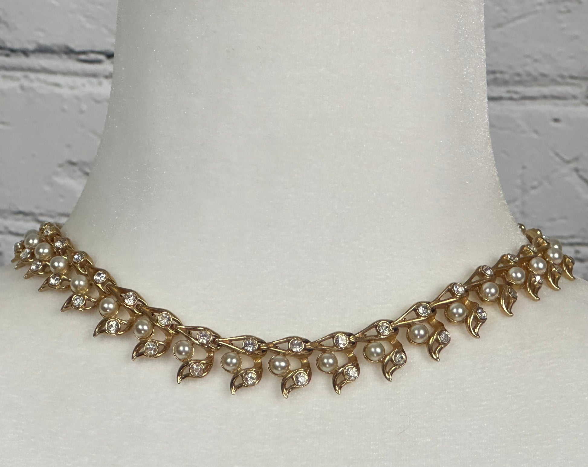 Beautiful and noticeable necklace. Gold tone with pearls and crystals. I wore to an interview and got several compliments on it!! Measures 32 to 42 cm (depends on where you fasten the hook. Unmarked- pristine condition with no missing stones or crystals 46.3 g