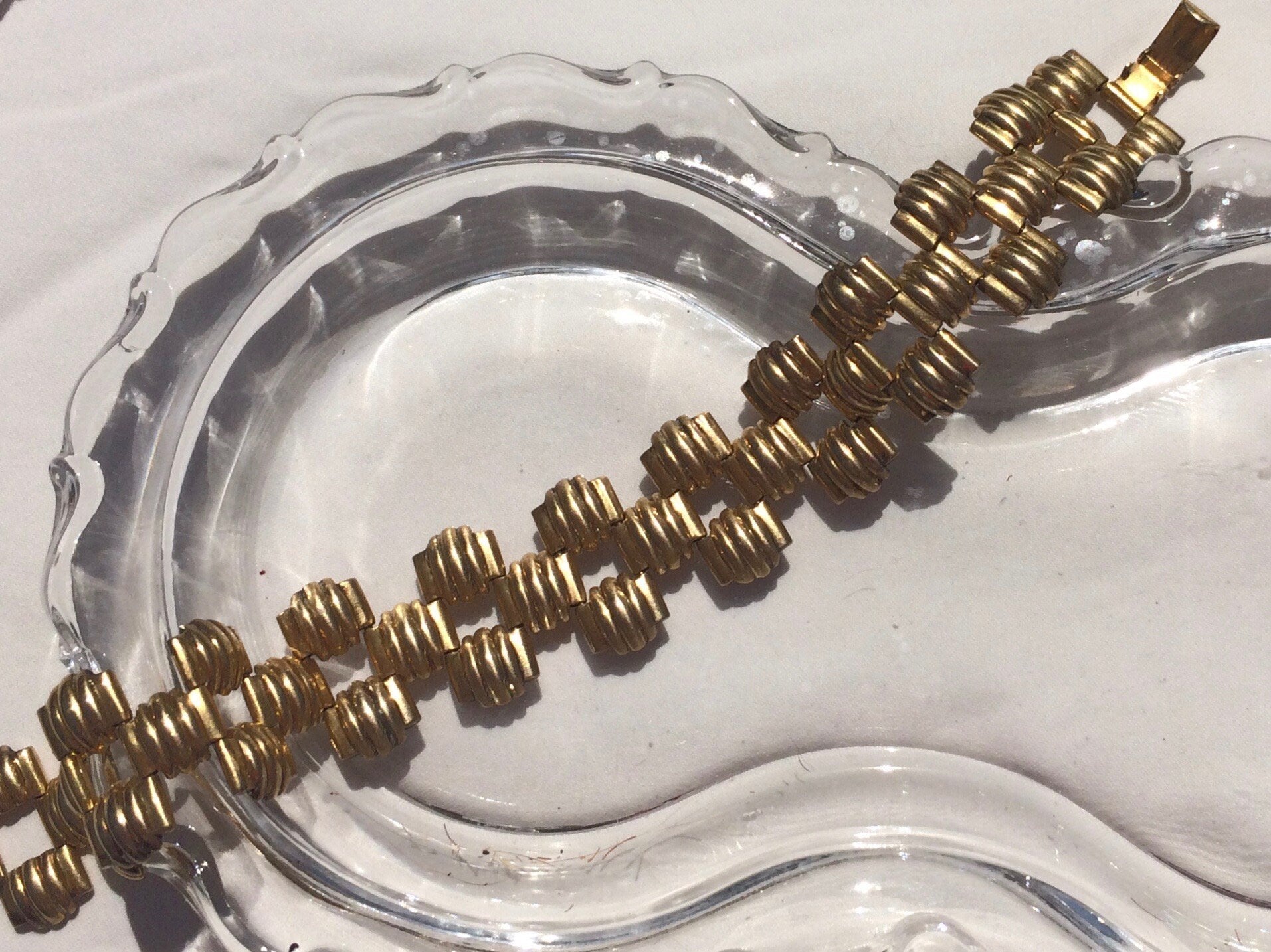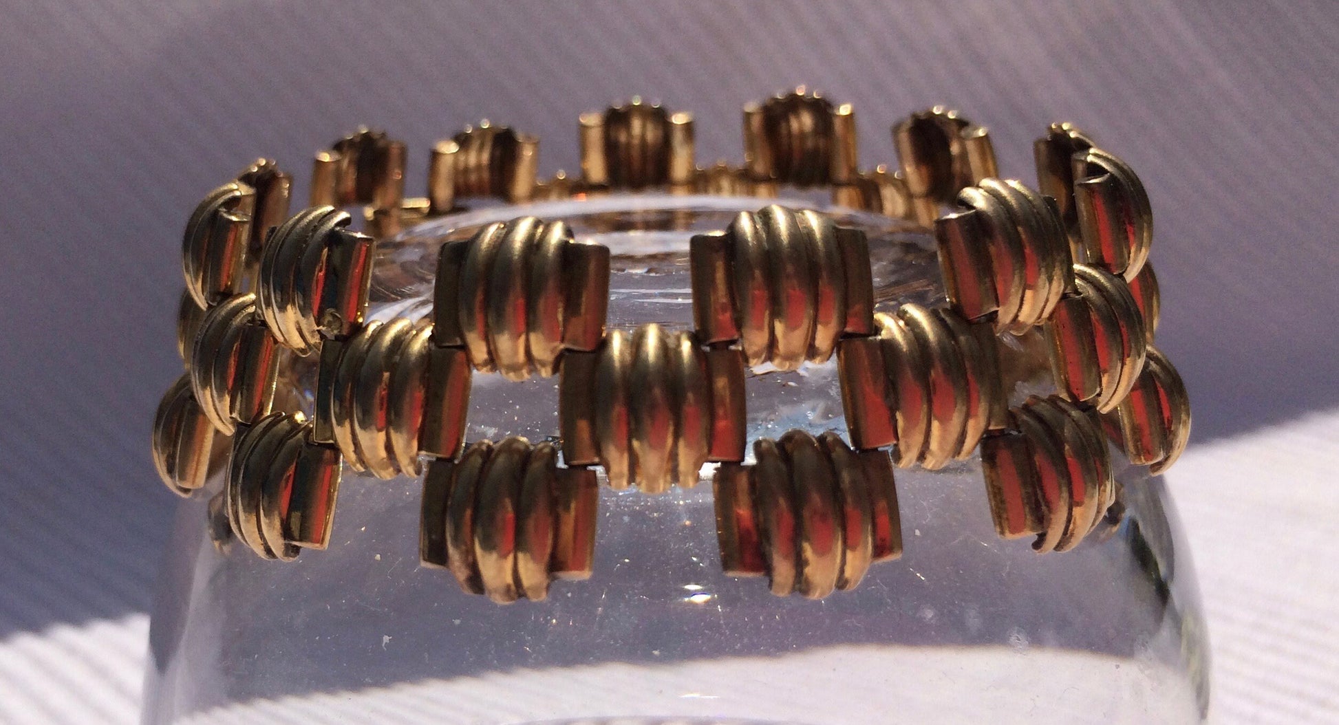 The bracelet itself is composed of 13 rows of alternating ribbed gold plated links.