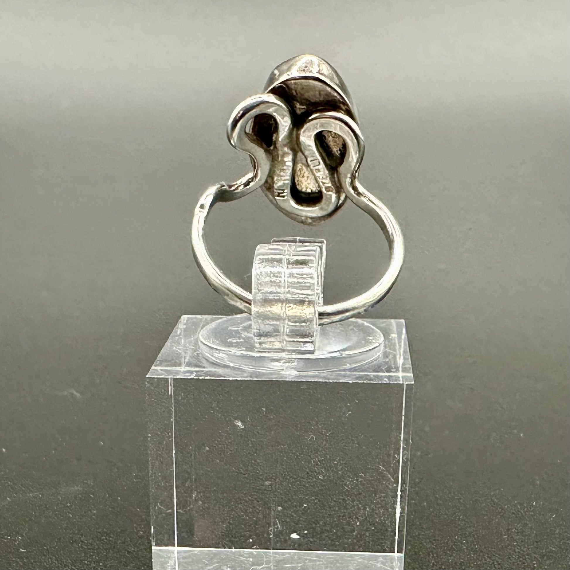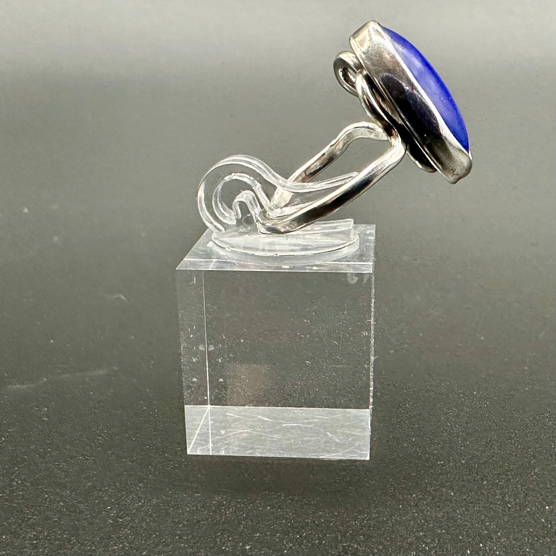 A stunning mix of sterling silver and oblong Lapis Lazuli, this hand wrought ring is perfect for those who love the color blue or appreciate unique jewelry. Weighing in at 3.75 gr, this size 5.5 ring is marked with Sterling and a mysterious maker's mark. Add a touch of intrigue to your everyday look with this beautiful ring.