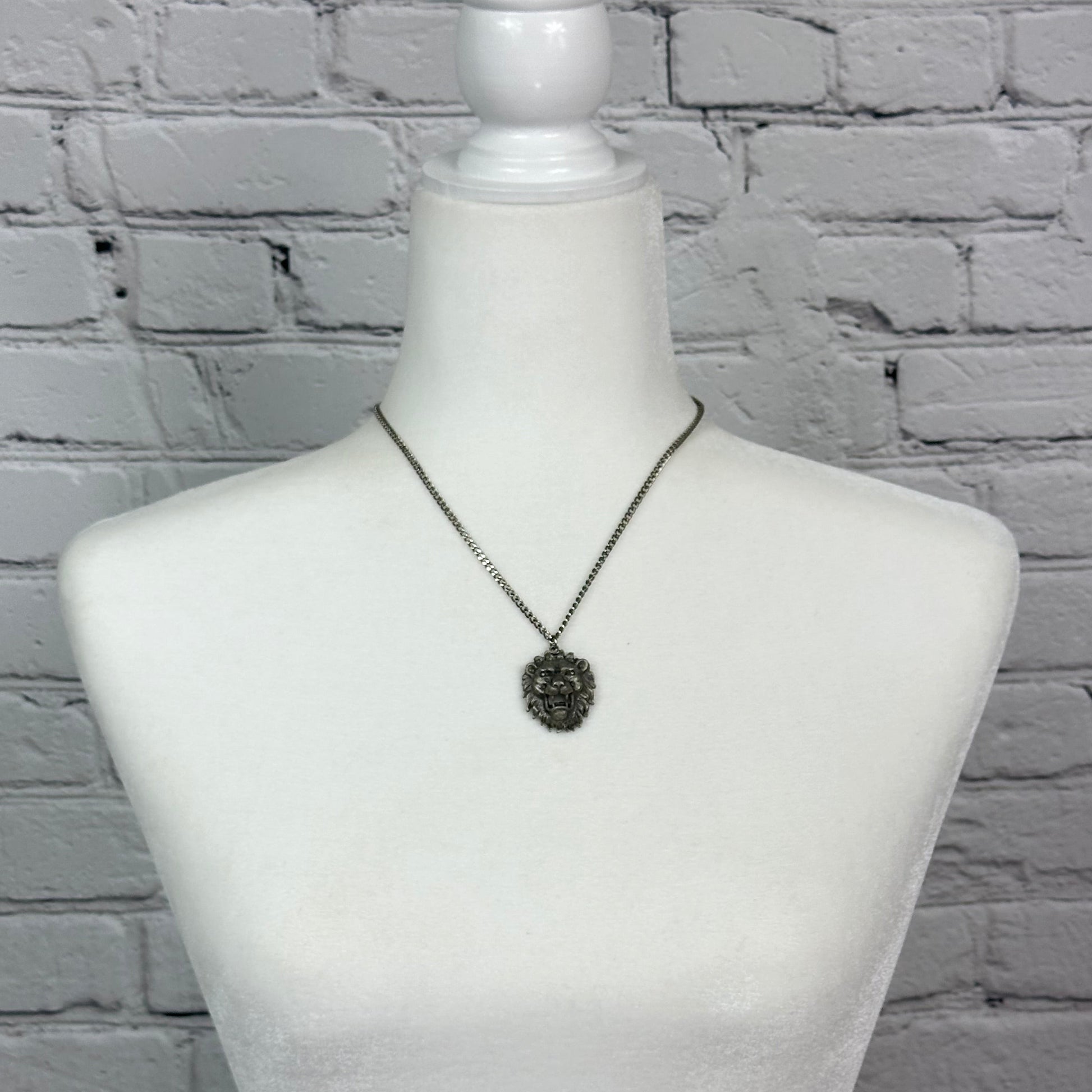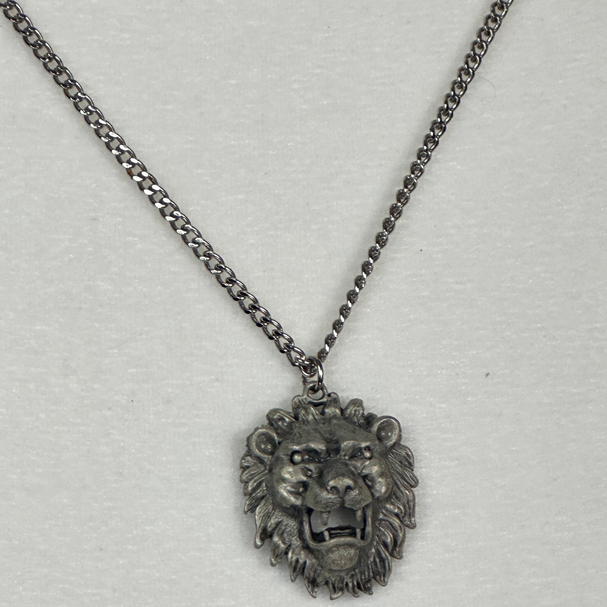 This Pewter Lions Head Pendant on Steel Chain features a 3D design of a fierce lion's face, with a slightly opened mouth. The pendant measures 1 inch by 1 3/8 inches and comes on a durable 18 inch steel chain. Upgrade your style with this bold and expertly crafted pendant.