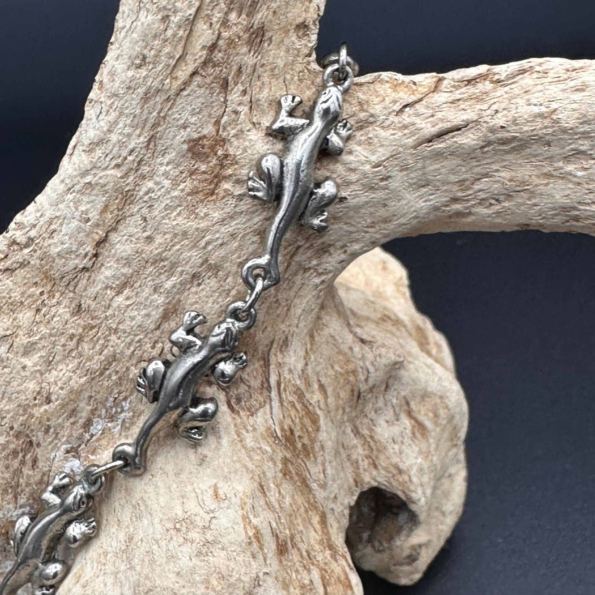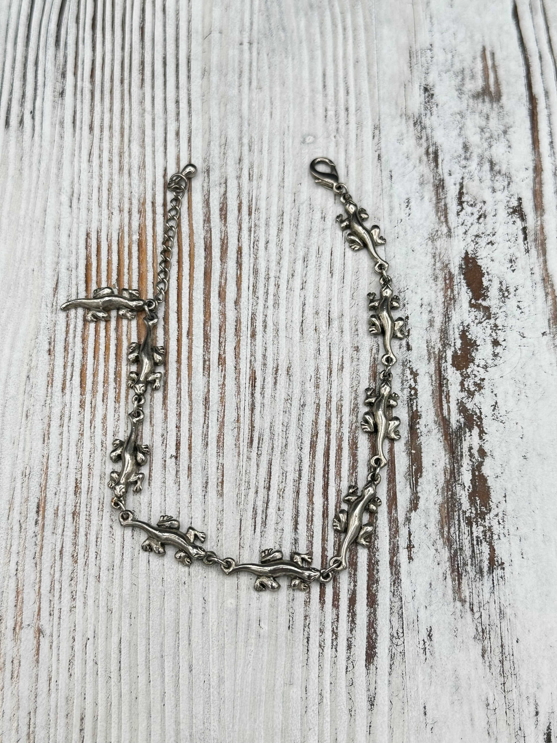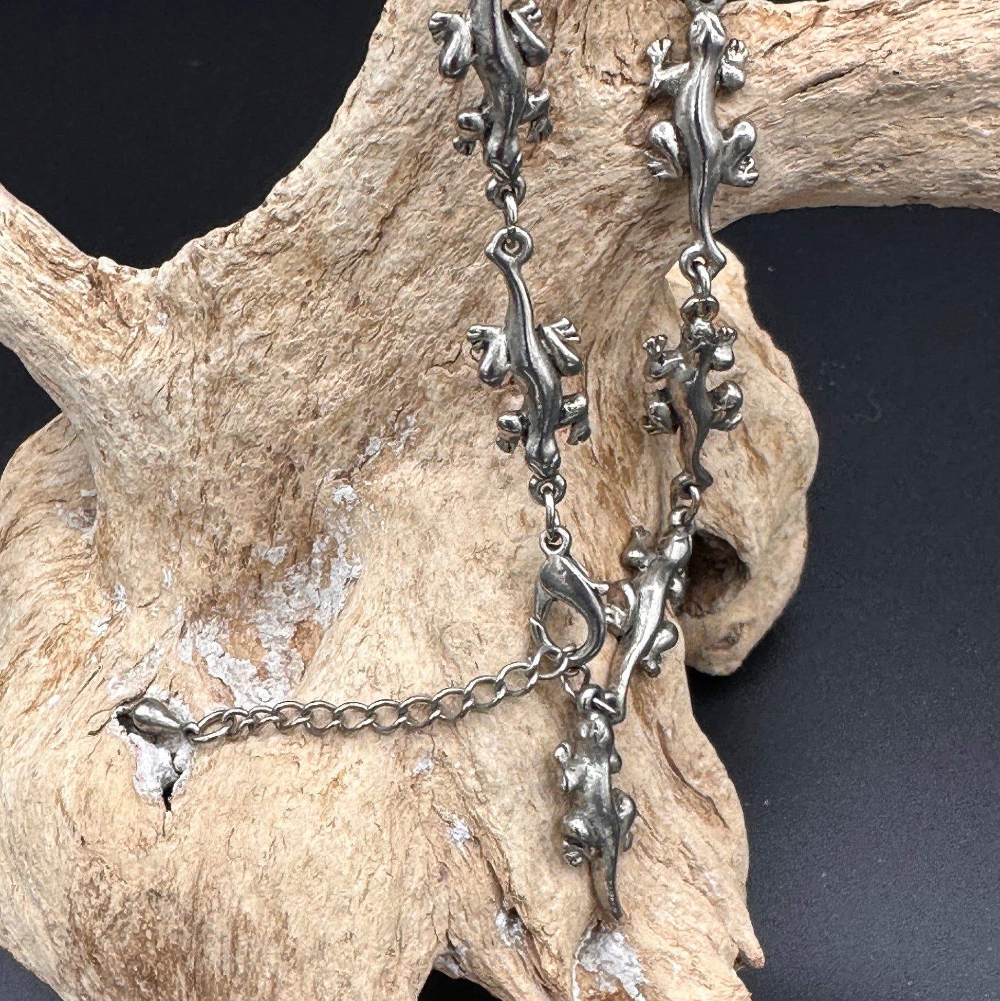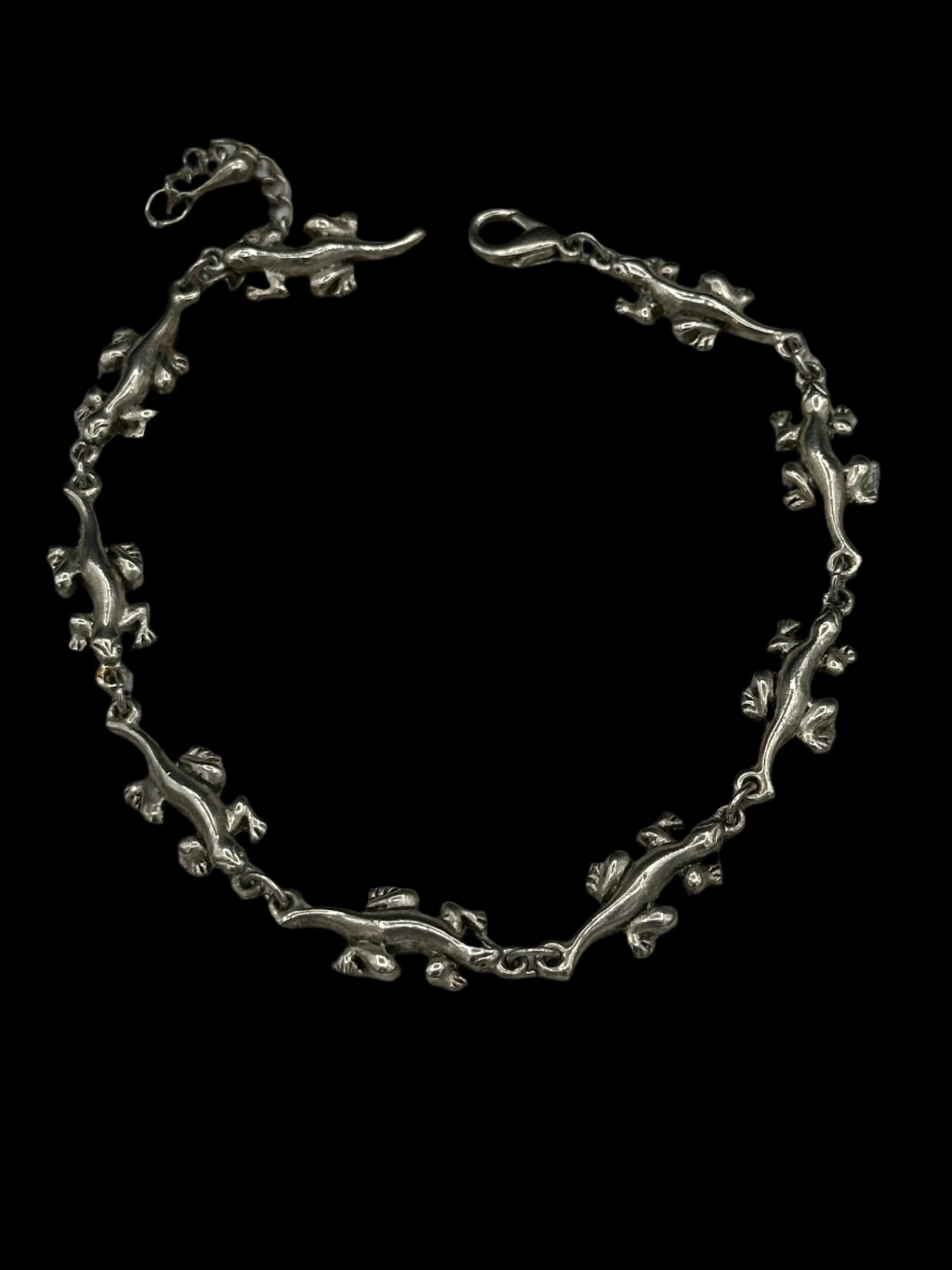 This Reptile Bracelet/Anklet features a silver plated chain of repeating reptile links. It has an adjustable to a length of 9-10 inches. Its sleek design lacks any makers mark or metal stamp, making it a subtle yet stylish accessory suitable for any outfit.