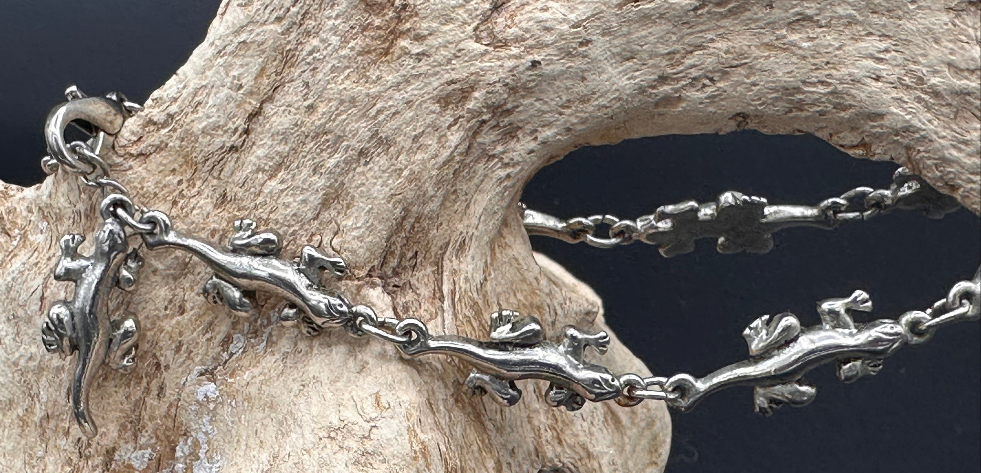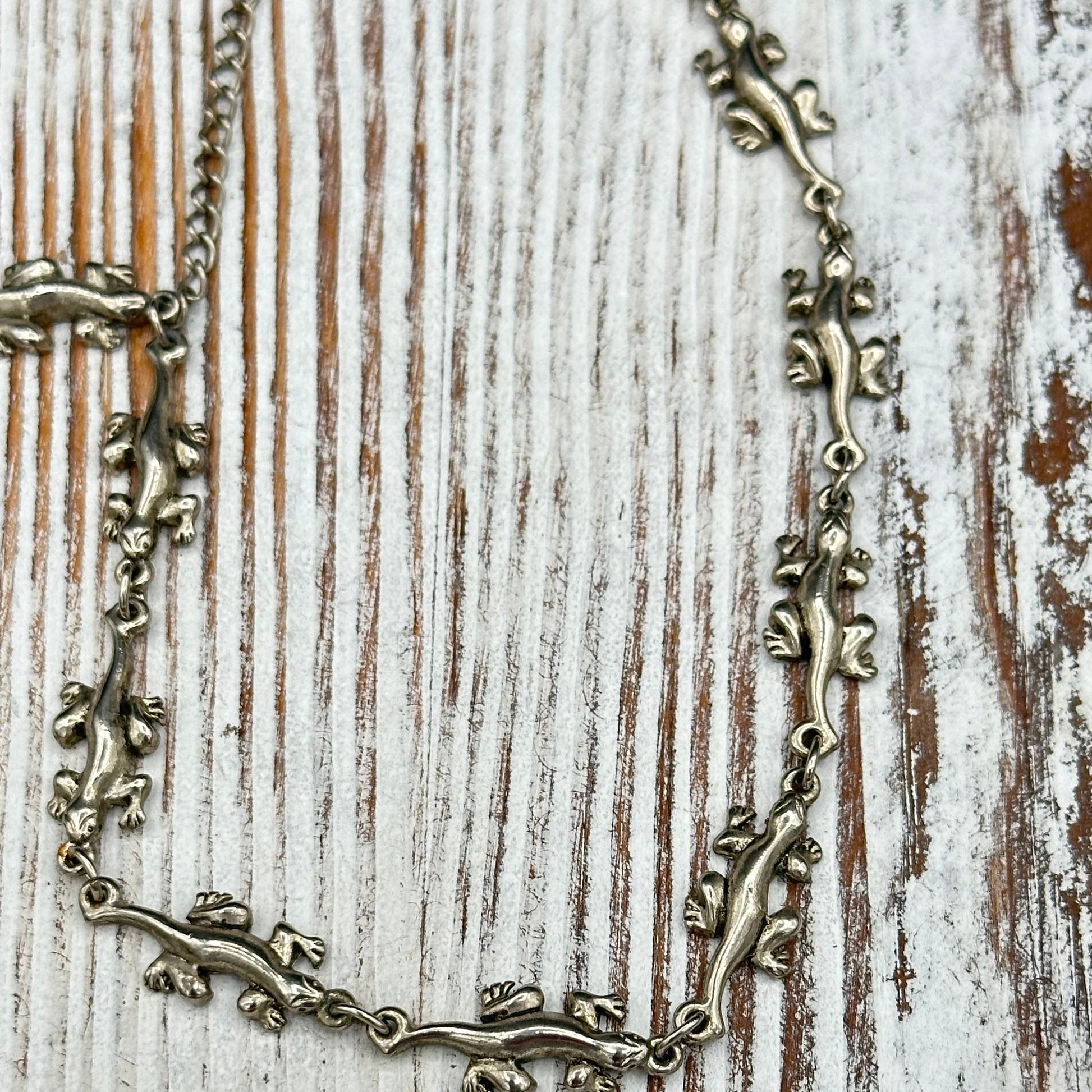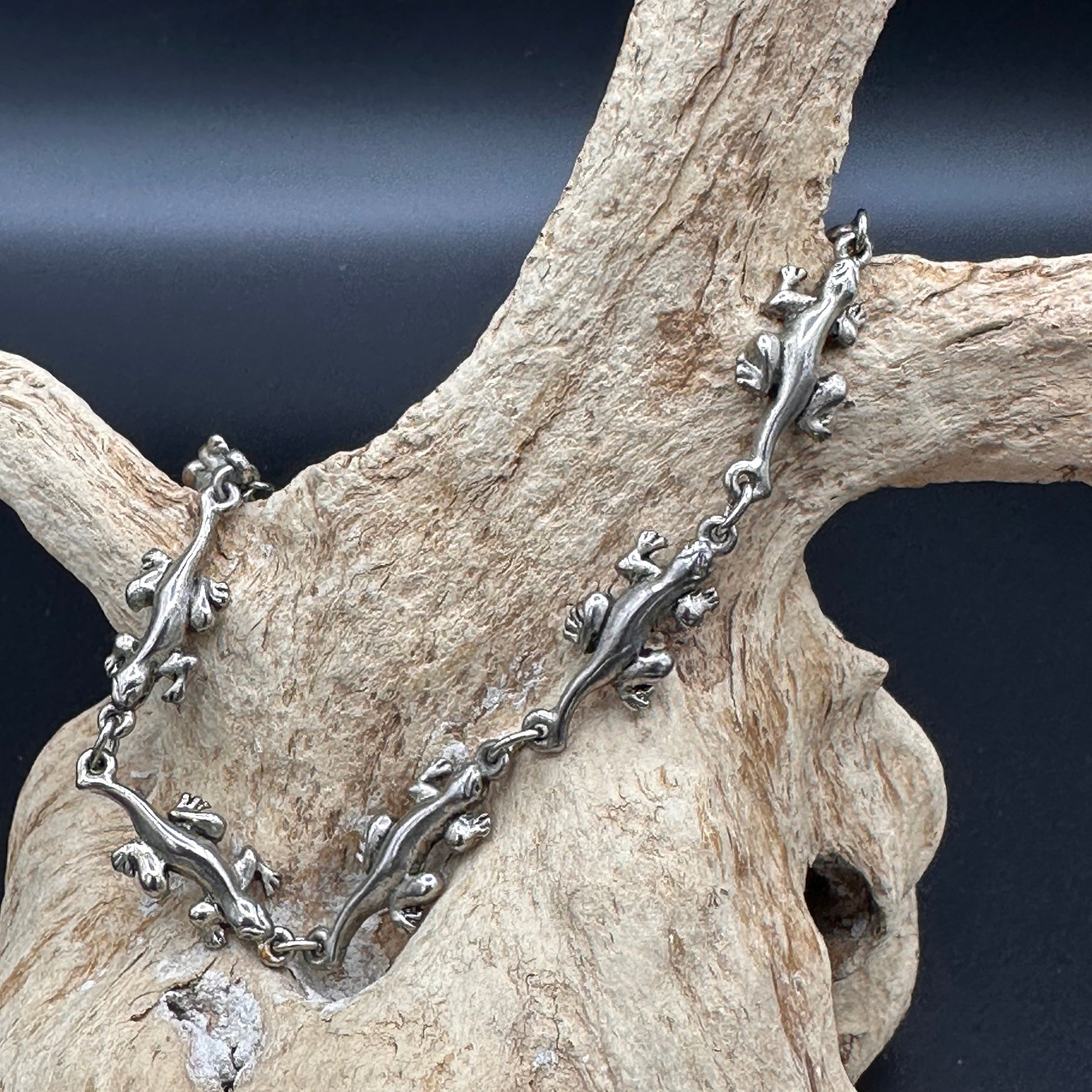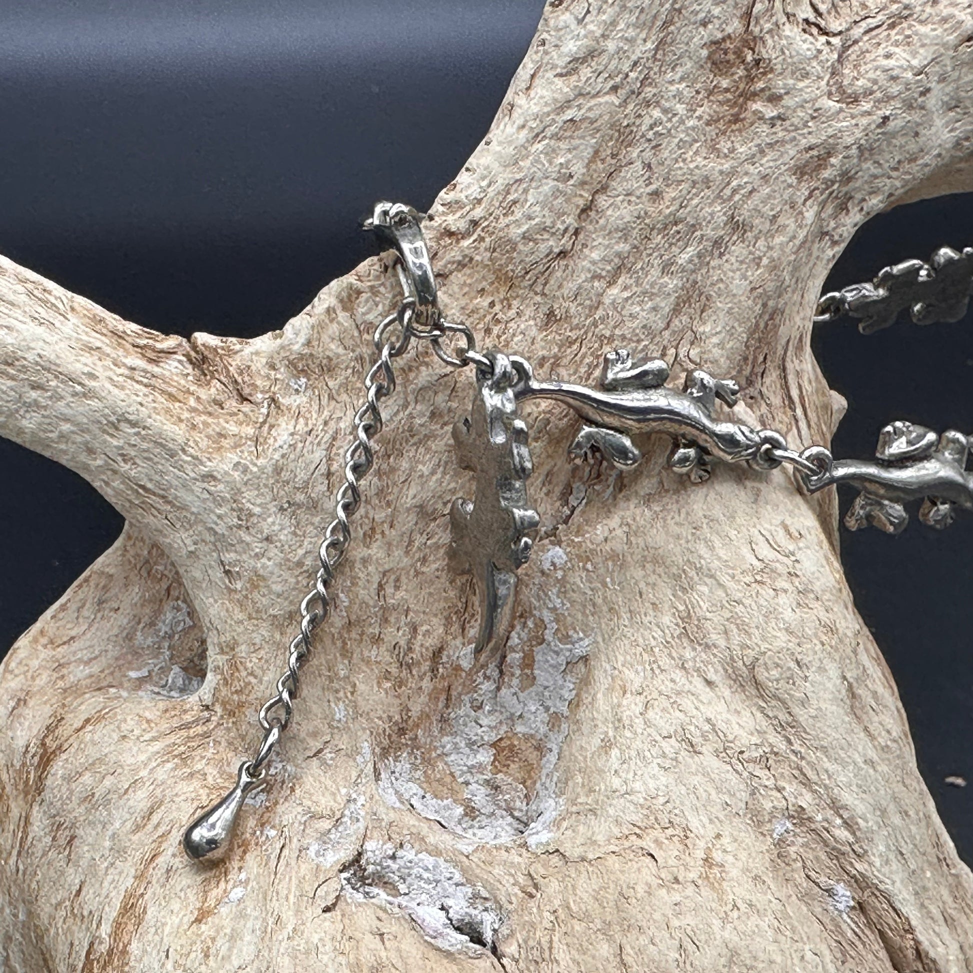This Reptile Bracelet/Anklet features a silver plated chain of repeating reptile links. It has an adjustable to a length of 9-10 inches. Its sleek design lacks any makers mark or metal stamp, making it a subtle yet stylish accessory suitable for any outfit.