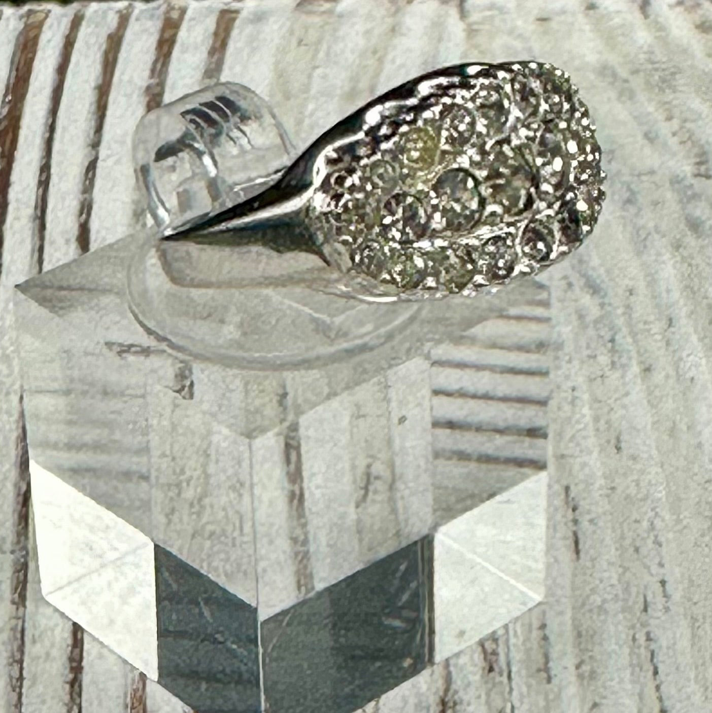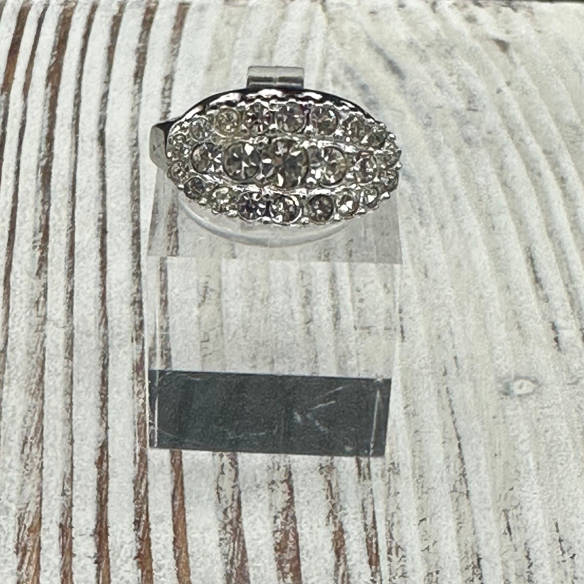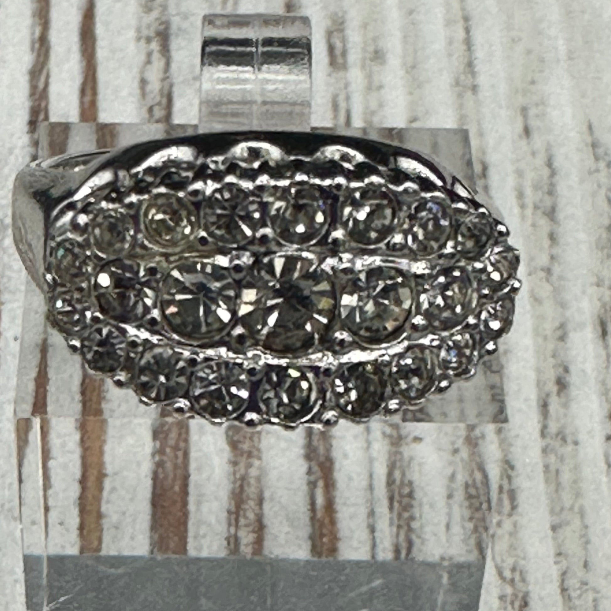 Rhodium plated sterling silver ring with 3 rows of Rhinestones! A fun ring for a fun night! Size 6 Marked Rhodium Electroplate and an unknown Maker's mark. TGW 4.21. There is minor discoloration to one of the rhinestones.