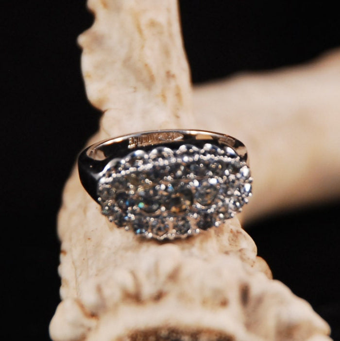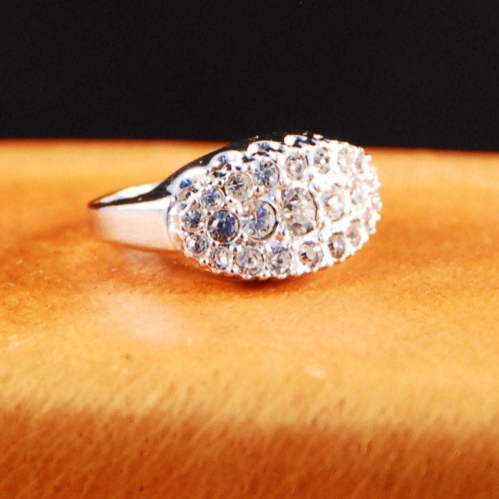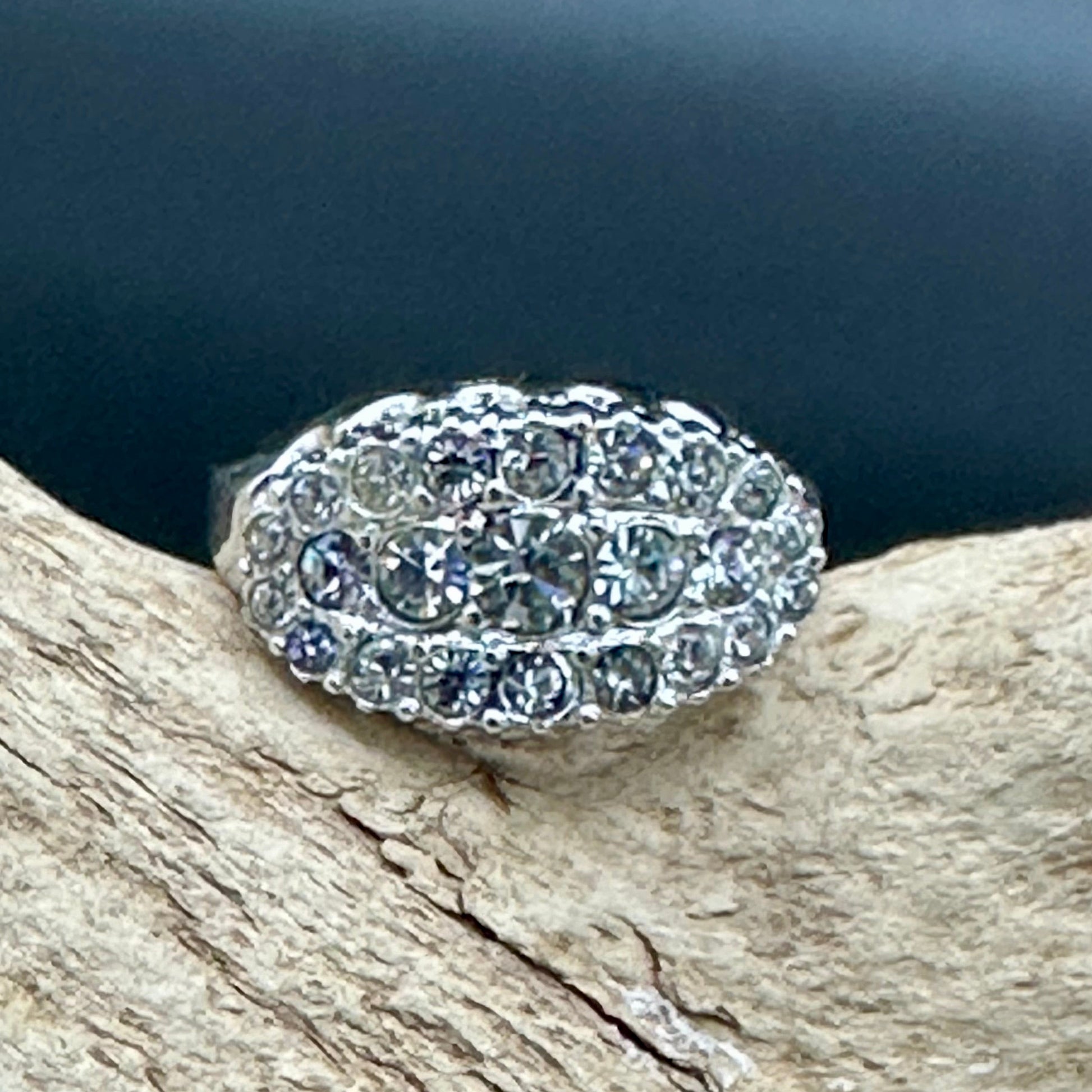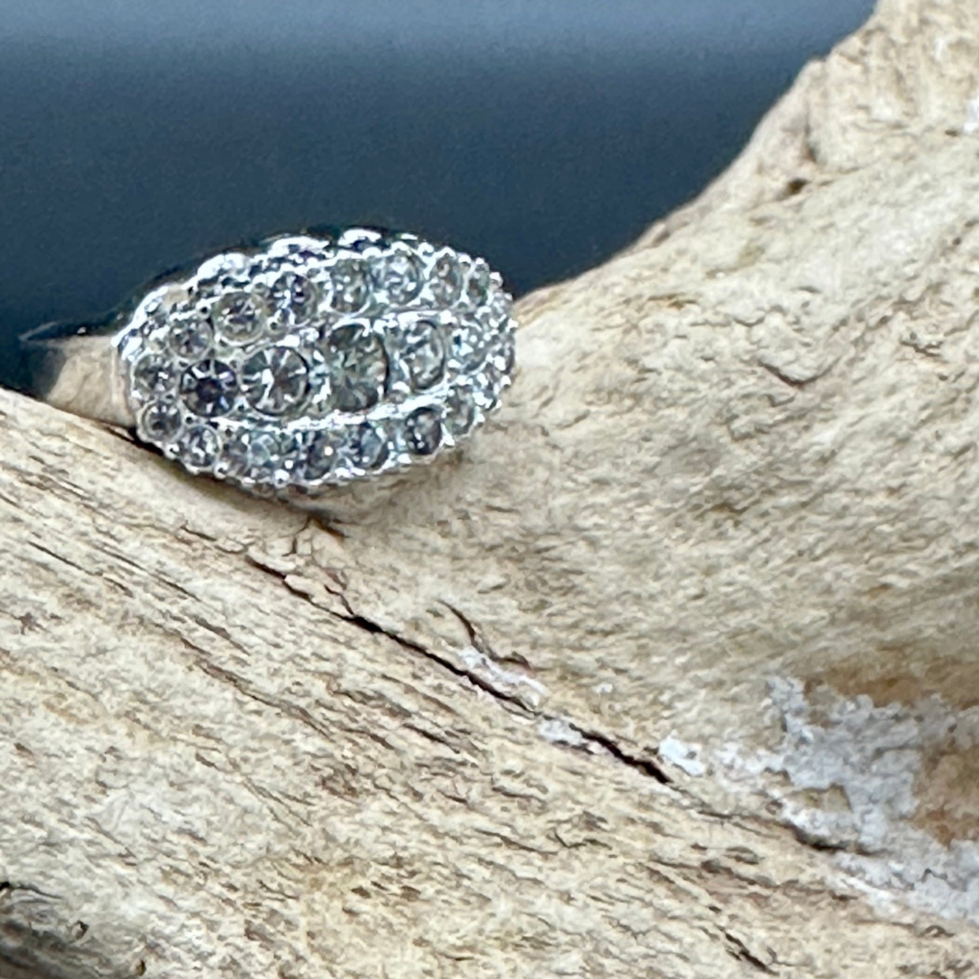 Rhodium plated sterling silver ring with 3 rows of Rhinestones! A fun ring for a fun night! Size 6 Marked Rhodium Electroplate and an unknown Maker's mark. TGW 4.21. There is minor discoloration to one of the rhinestones.