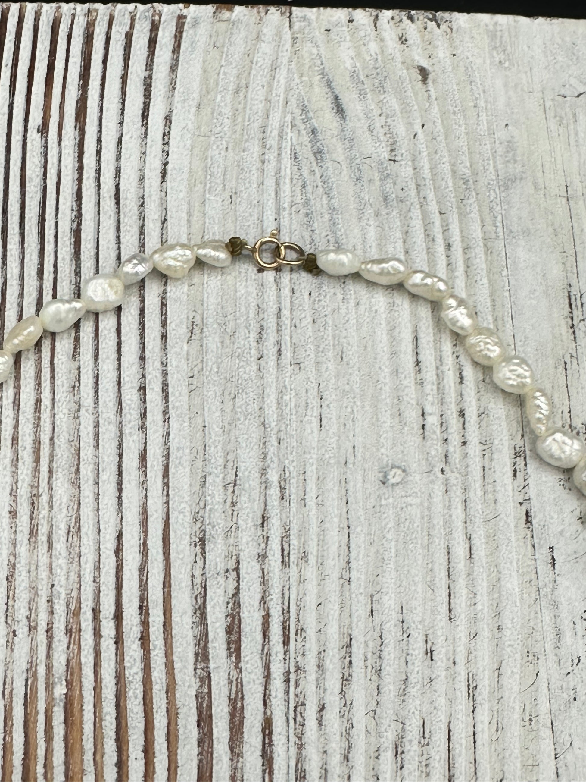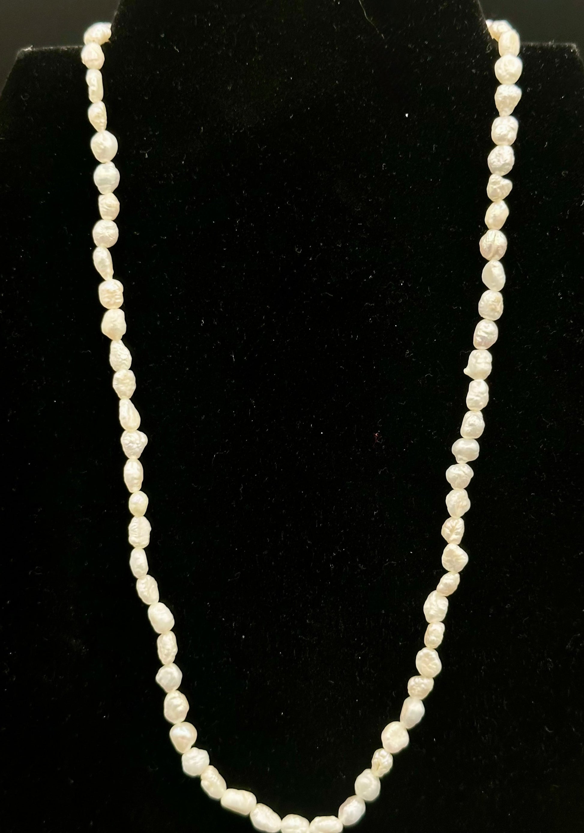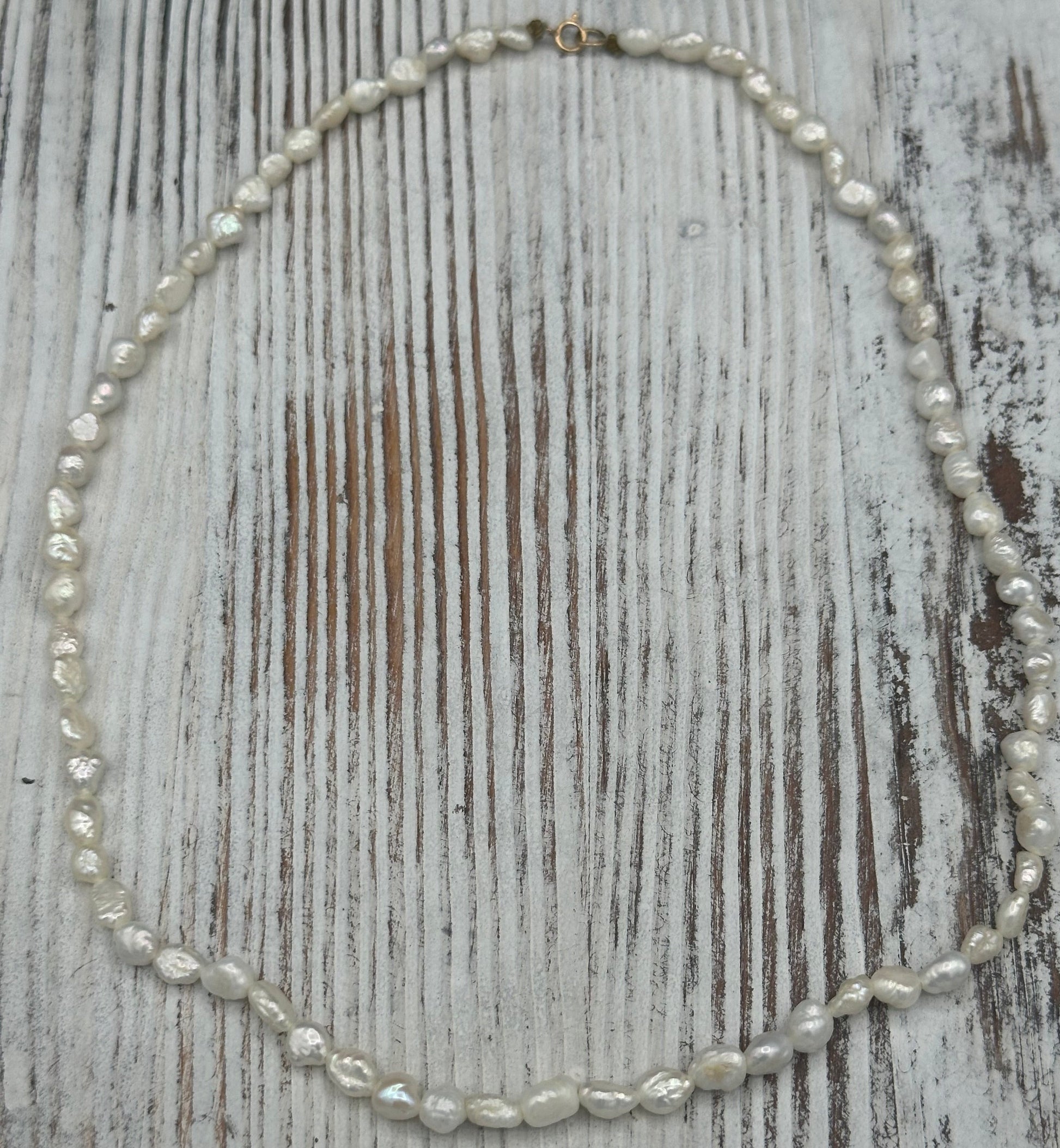 This is a beautiful yet simple 18 inch long necklace/strand of rice pearls. Strung on a silk cord, the pearls and a beautiful creamy white color. The necklace weighs 0.6 oz and closes with a marked 14K gold spring ring clasp. It is classic piece that is sure to never go out of style