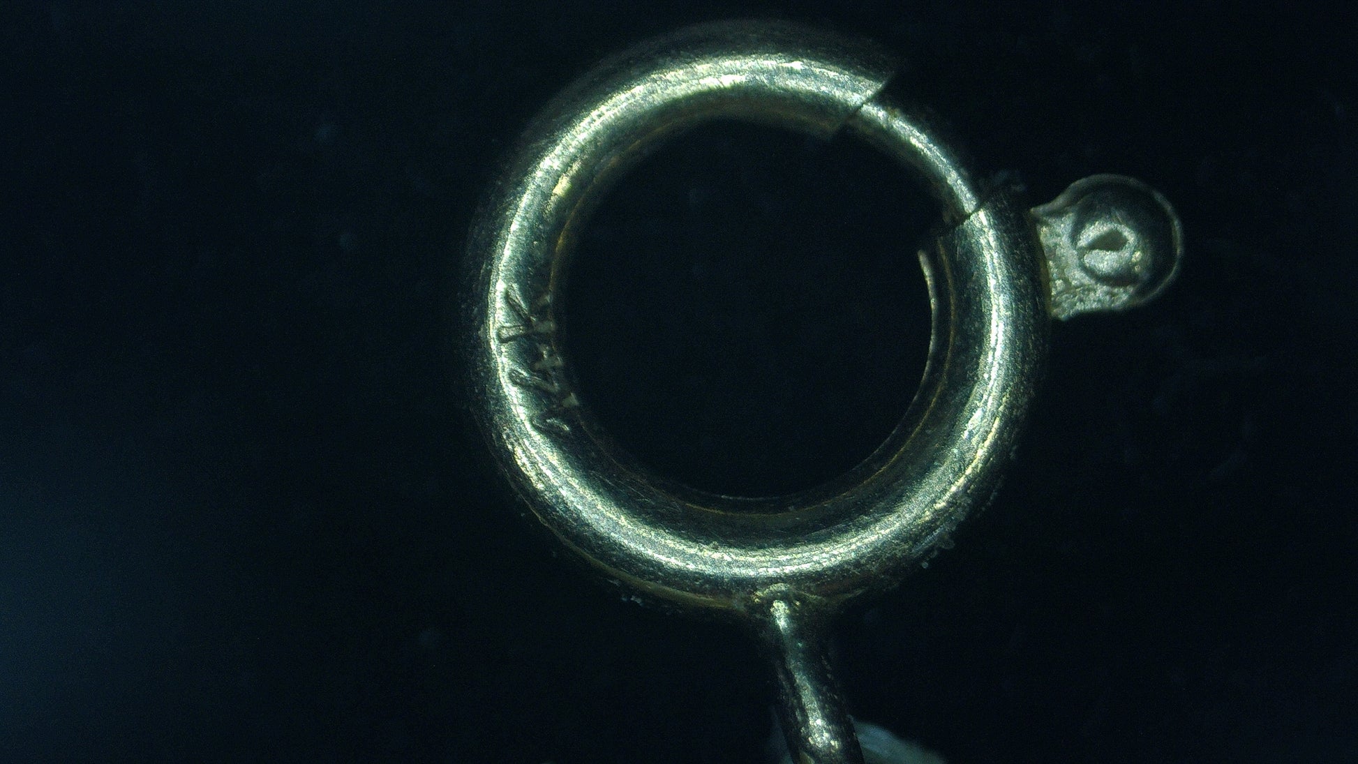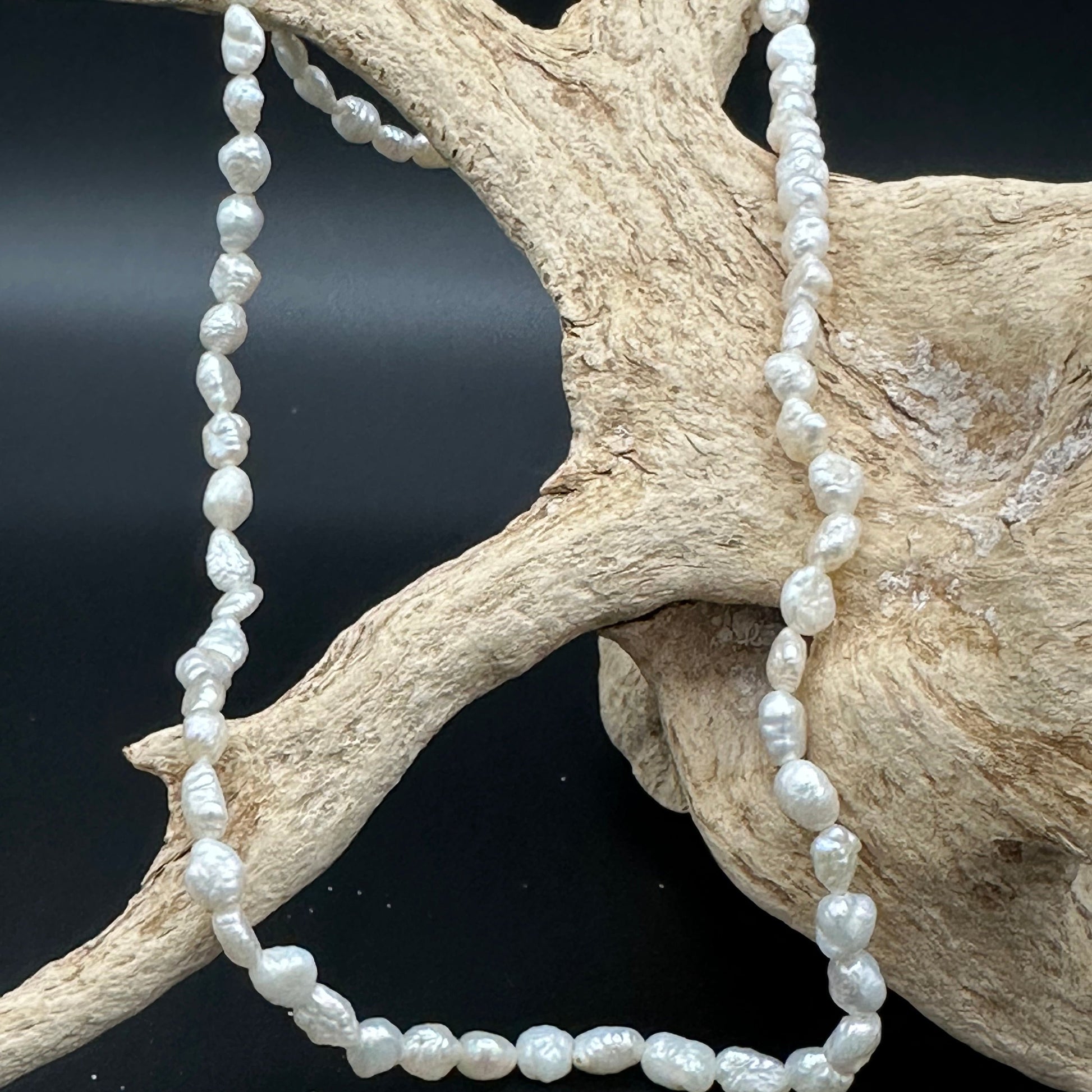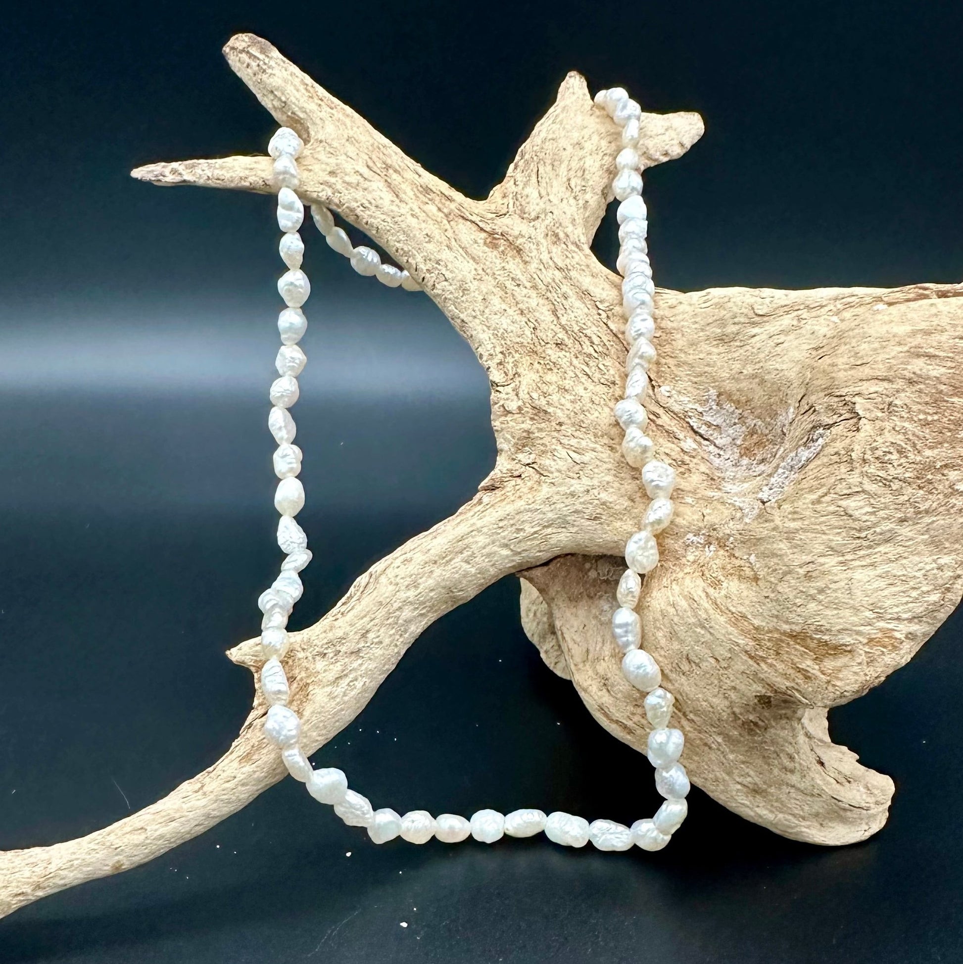 This is a beautiful yet simple 18 inch long necklace/strand of rice pearls. Strung on a silk cord, the pearls and a beautiful creamy white color. The necklace weighs 0.6 oz and closes with a marked 14K gold spring ring clasp. It is classic piece that is sure to never go out of style