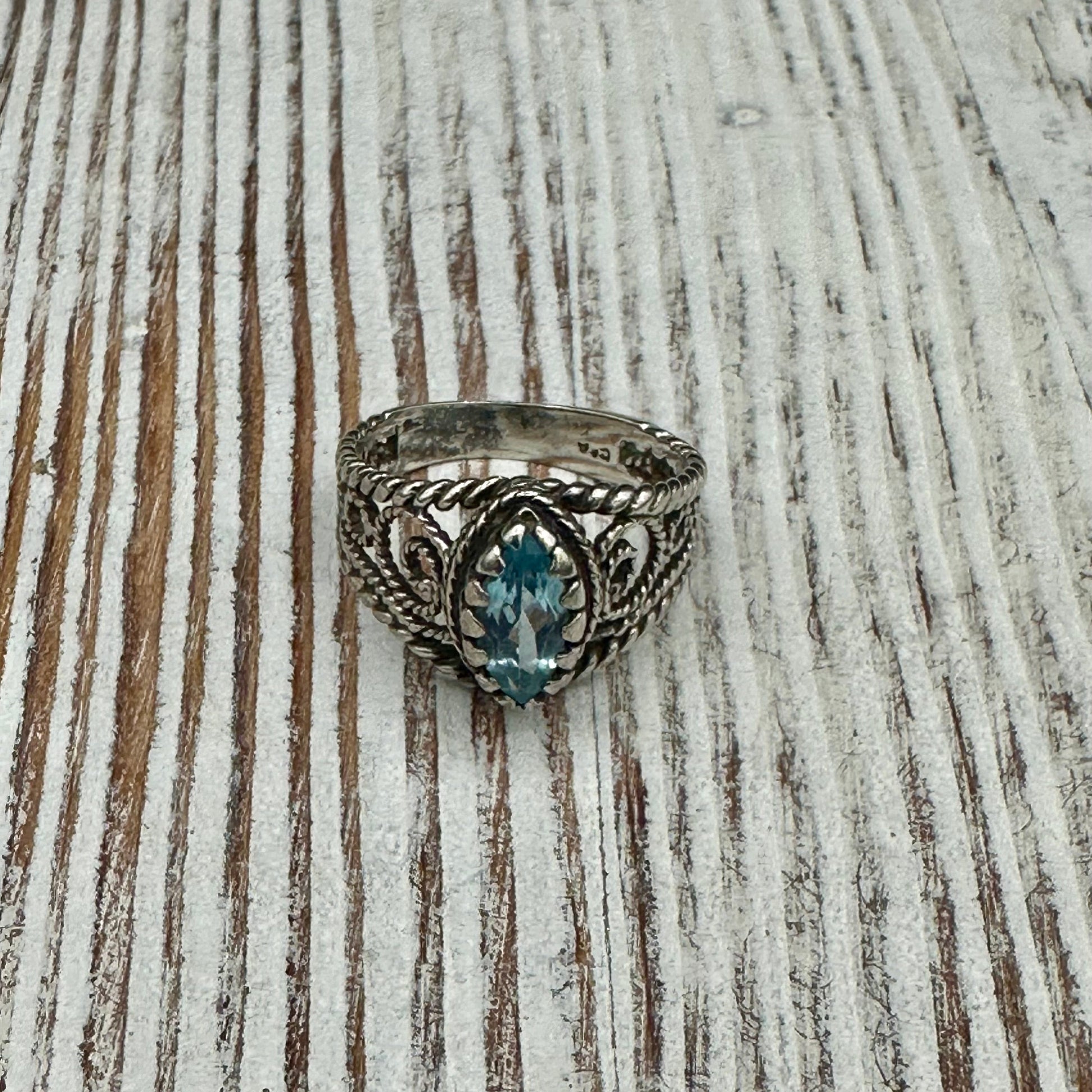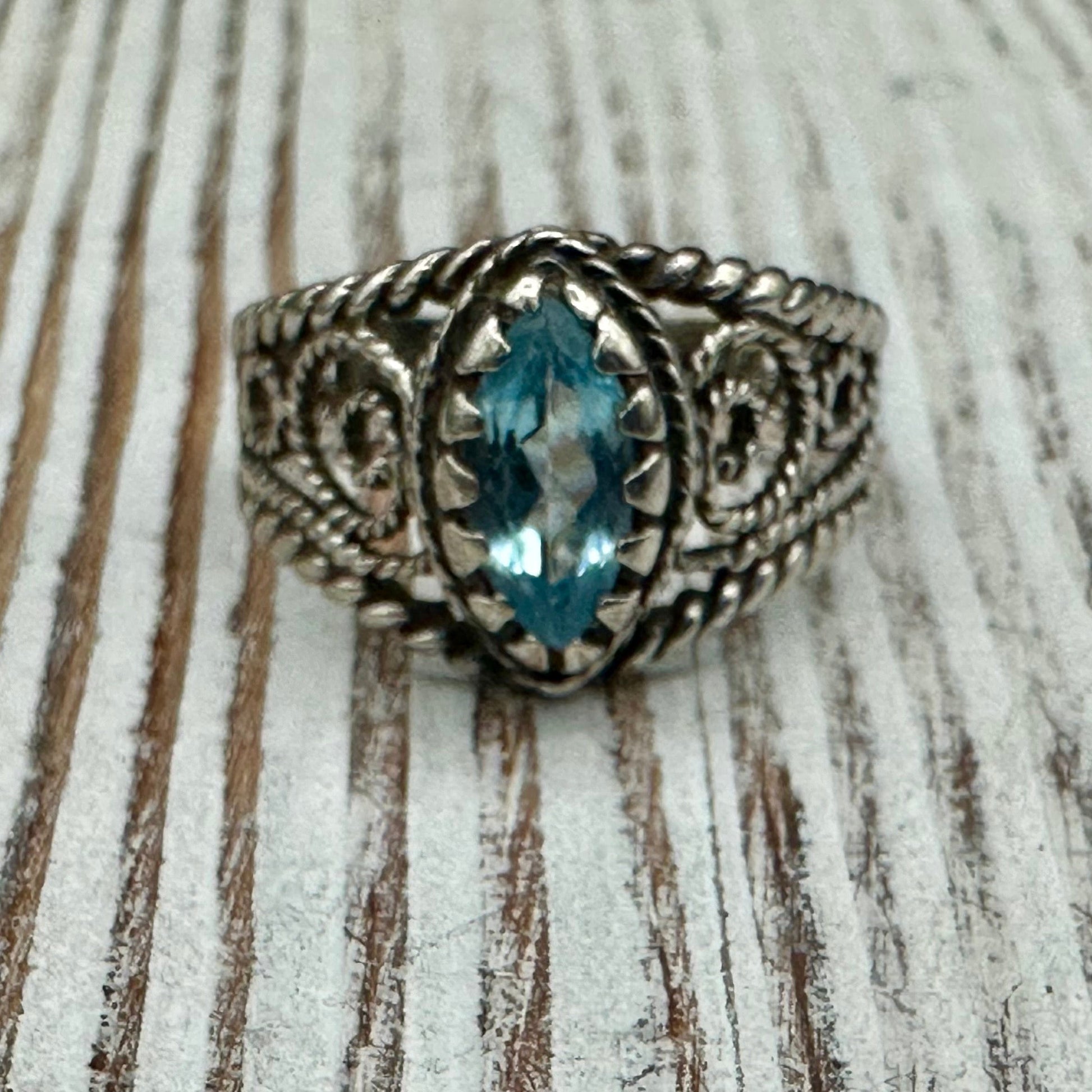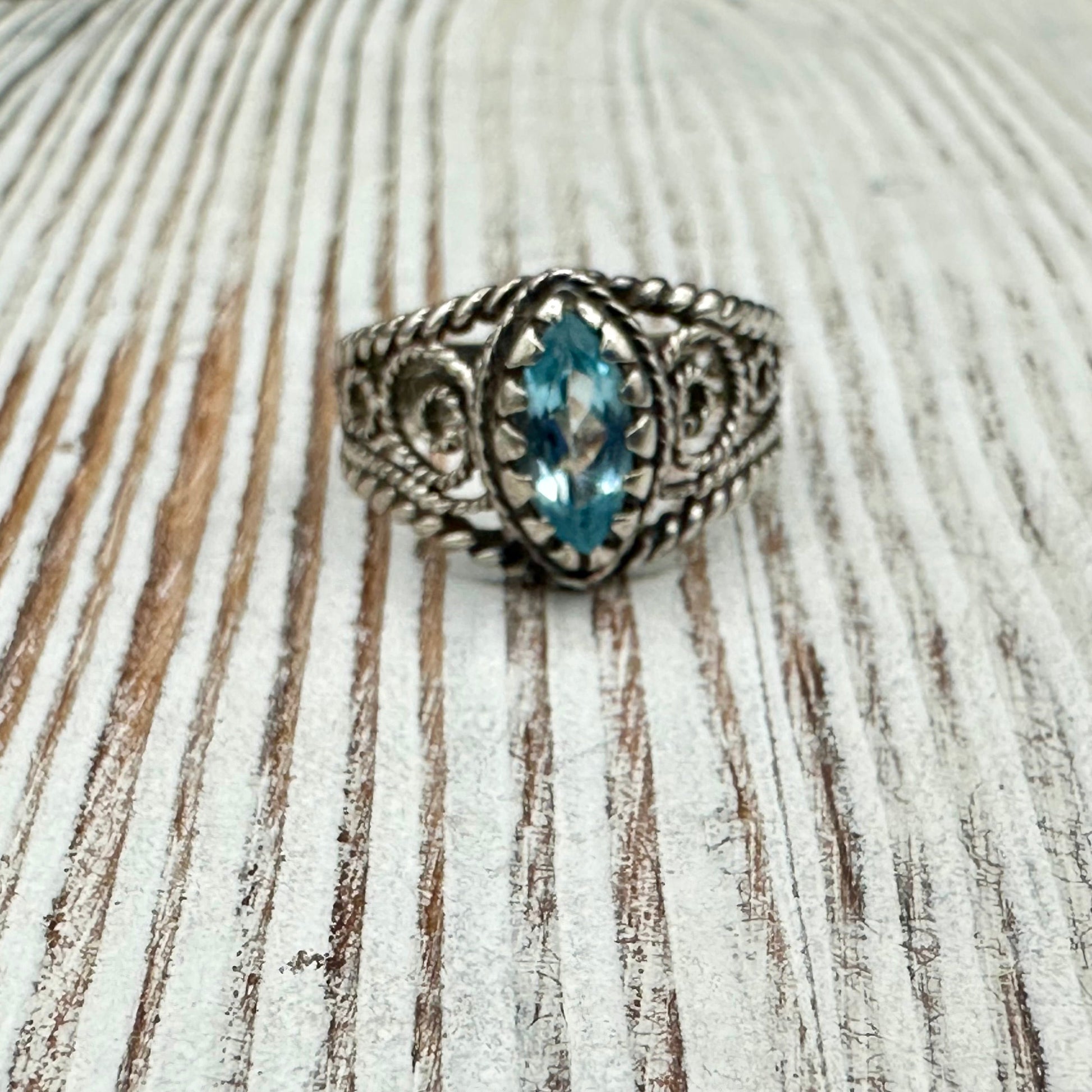 Crafted with a striking blue topaz gemstone set in twisted sterling silver, this ring evokes a country aesthetic. The marquise cut blue topaz measures 0.5 inches and is stamped with 925. With a total weight of 4.54 grams, and a ring size of 8.5 this expertly crafted piece is a must-have for any jewelry collection.