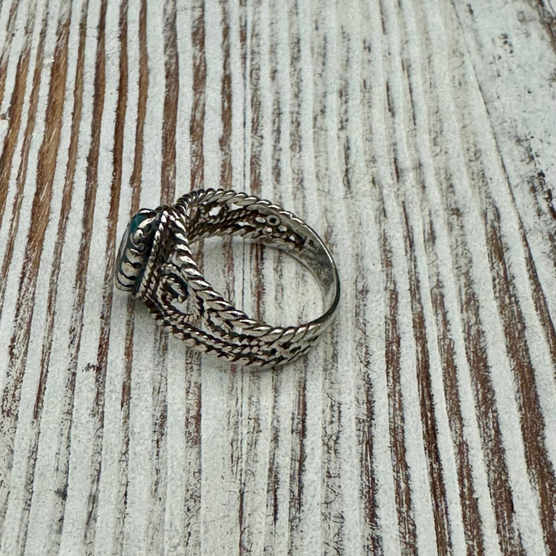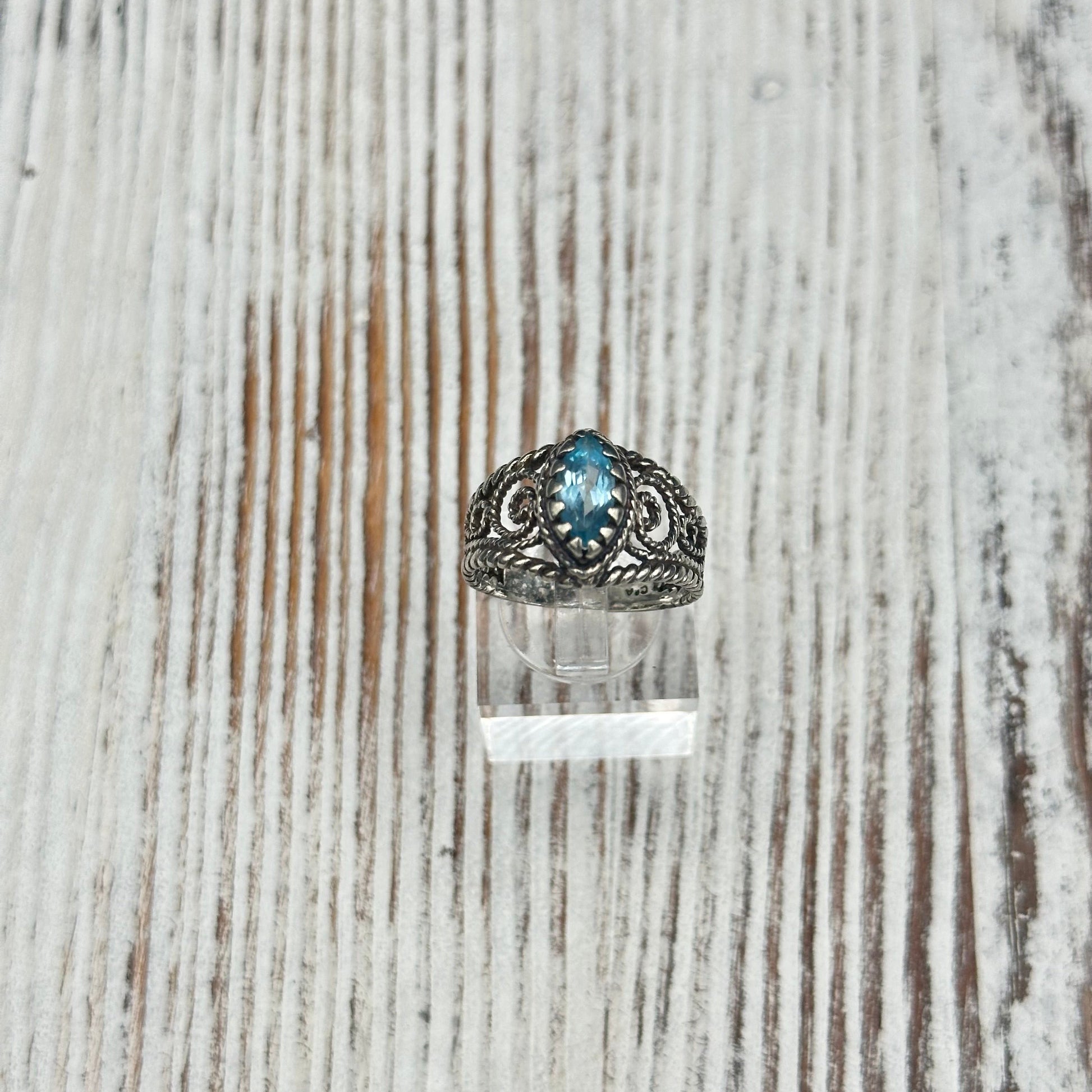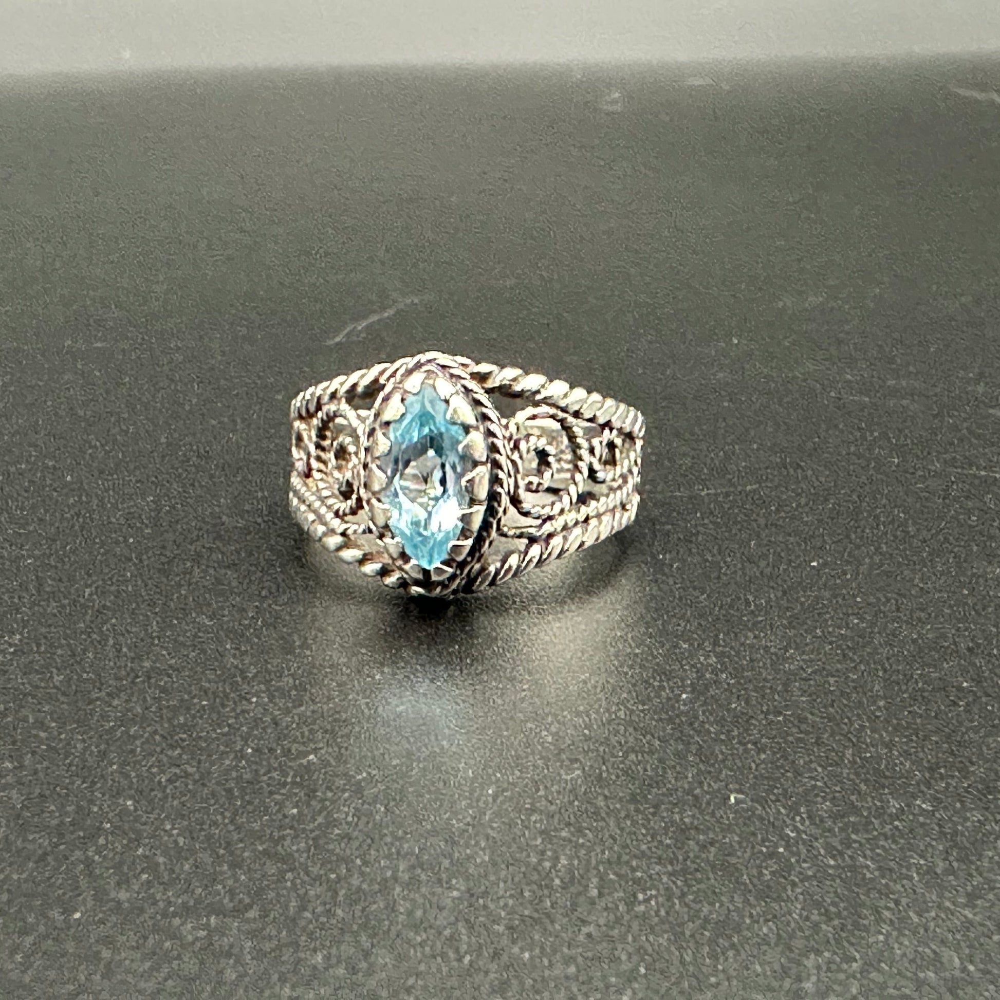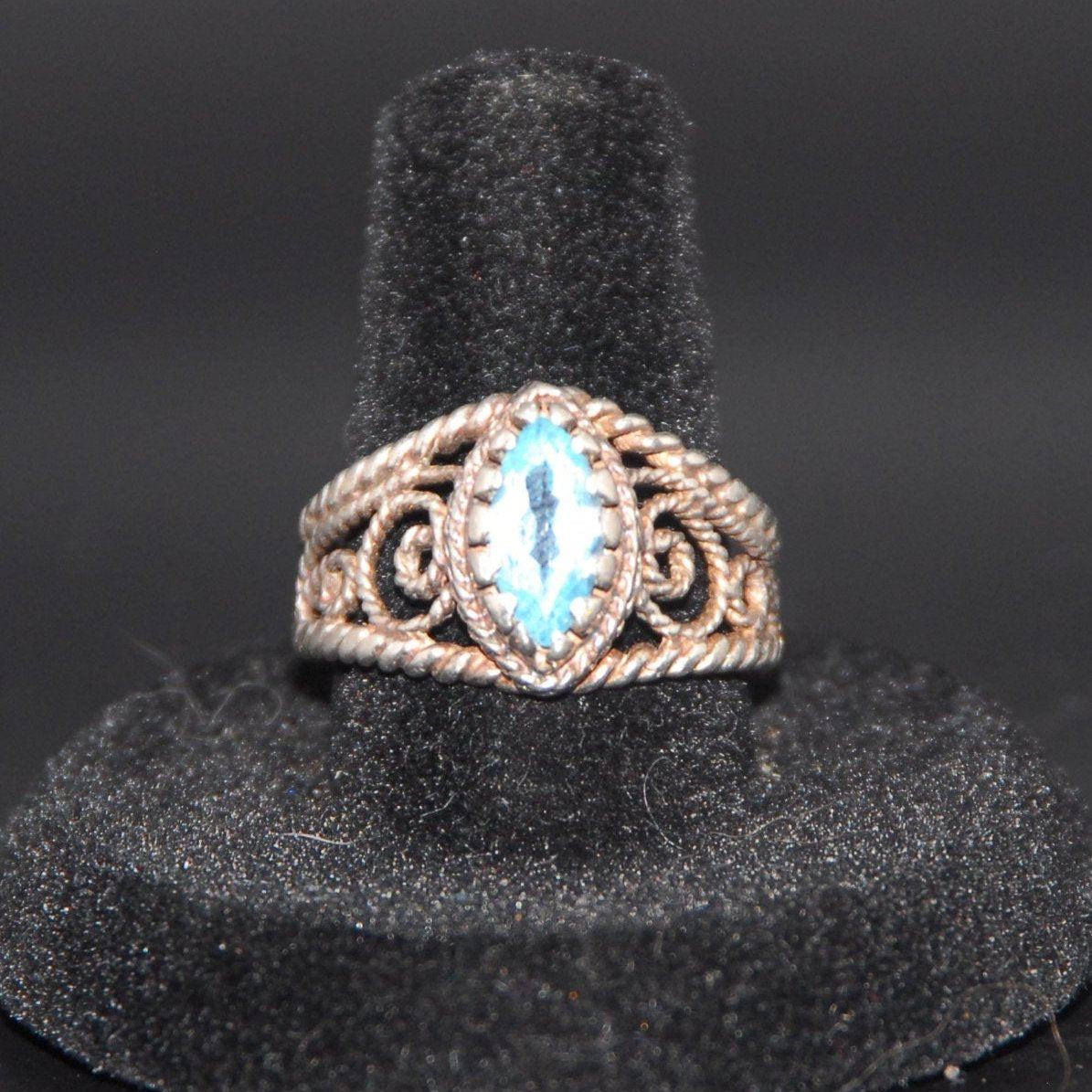Crafted with a striking blue topaz gemstone set in twisted sterling silver, this ring evokes a country aesthetic. The marquise cut blue topaz measures 0.5 inches and is stamped with 925. With a total weight of 4.54 grams, and a ring size of 8.5 this expertly crafted piece is a must-have for any jewelry collection.