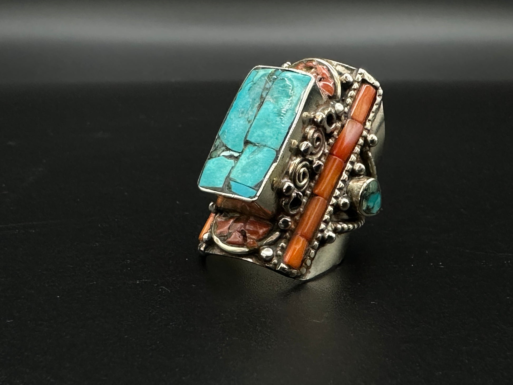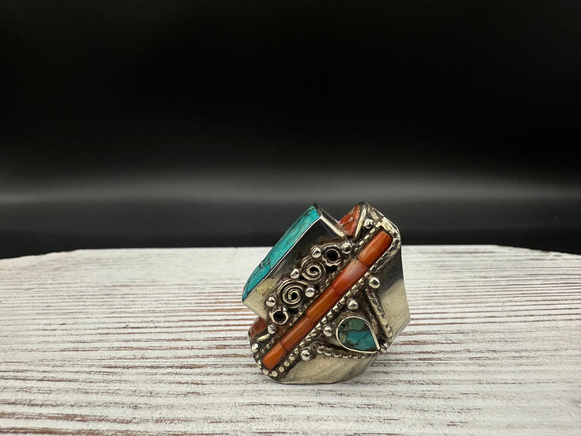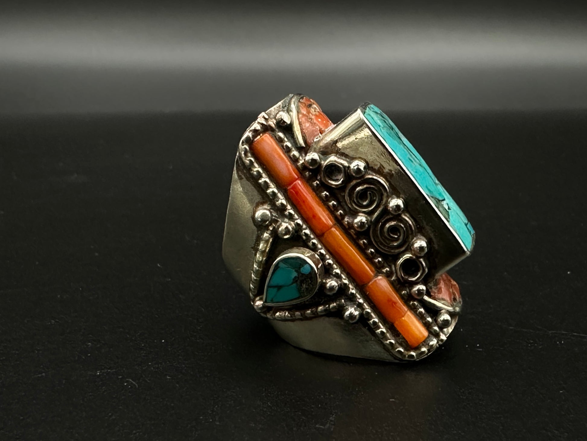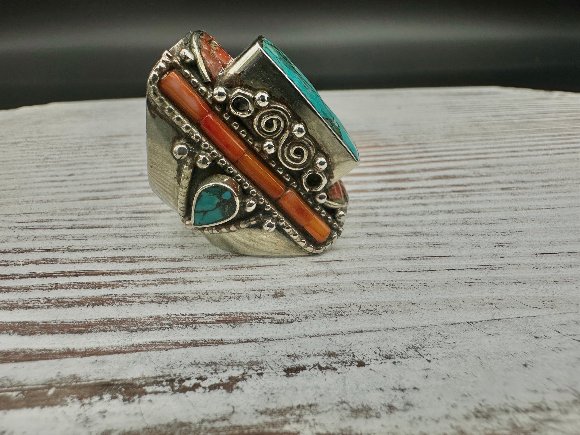 Wonderful Tibetian Knuckle Ring!! this ring, possibly made in Nepal, is 24.38 grams of sterling silver with some beautiful metal detailing, turquoise and coral. It measures 3.9 cm long by 1 cm high. It is a size 10 and has markings that it has been resized in the past. If you are looking for a statement piece- This is it!!