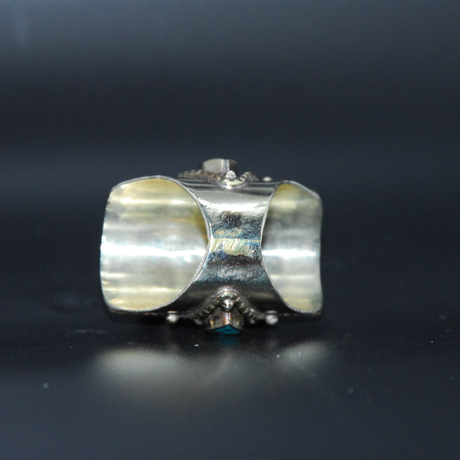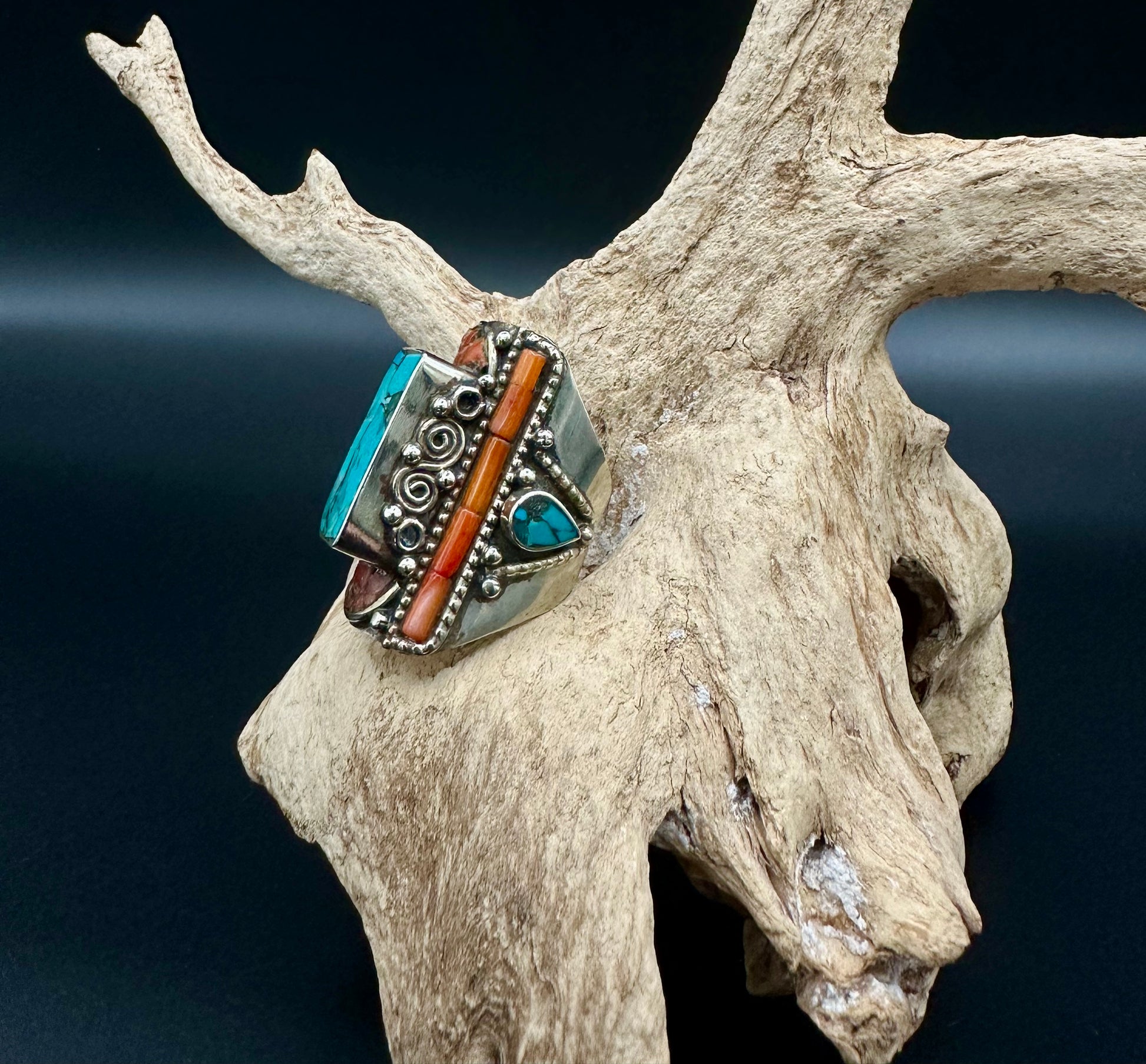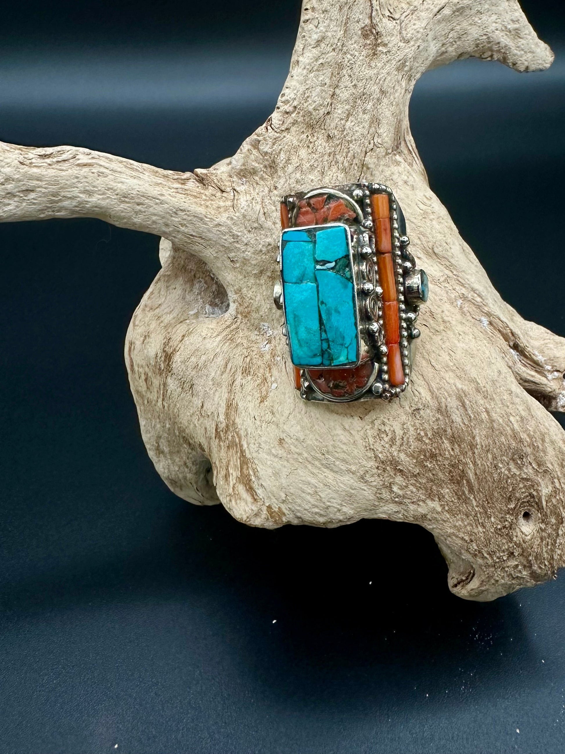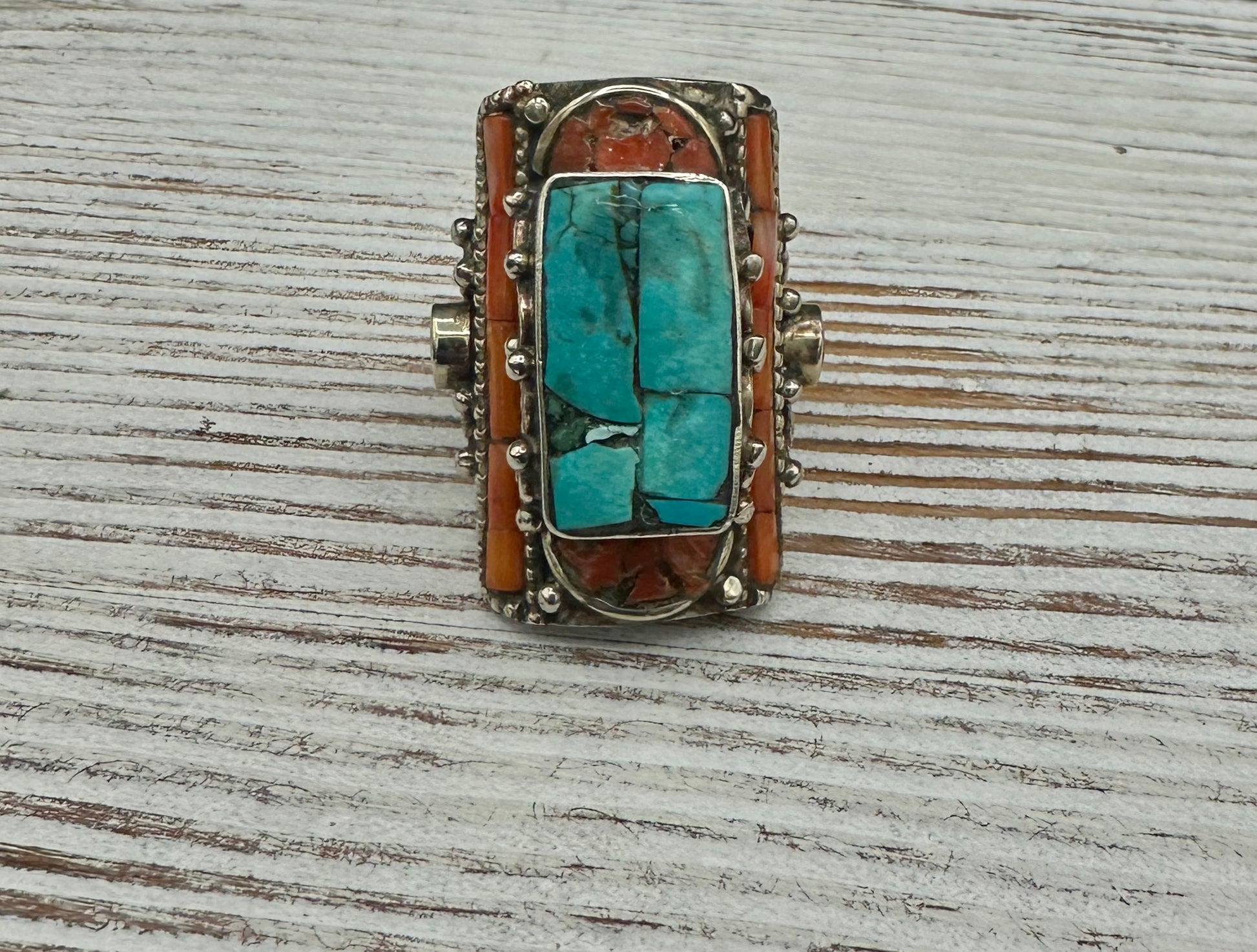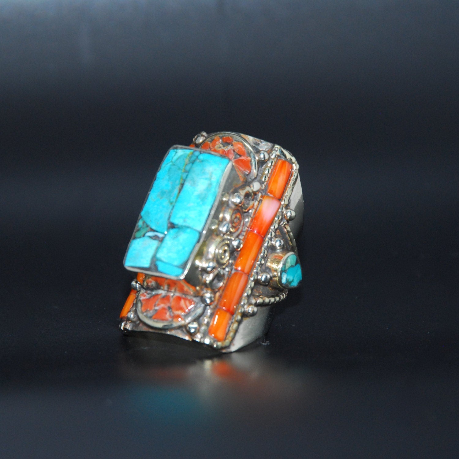 Wonderful Tibetian Knuckle Ring!! this ring, possibly made in Nepal, is 24.38 grams of sterling silver with some beautiful metal detailing, turquoise and coral. It measures 3.9 cm long by 1 cm high. It is a size 10 and has markings that it has been resized in the past. If you are looking for a statement piece- This is it!!