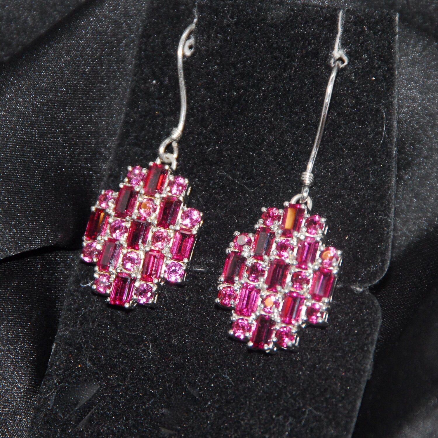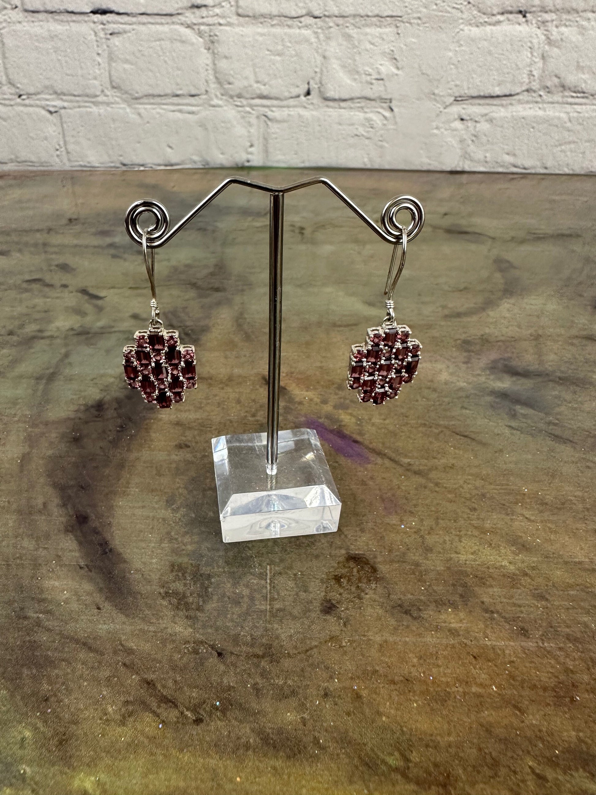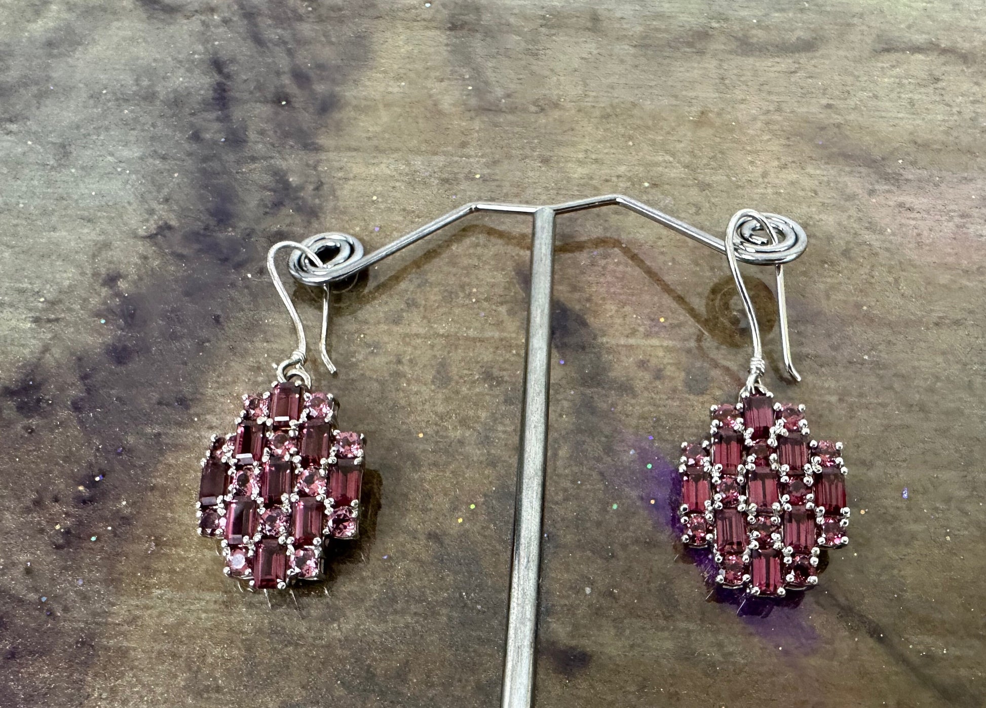 These Umba River Rhodolite Garnet Earrings are sourced from India and decorated with emerald and round cut gems, measuring 1 3/4 inches in length and 3/4 inches in width. They are set on elegant Sterling Silver backs and dangle from Sterling silver hooks. A matching Cross necklace featuring Umba River Rhodolite Garnet is also offered. Contact me for a discounted price if you purchase both pieces.