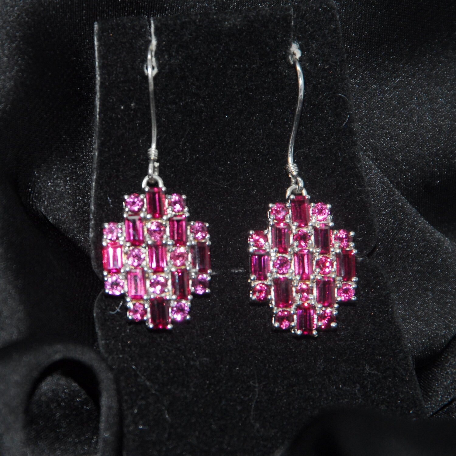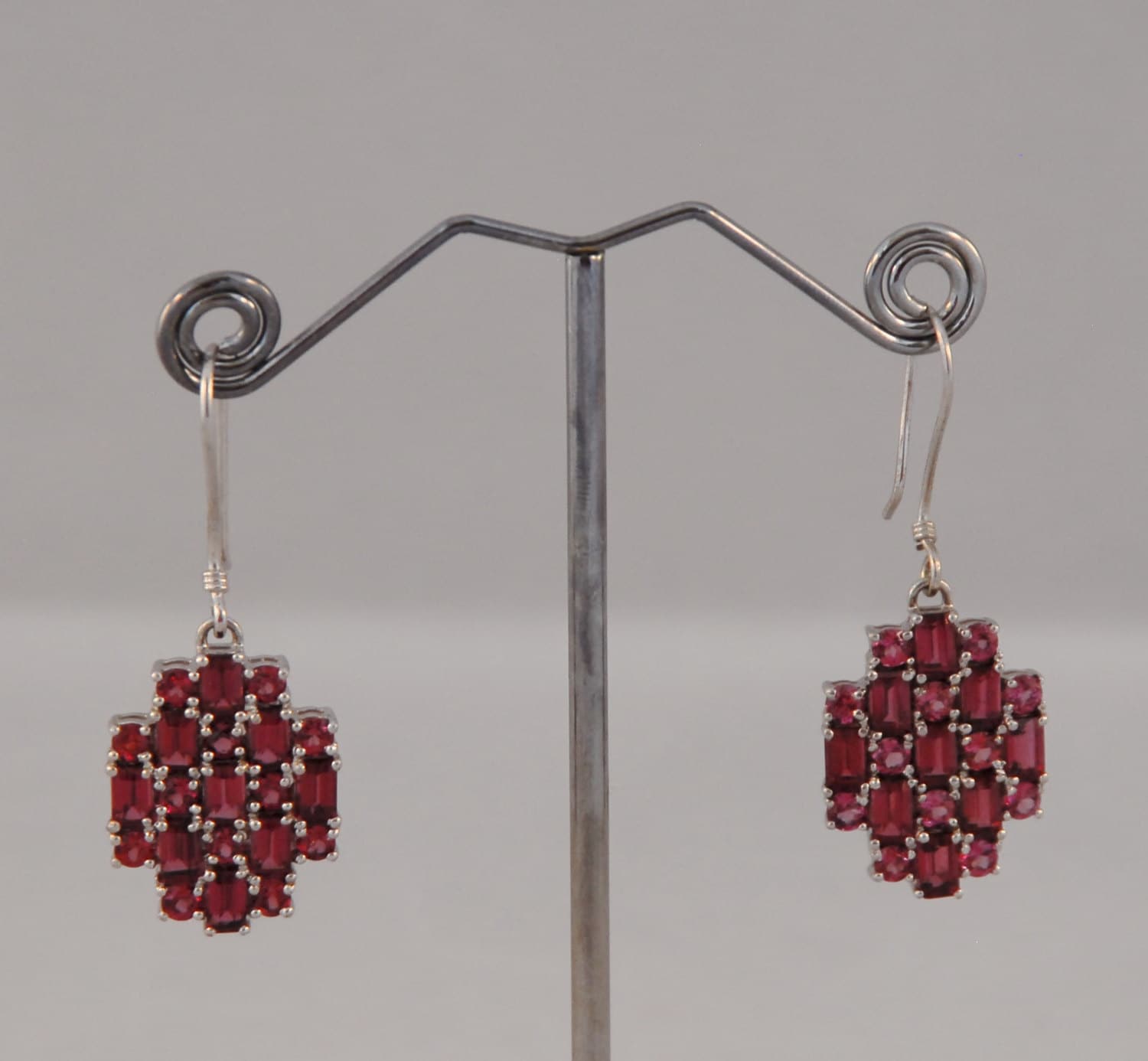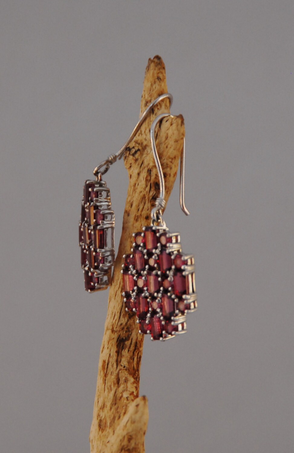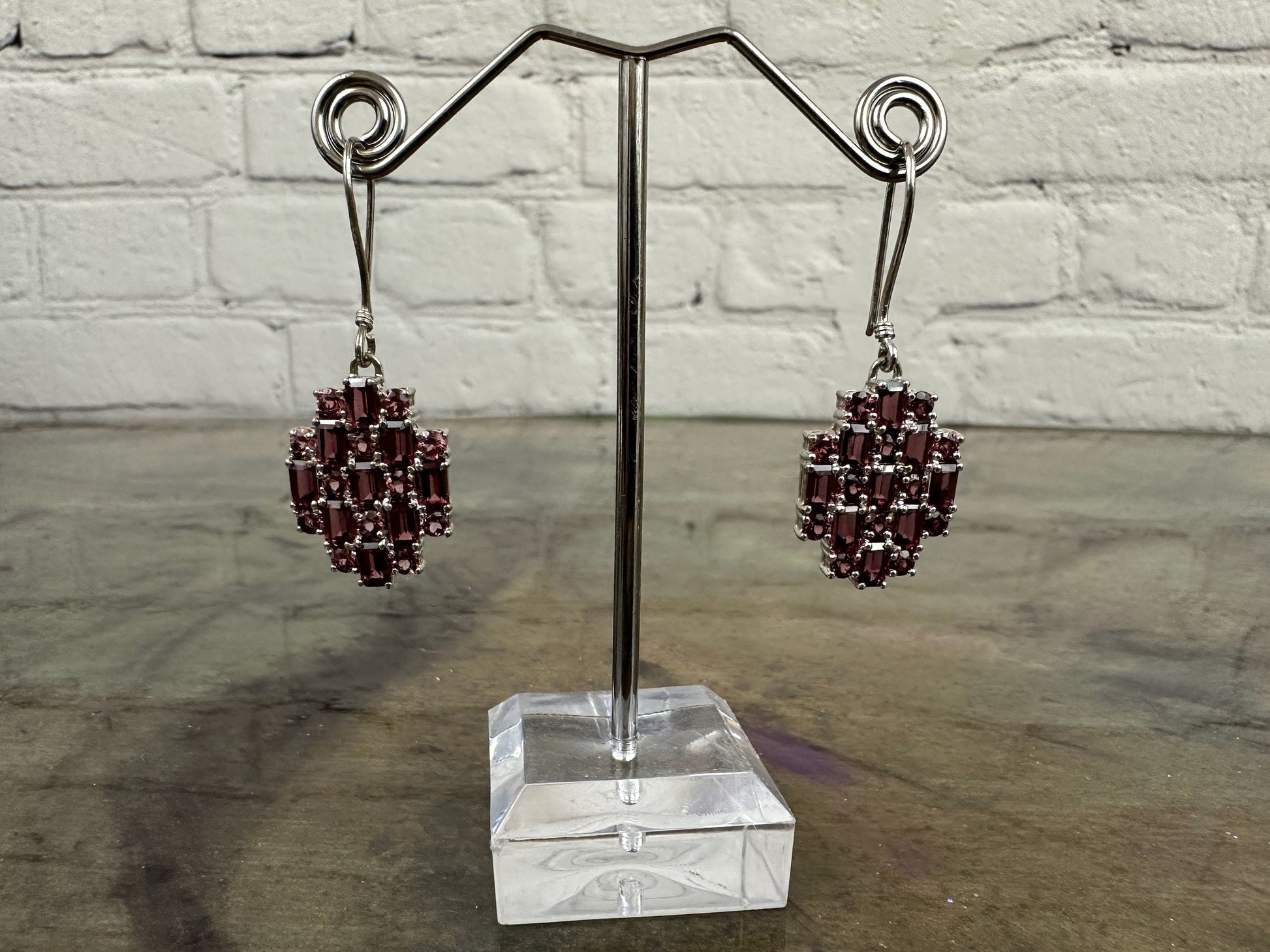 These Umba River Rhodolite Garnet Earrings are sourced from India and decorated with emerald and round cut gems, measuring 1 3/4 inches in length and 3/4 inches in width. They are set on elegant Sterling Silver backs and dangle from Sterling silver hooks. A matching Cross necklace featuring Umba River Rhodolite Garnet is also offered. Contact me for a discounted price if you purchase both pieces.
