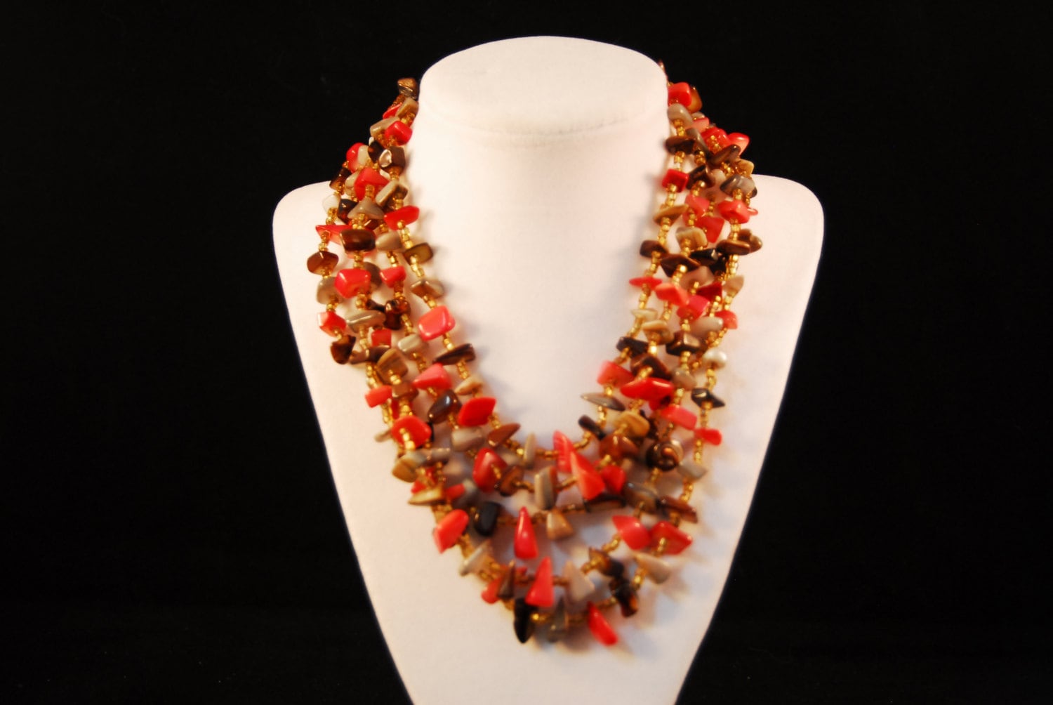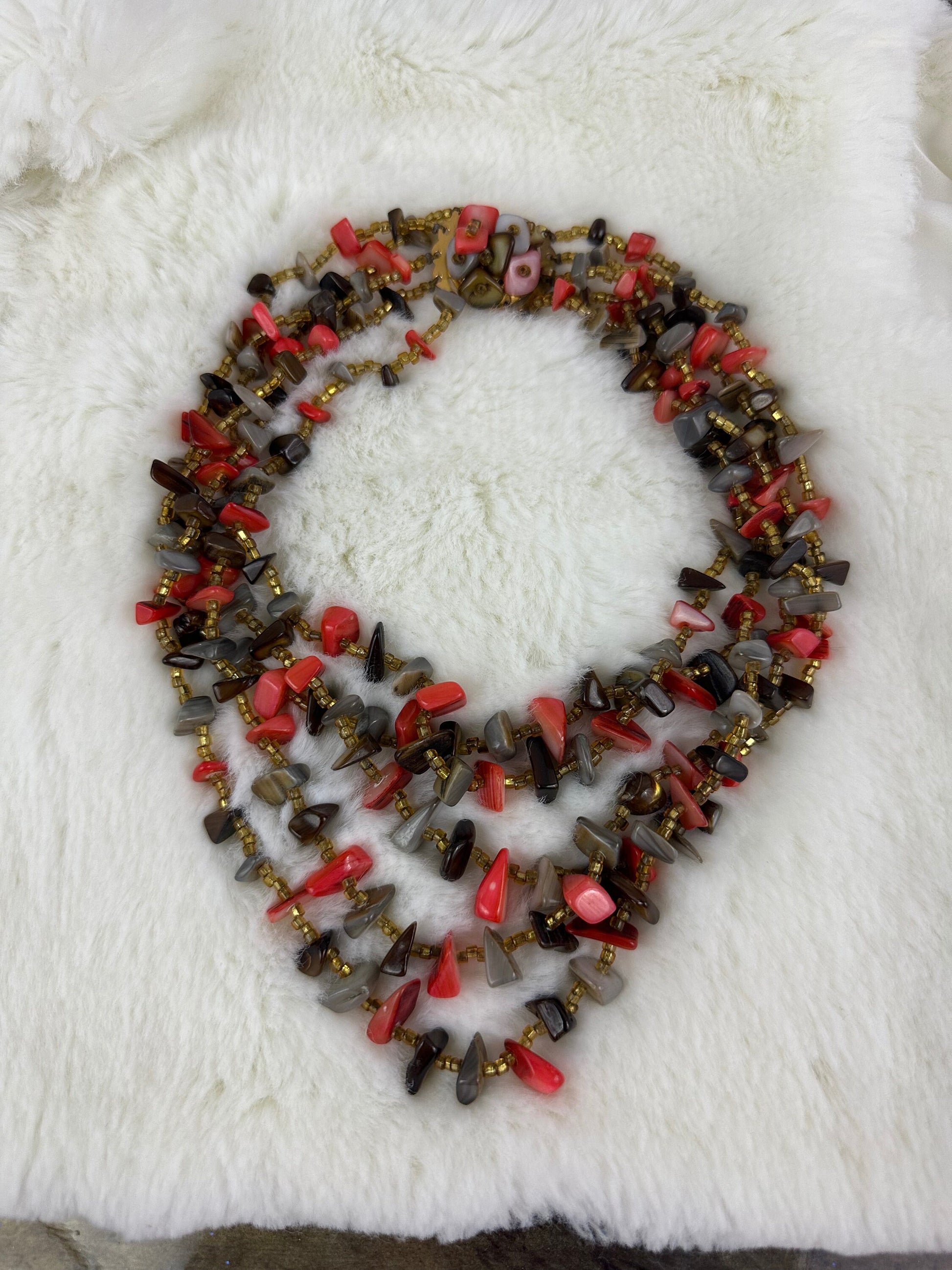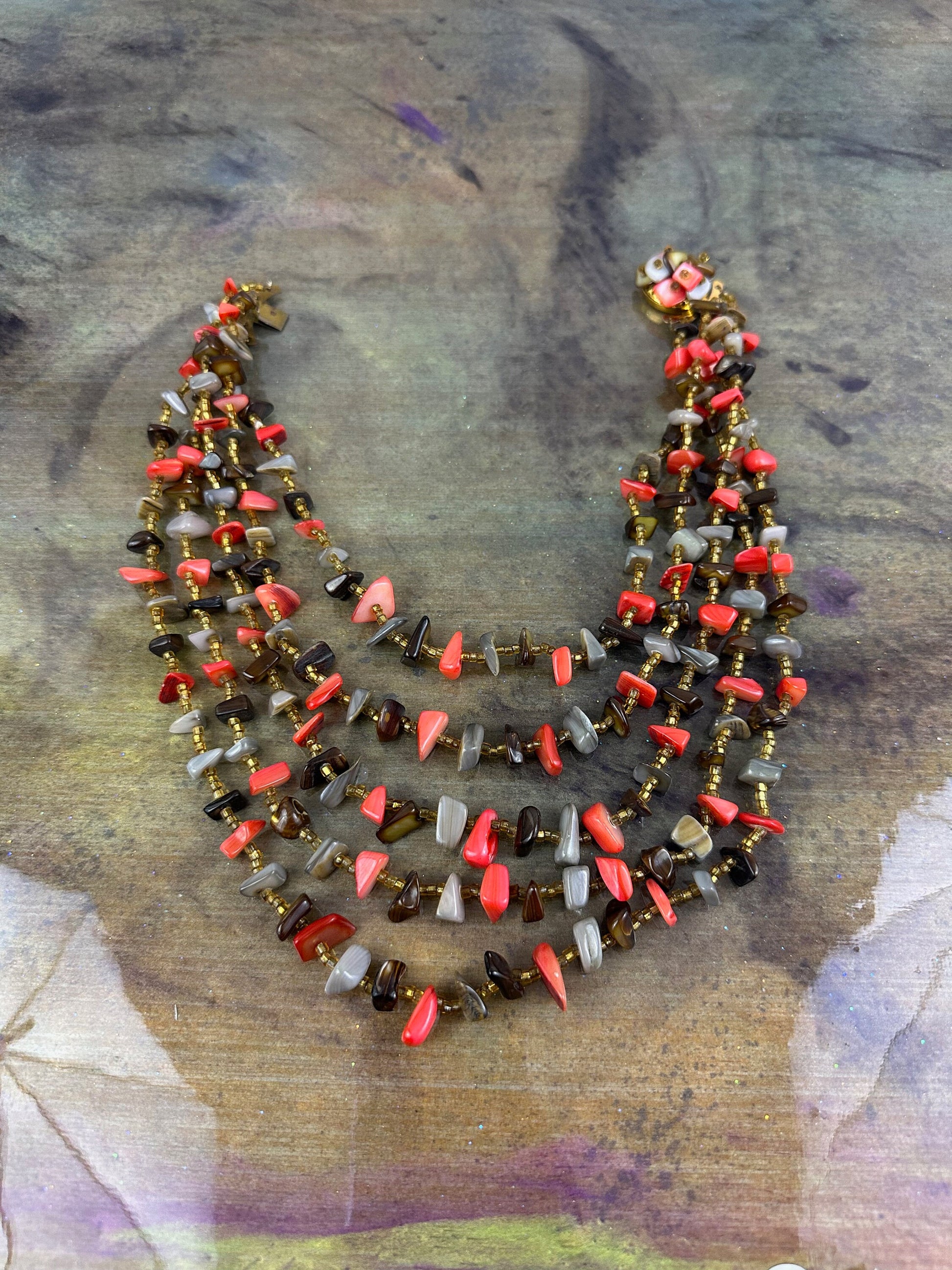 This Vintage 5 Strand Shell chip necklace from Japan features gold beads and a stone covered push clasp. The shortest strand measures 37 cm and the longest measures 52 cm, making it a versatile piece. Marked Japan, this necklace showcases beautifully polished shells in shades of Orange, Grey, and Brown. Its retro style adds a touch of vintage charm, perfect for any occasion.
