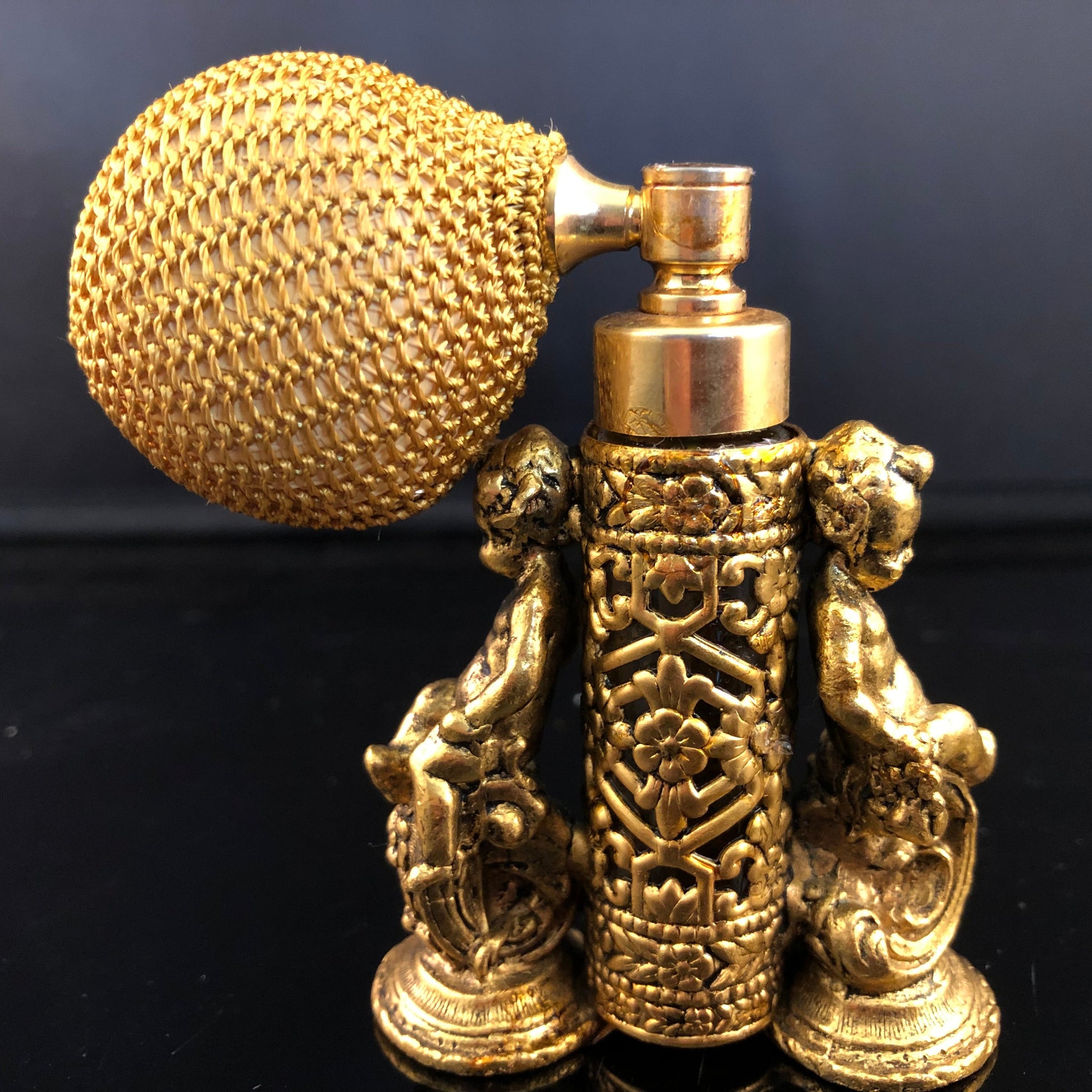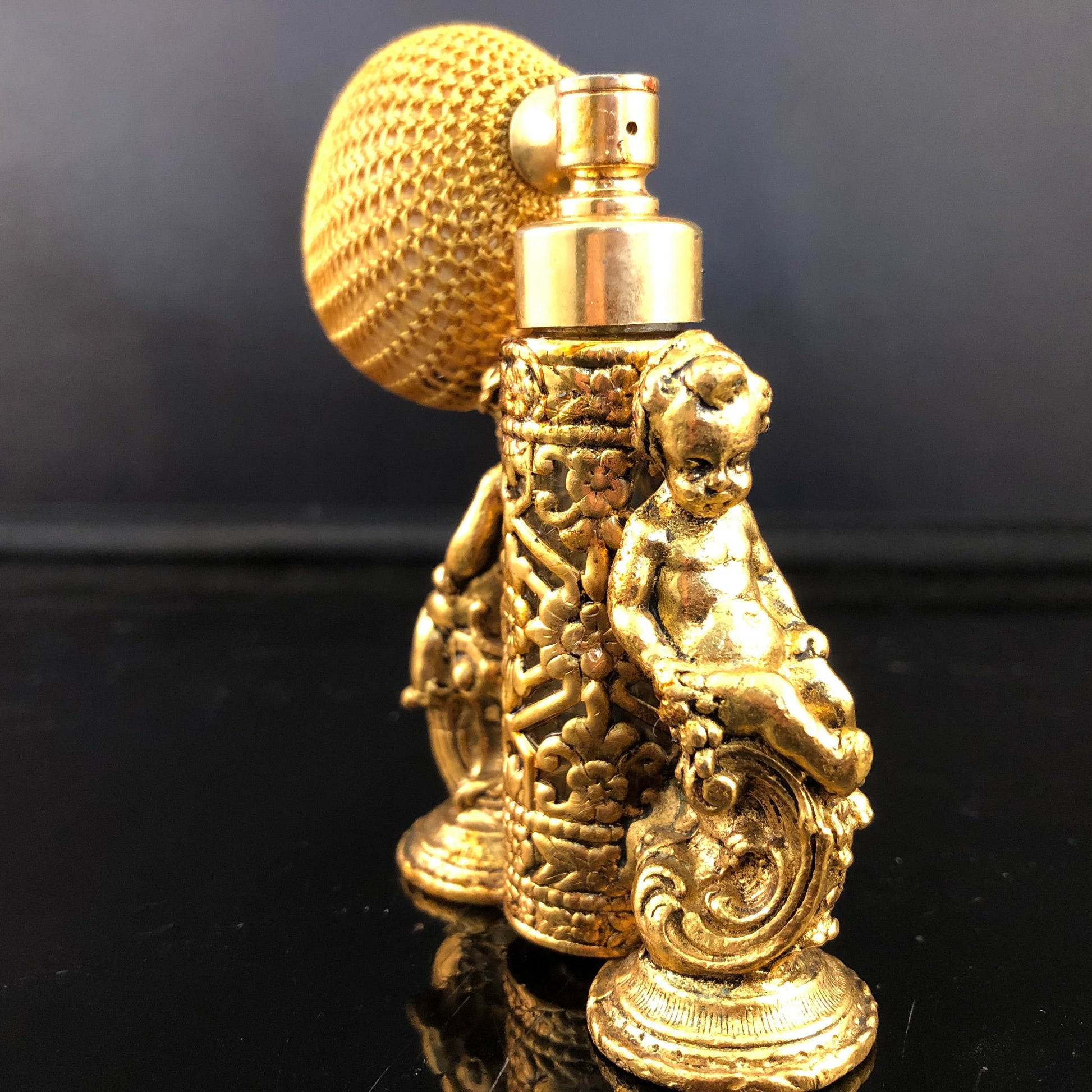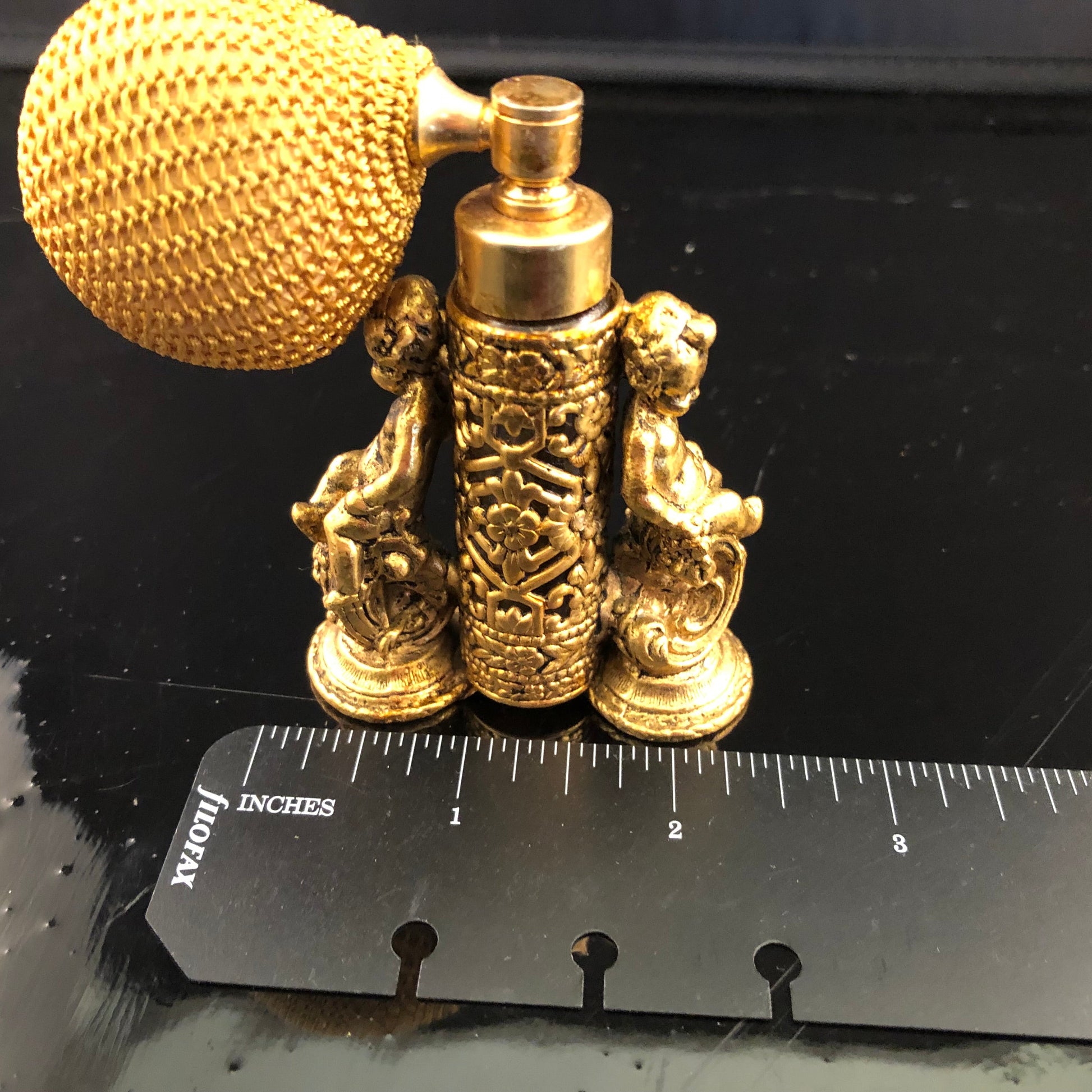 This vintage perfume atomizer is a true gem for your household. The original sticker on the bottom of the bottle boasts its 24K gold plating, guaranteed to be free from tarnishing. The atomizer design features two cherubs seated and facing outward, with an ornate bottle holder between them. In excellent vintage condition, this piece still has its original bulb intact. Please note that it has not been cleaned, so expect a lingering perfume scent upon opening. Measurements include 25/16 inches (5.9 cm) in diameter, 15/16 of an inch (2.4 cm) in width at the base of the cherubs, and a height of 3 inches (7.6 cm). The piece weighs 5.8 oz.