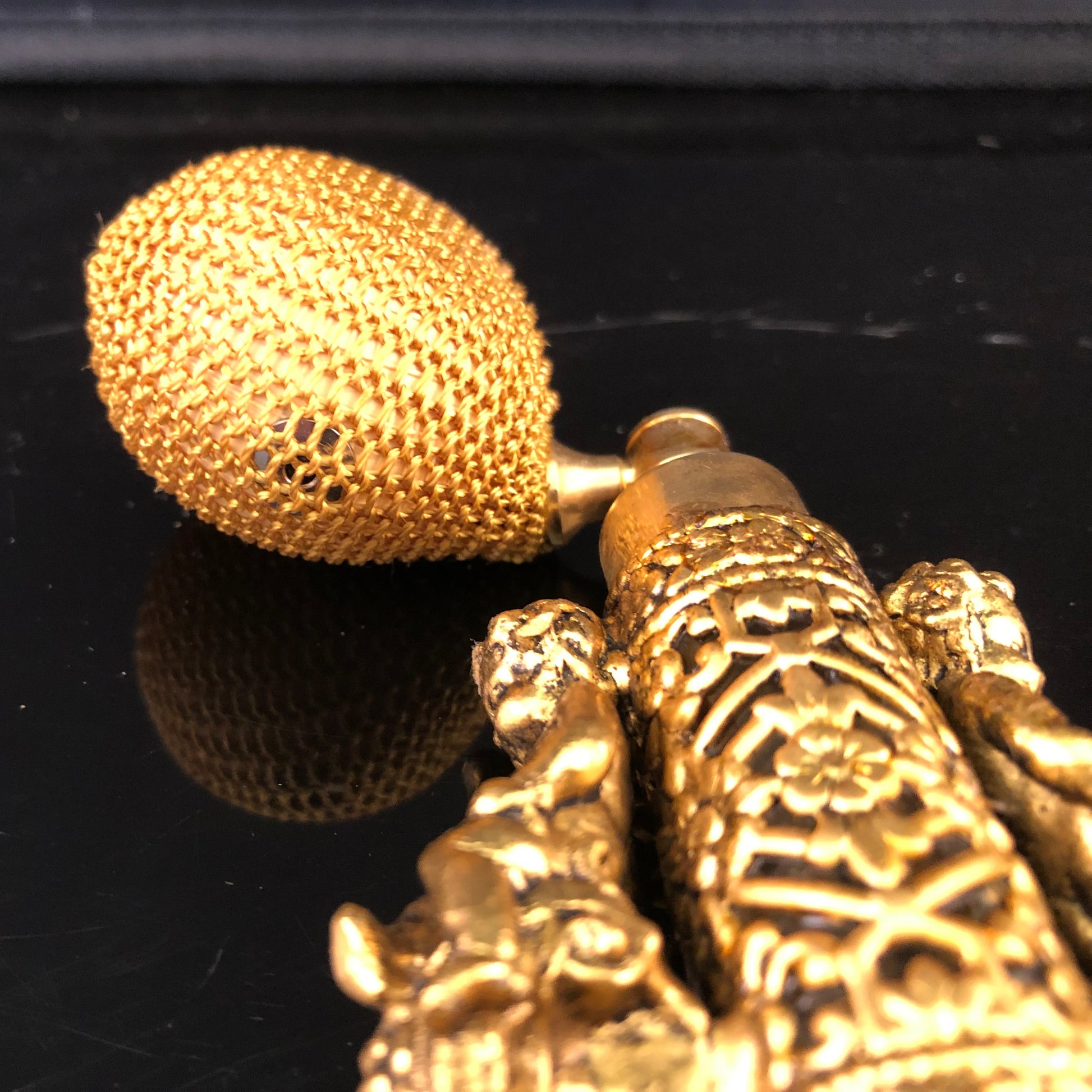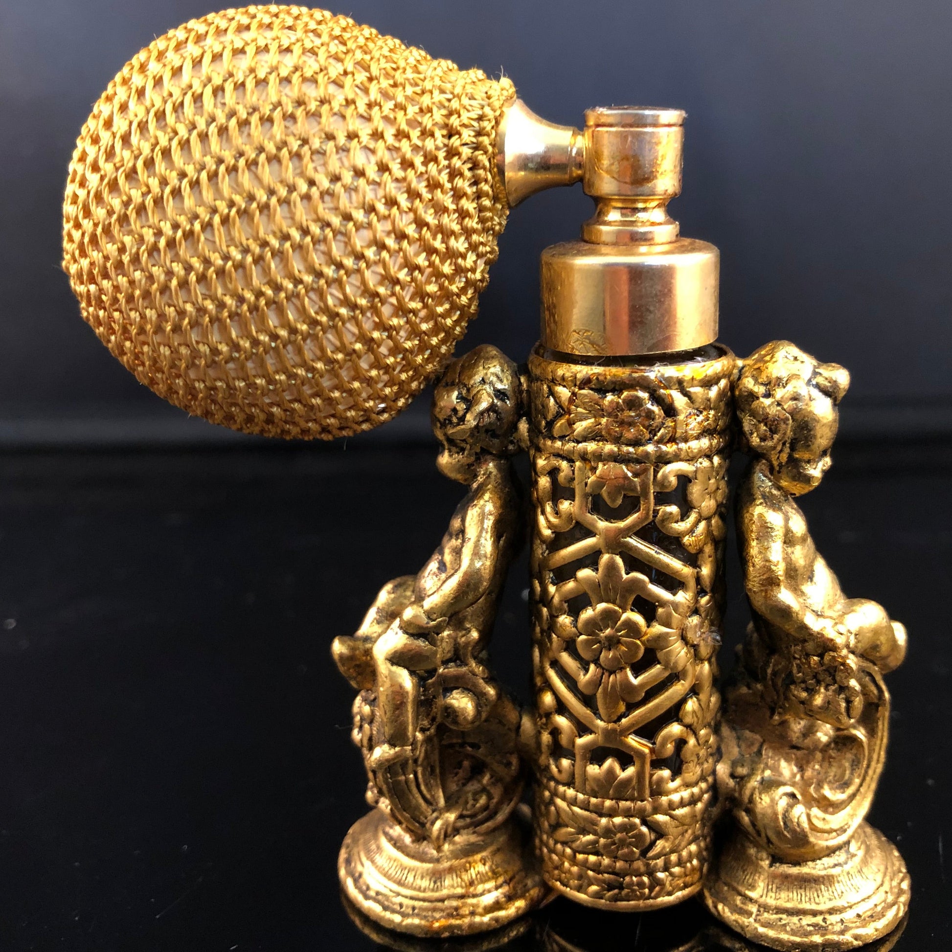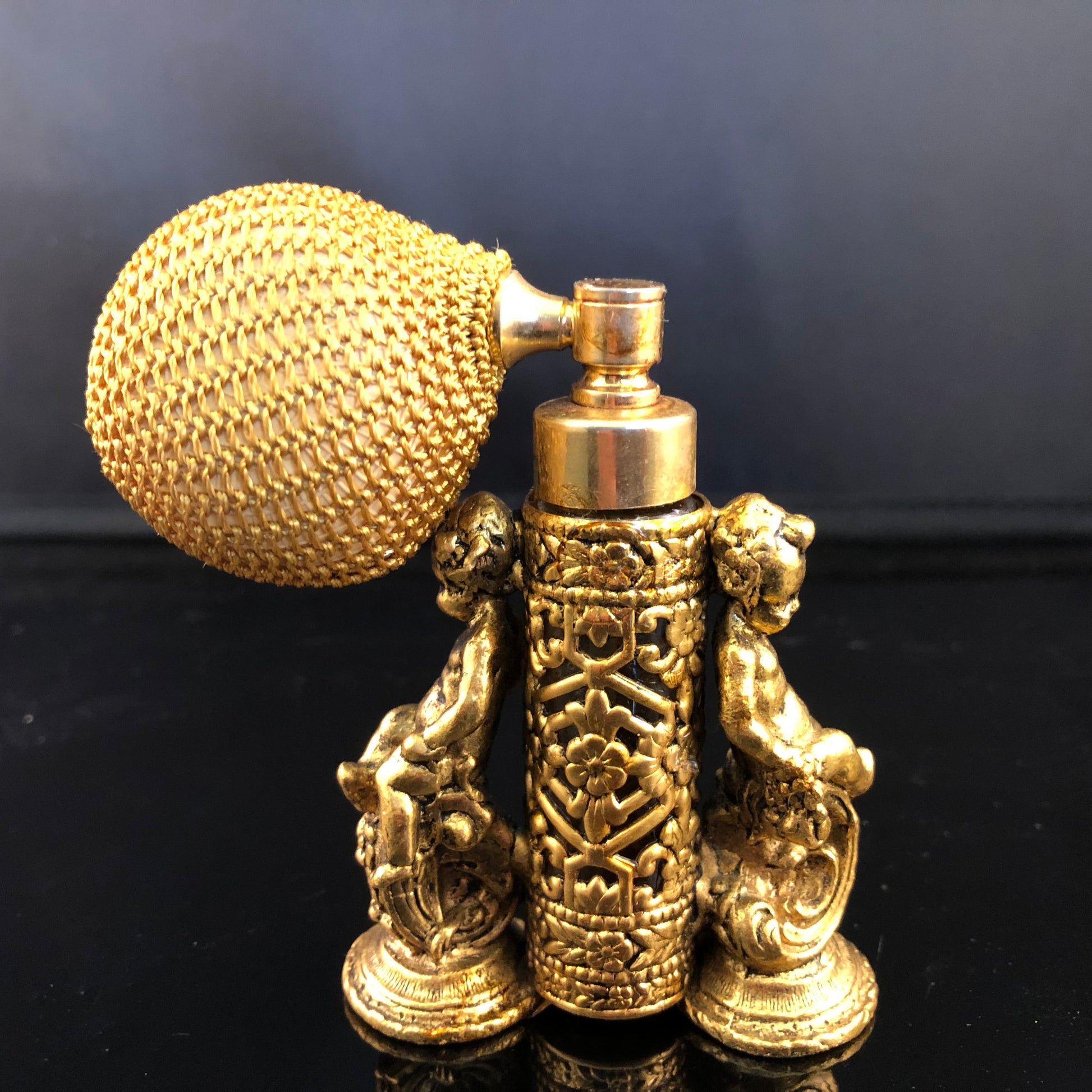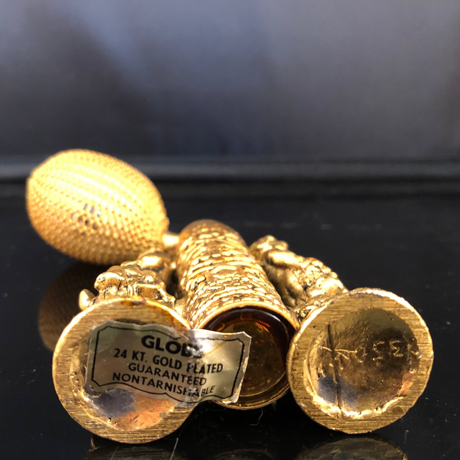 This vintage perfume atomizer is a true gem for your household. The original sticker on the bottom of the bottle boasts its 24K gold plating, guaranteed to be free from tarnishing. The atomizer design features two cherubs seated and facing outward, with an ornate bottle holder between them. In excellent vintage condition, this piece still has its original bulb intact. Please note that it has not been cleaned, so expect a lingering perfume scent upon opening. Measurements include 25/16 inches (5.9 cm) in diameter, 15/16 of an inch (2.4 cm) in width at the base of the cherubs, and a height of 3 inches (7.6 cm). The piece weighs 5.8 oz.
