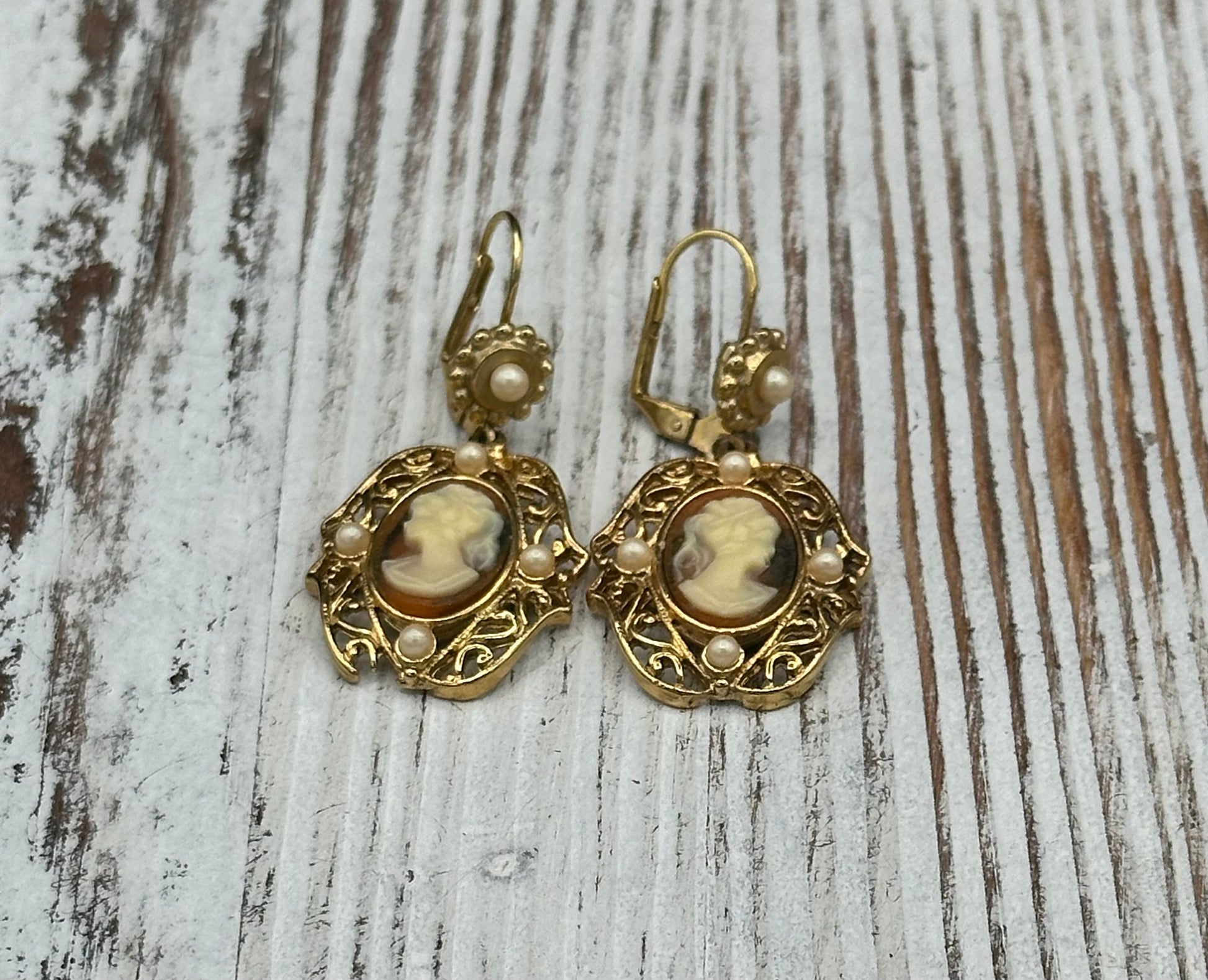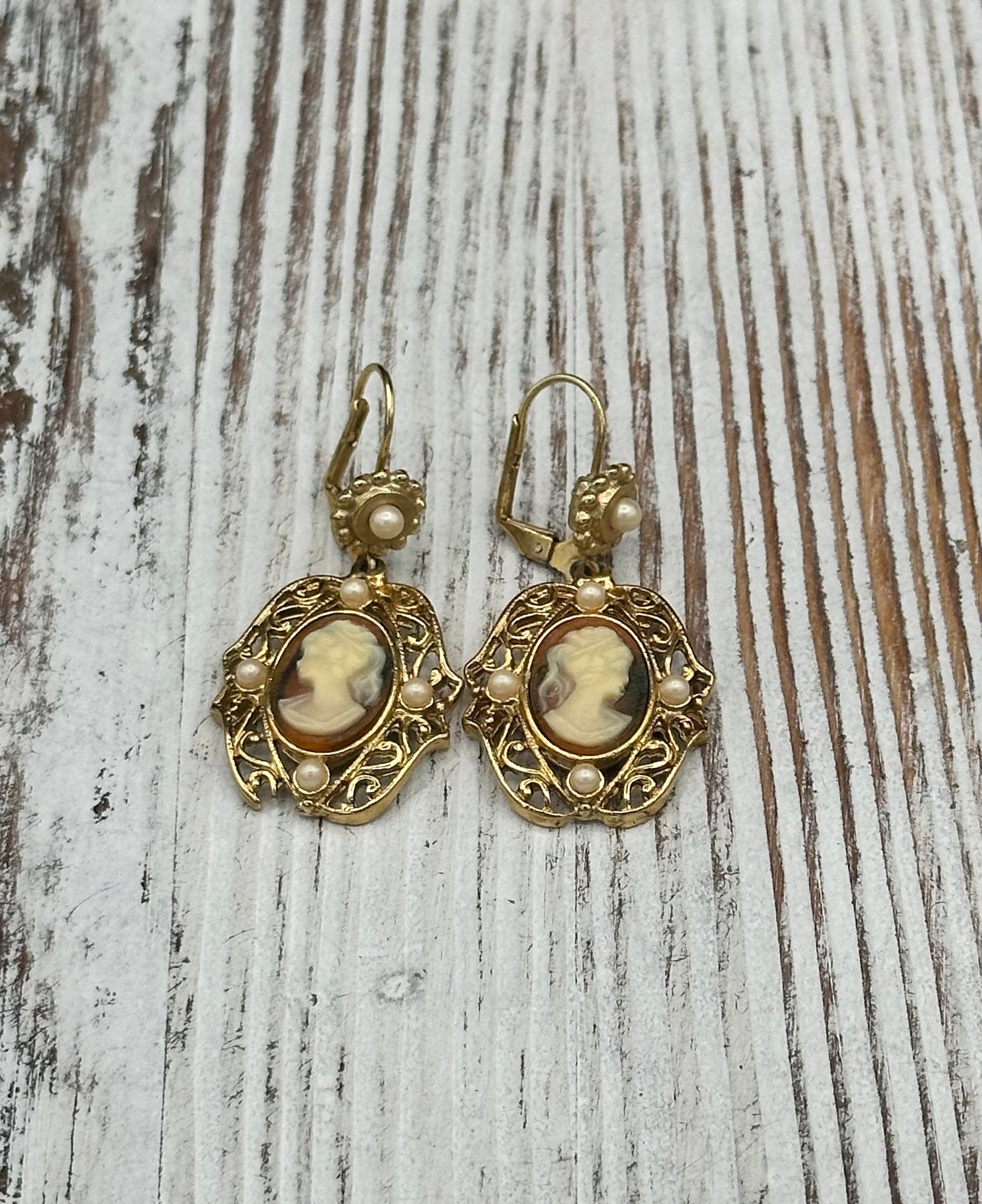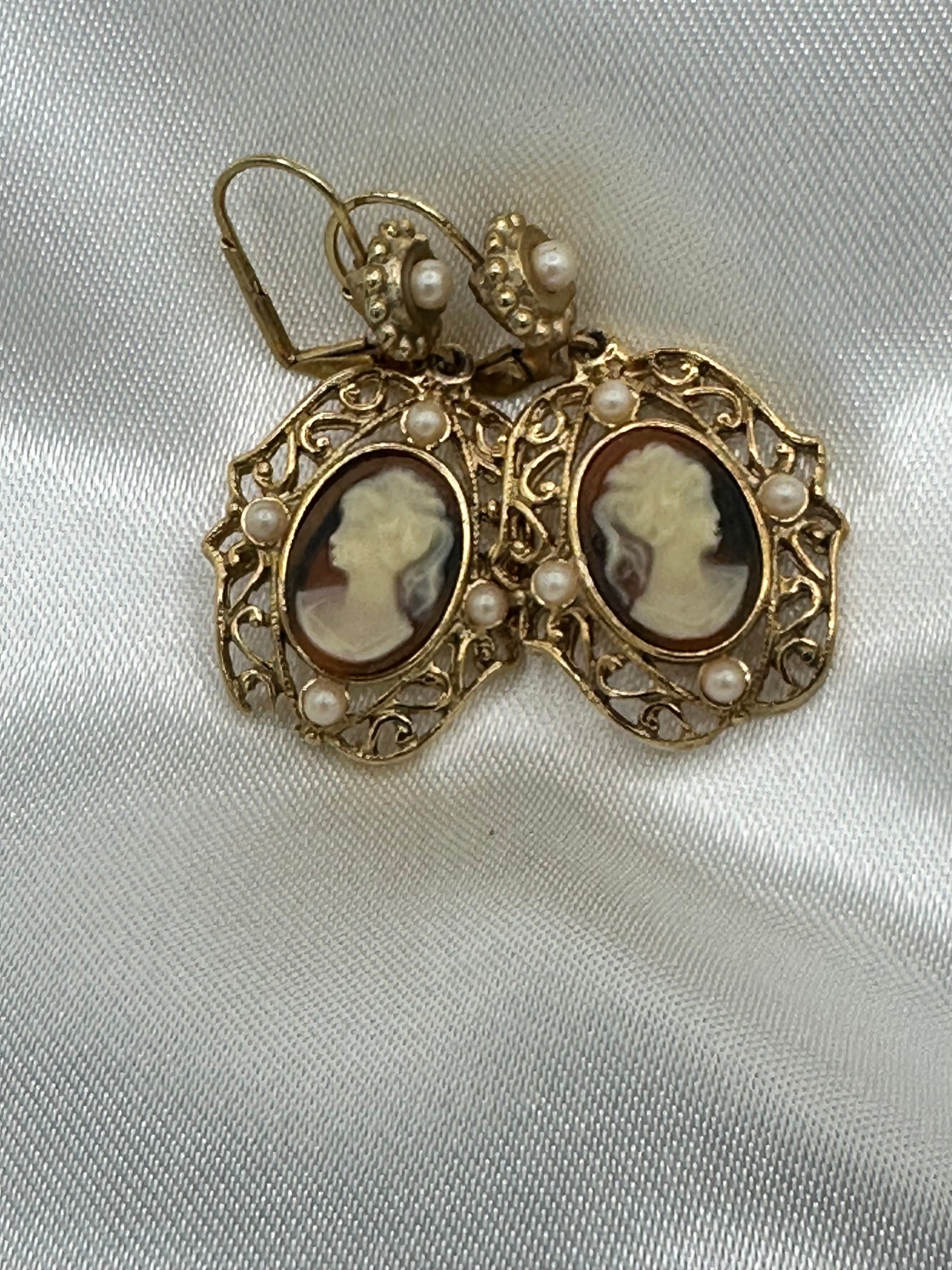 Vintage Jessica Stevens Victorian style Faux Cameo and Faux Pearl Drop Earrings in Gold Tone