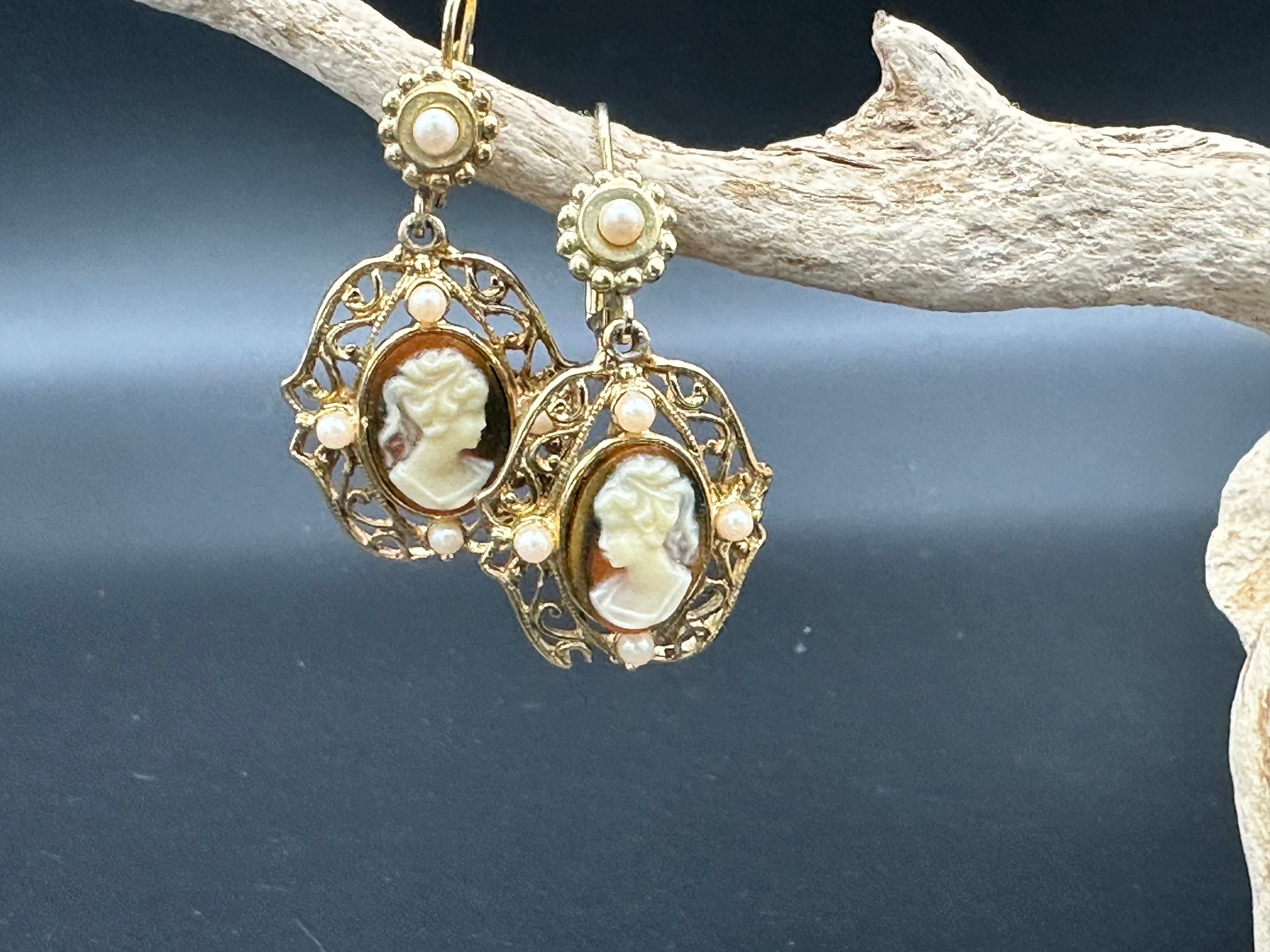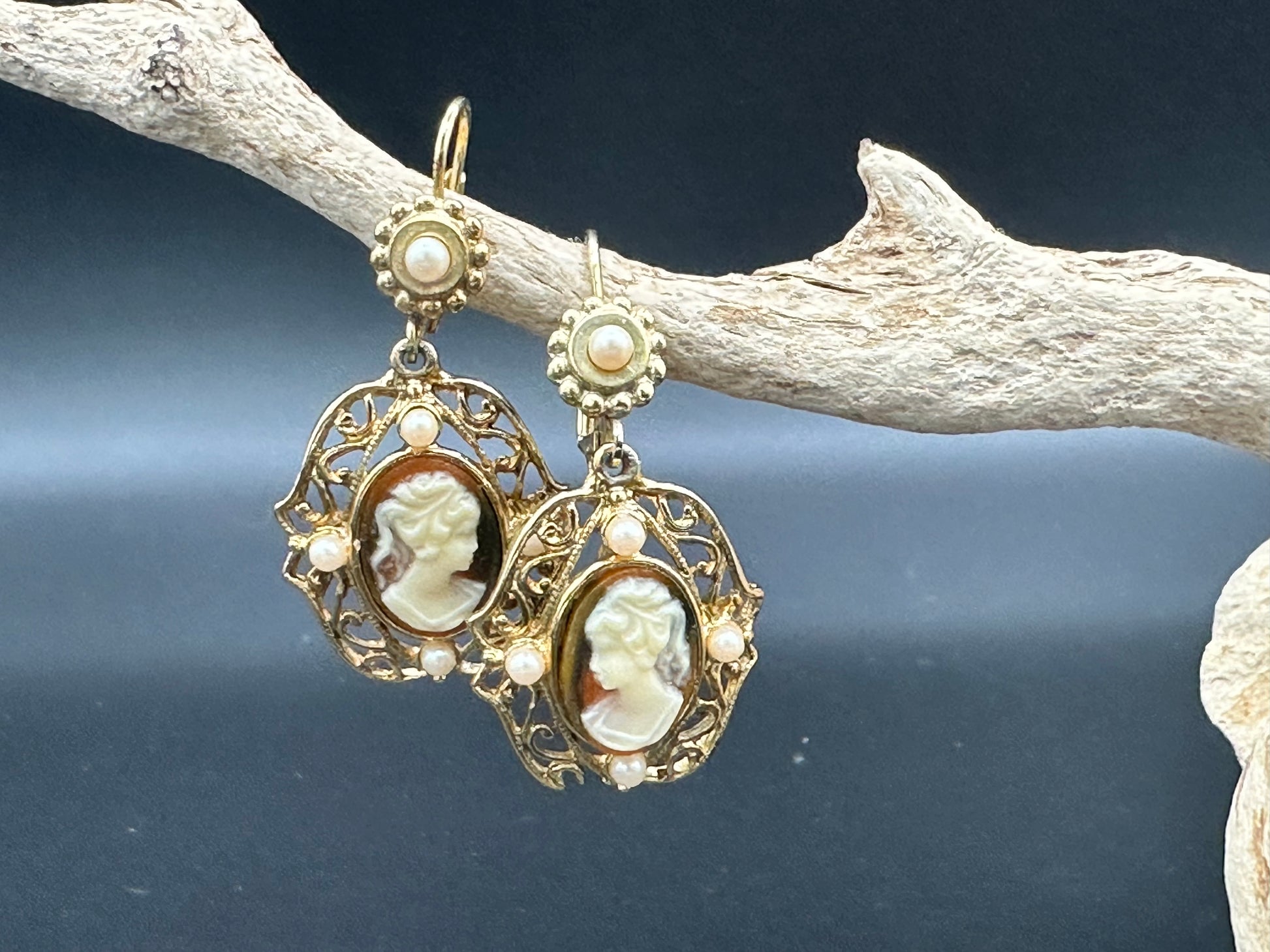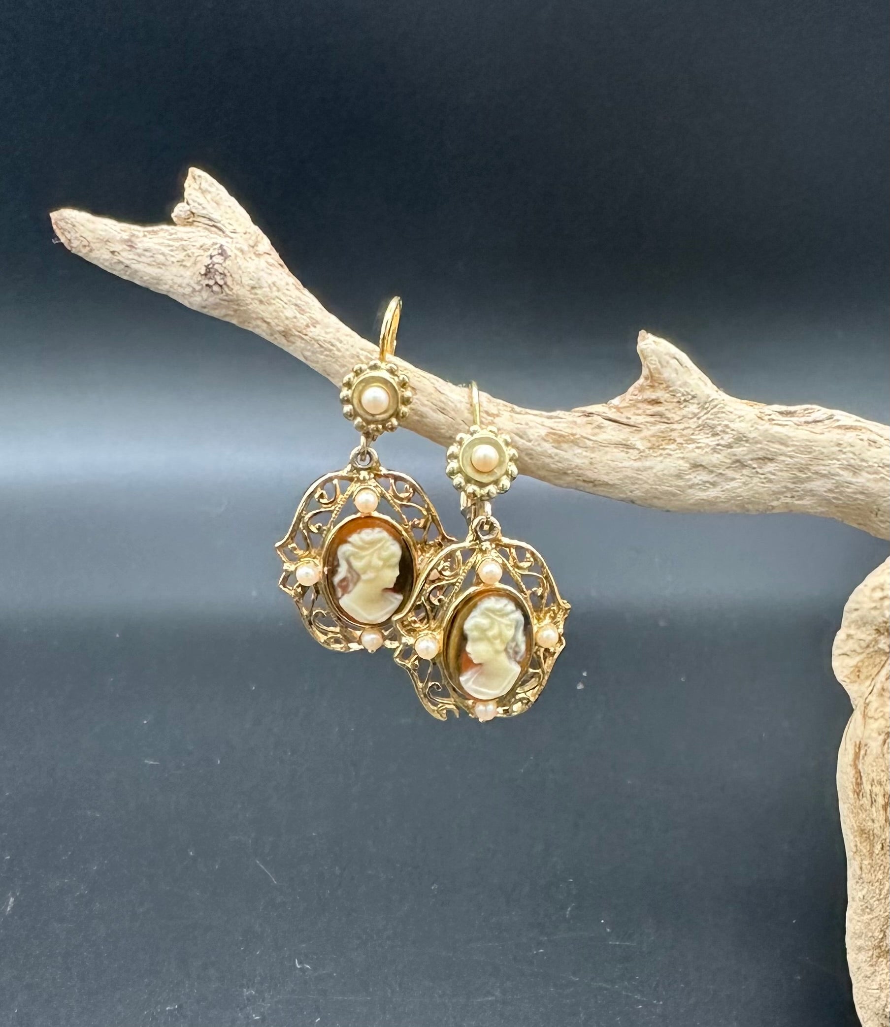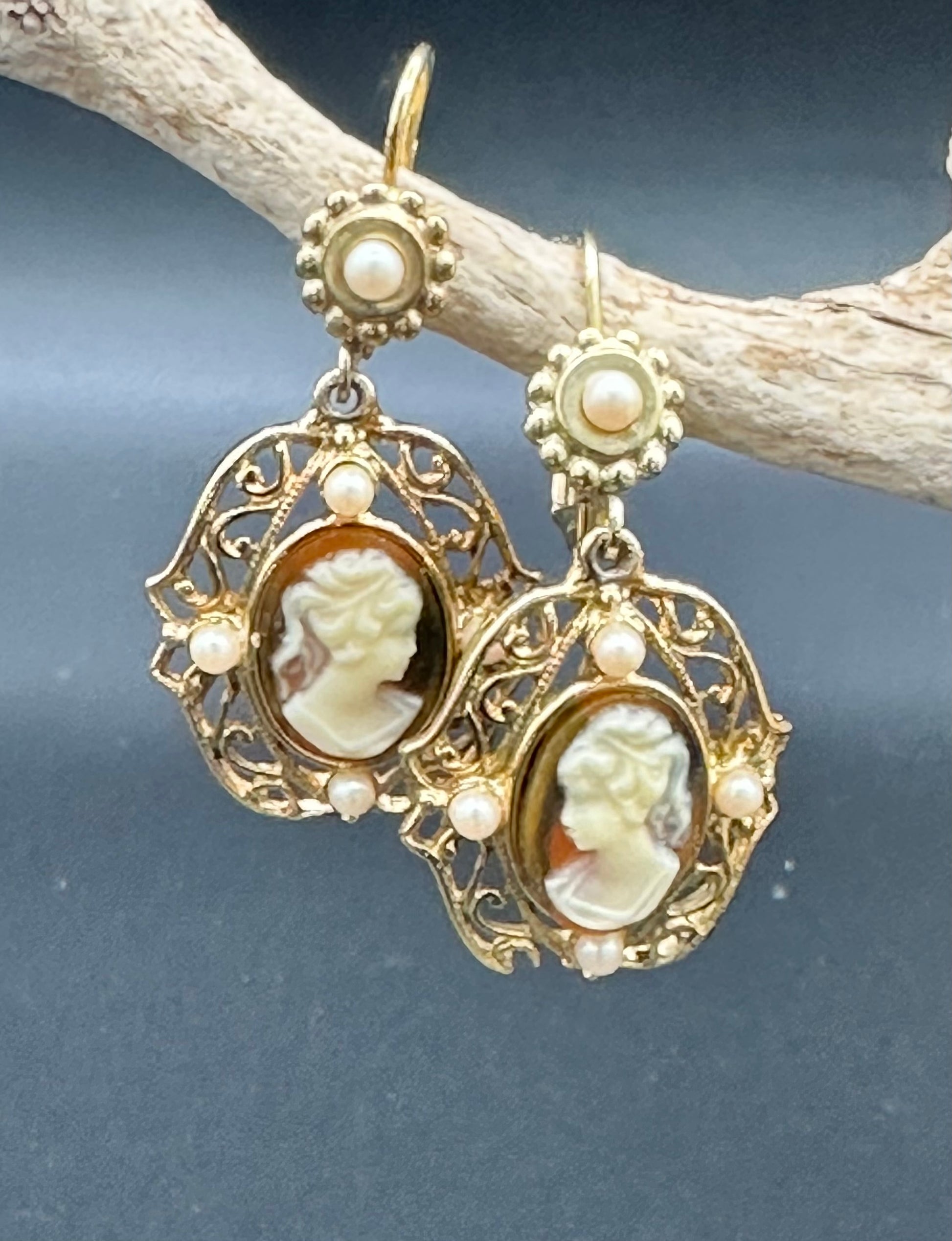Vintage Jessica Stevens Victorian style Faux Cameo and Faux Pearl Drop Earrings in Gold Tone