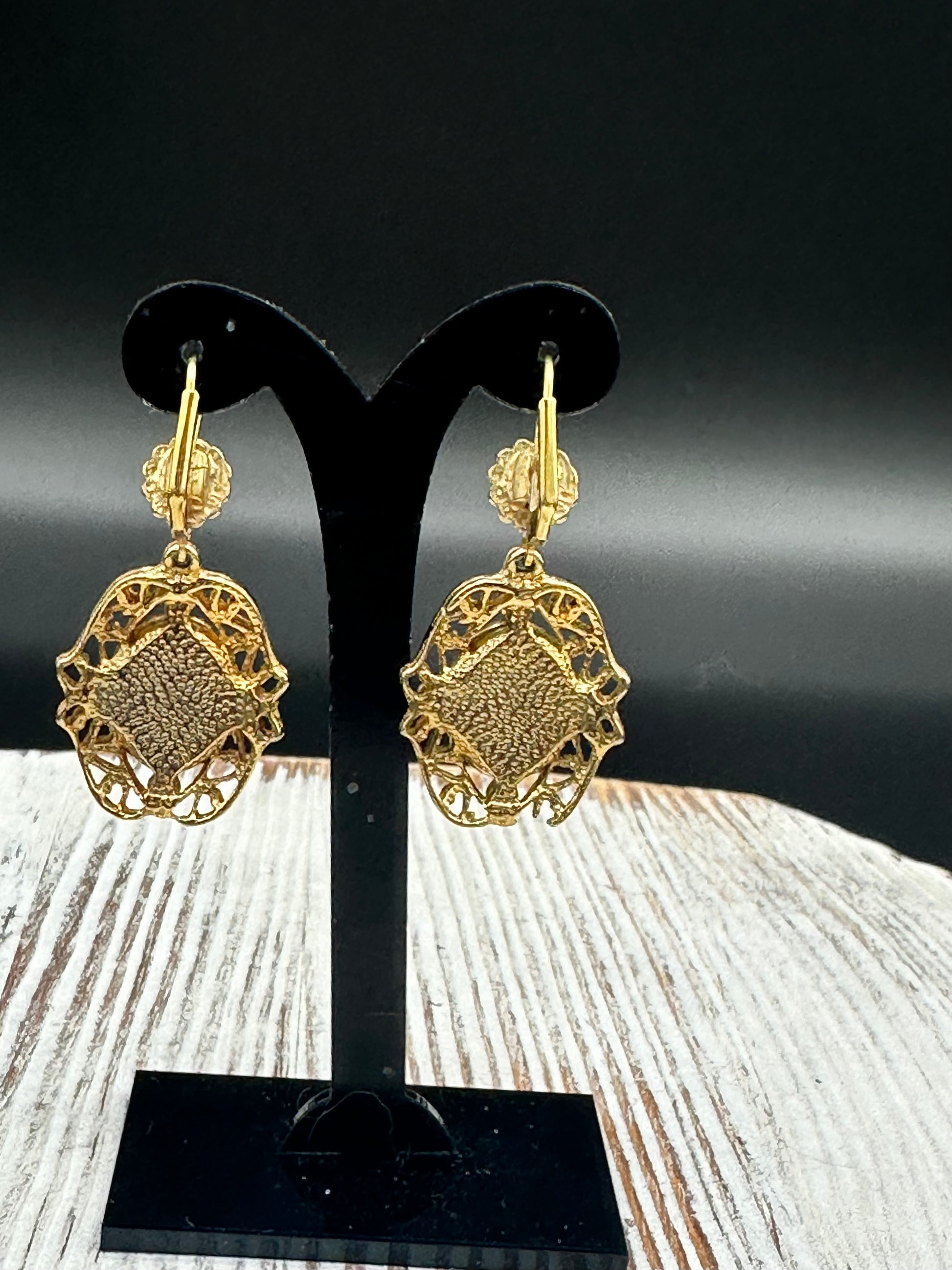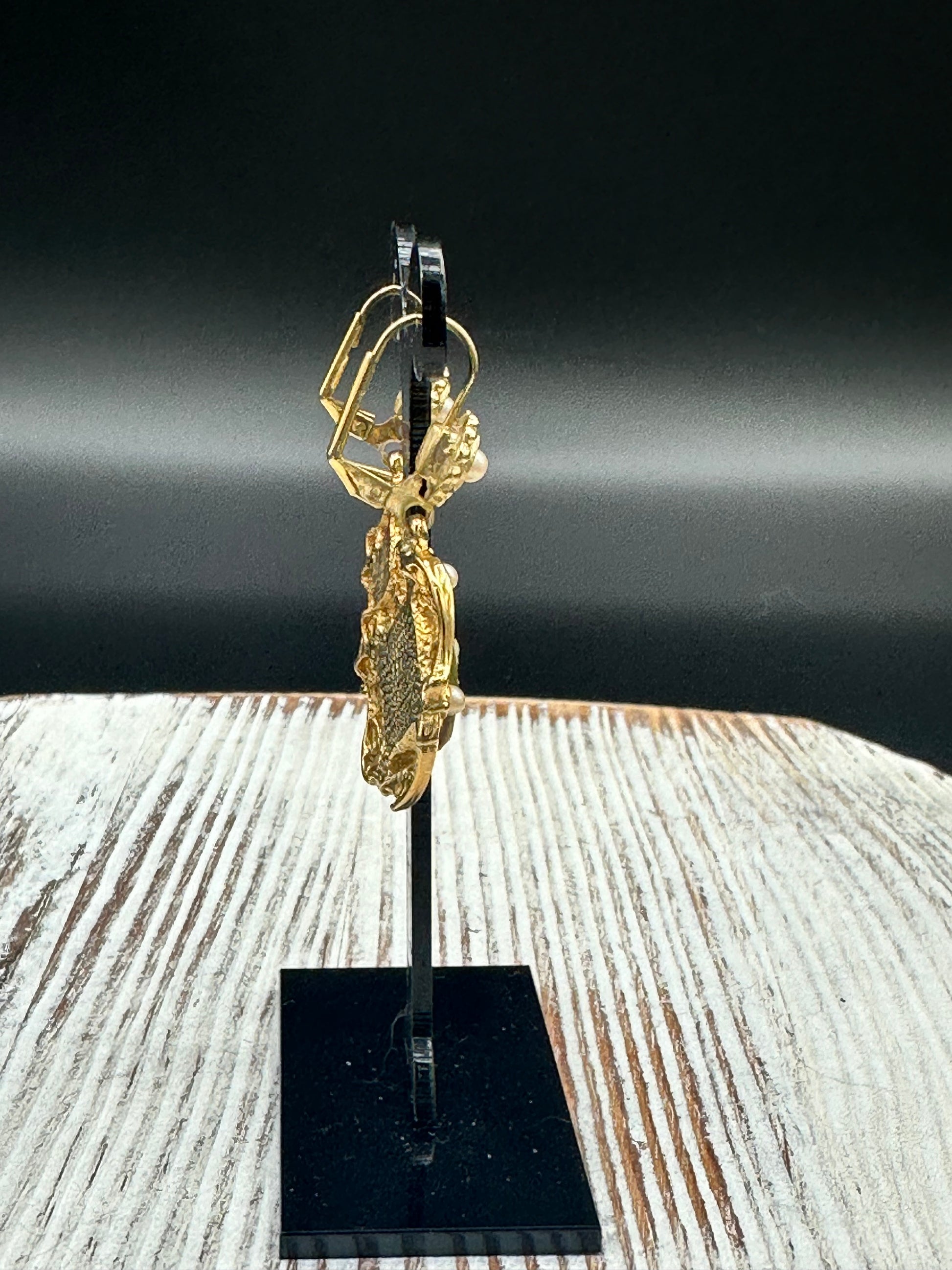 Expertly crafted from high-quality materials, these Vintage Jessica Stevens Victorian style Faux Cameo and Faux Pearl Drop Earrings exude timeless elegance. The intricate details of the faux cameo and faux pearl are set in a stunning gold tone, making these earrings a perfect addition to any outfit. Elevate your style with these exquisite earrings today. One earring does have damage at the bottom as seen in the pictures. Earrings measure 1.5 inches long by 7