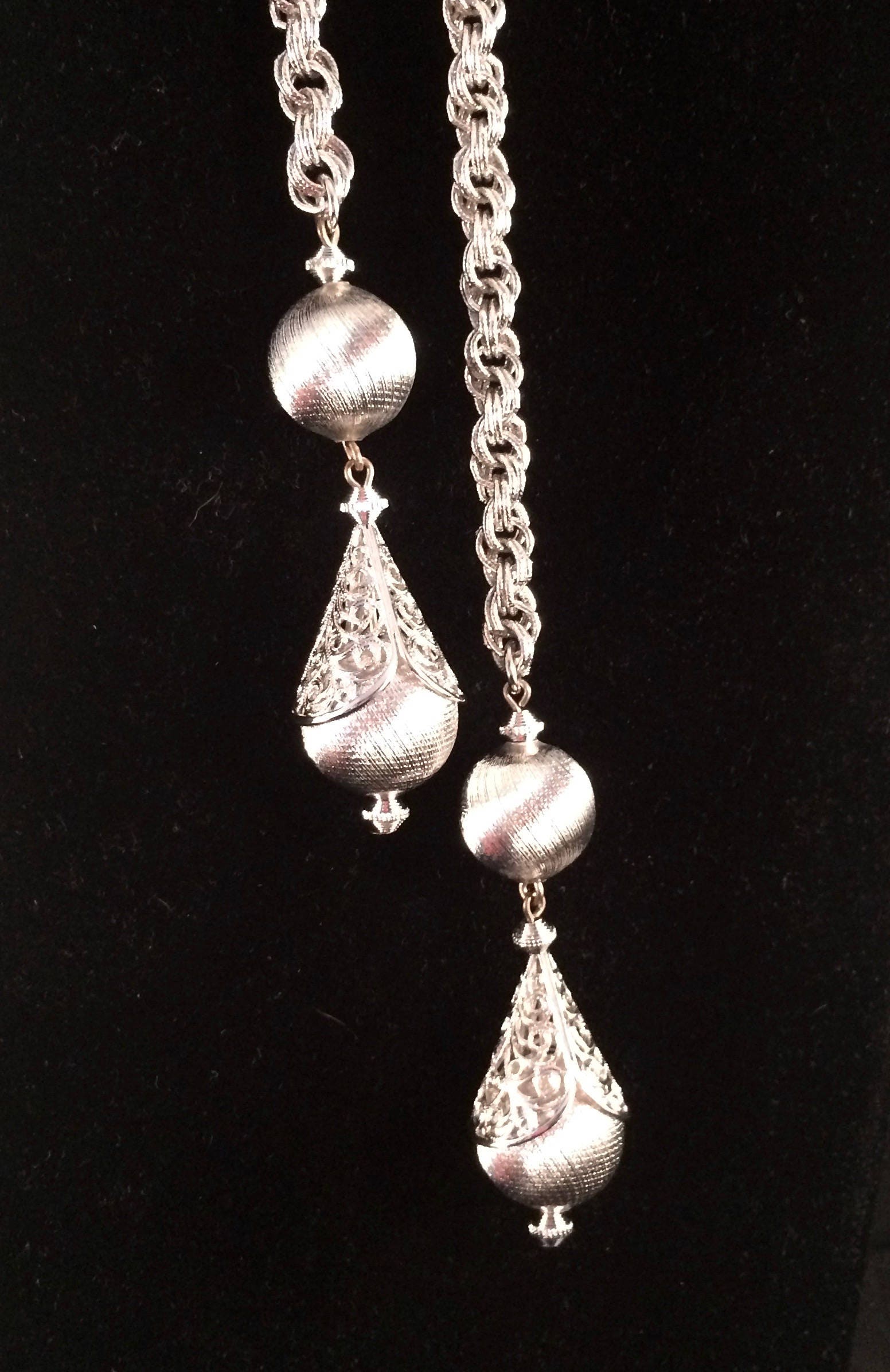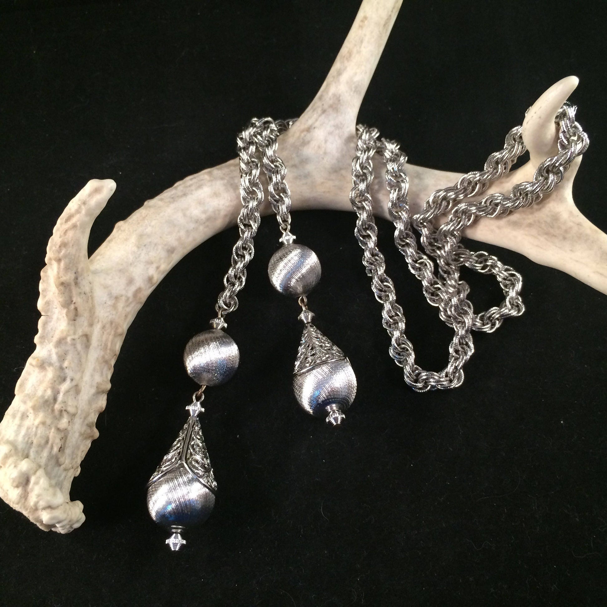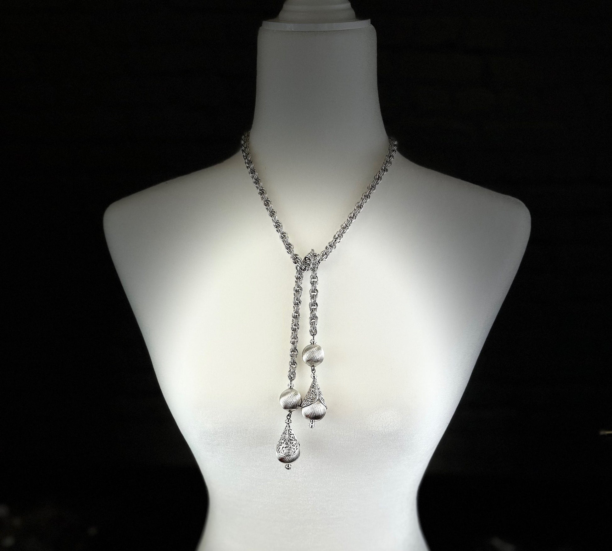 This fabulous lariat-style necklace from Monet offers a wonderfully thick silver tone chain that ends with finely textured silver tone balls and decorative caps.