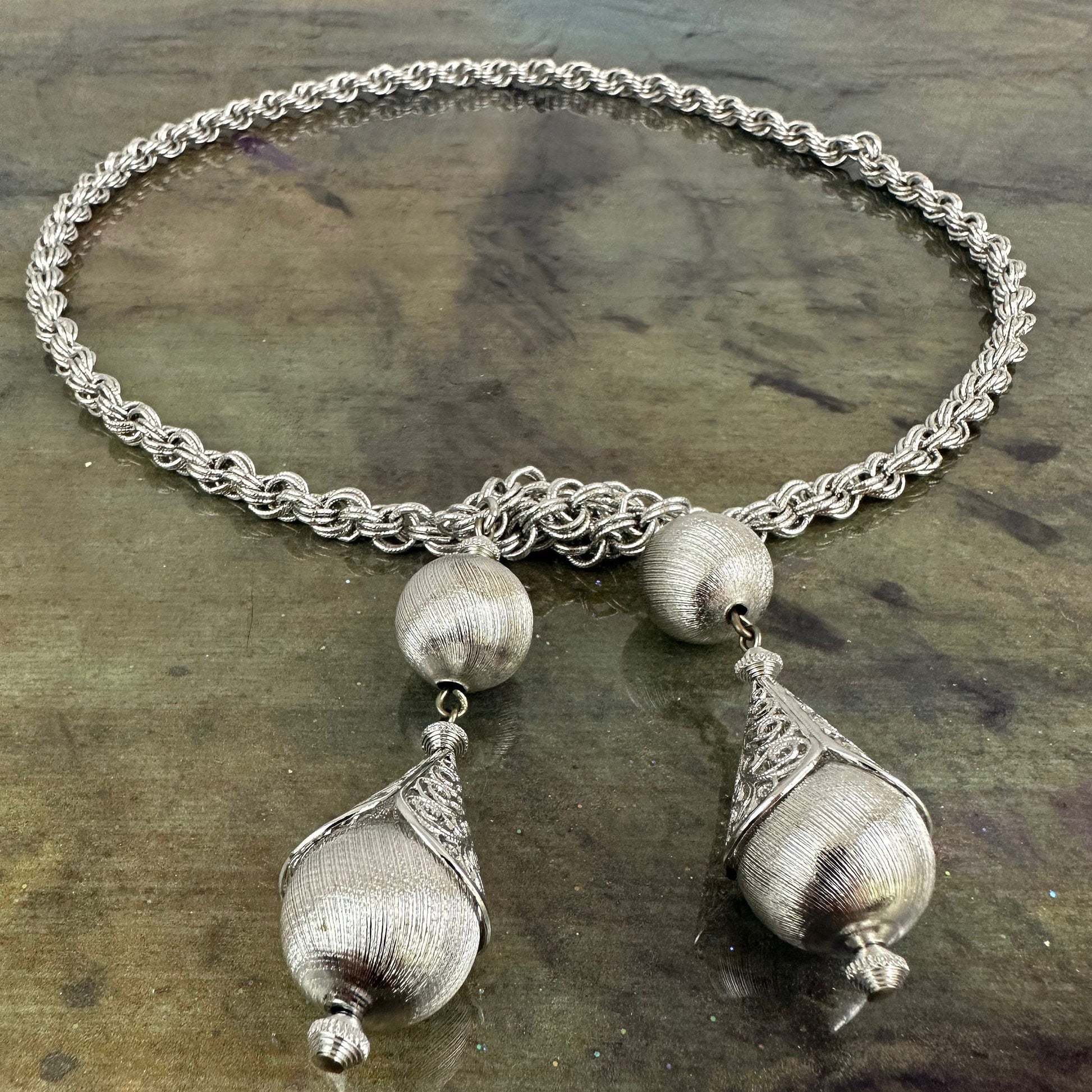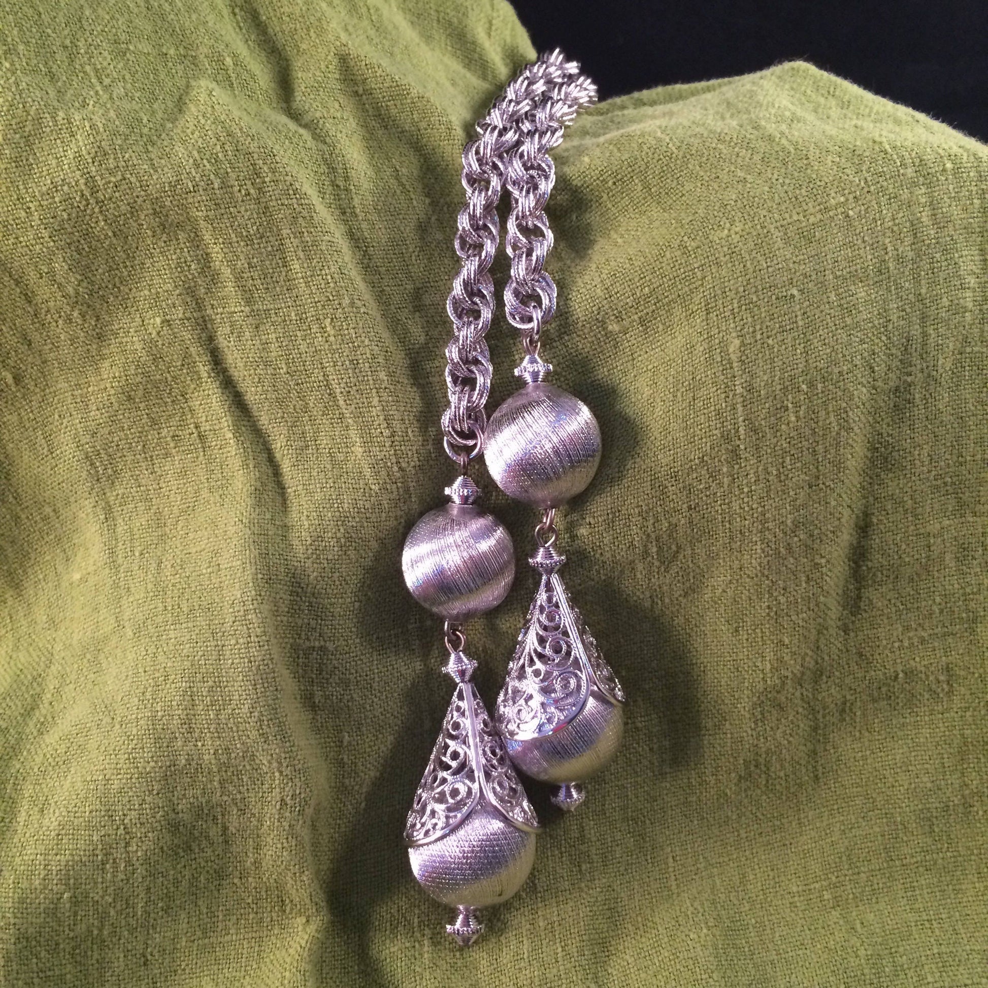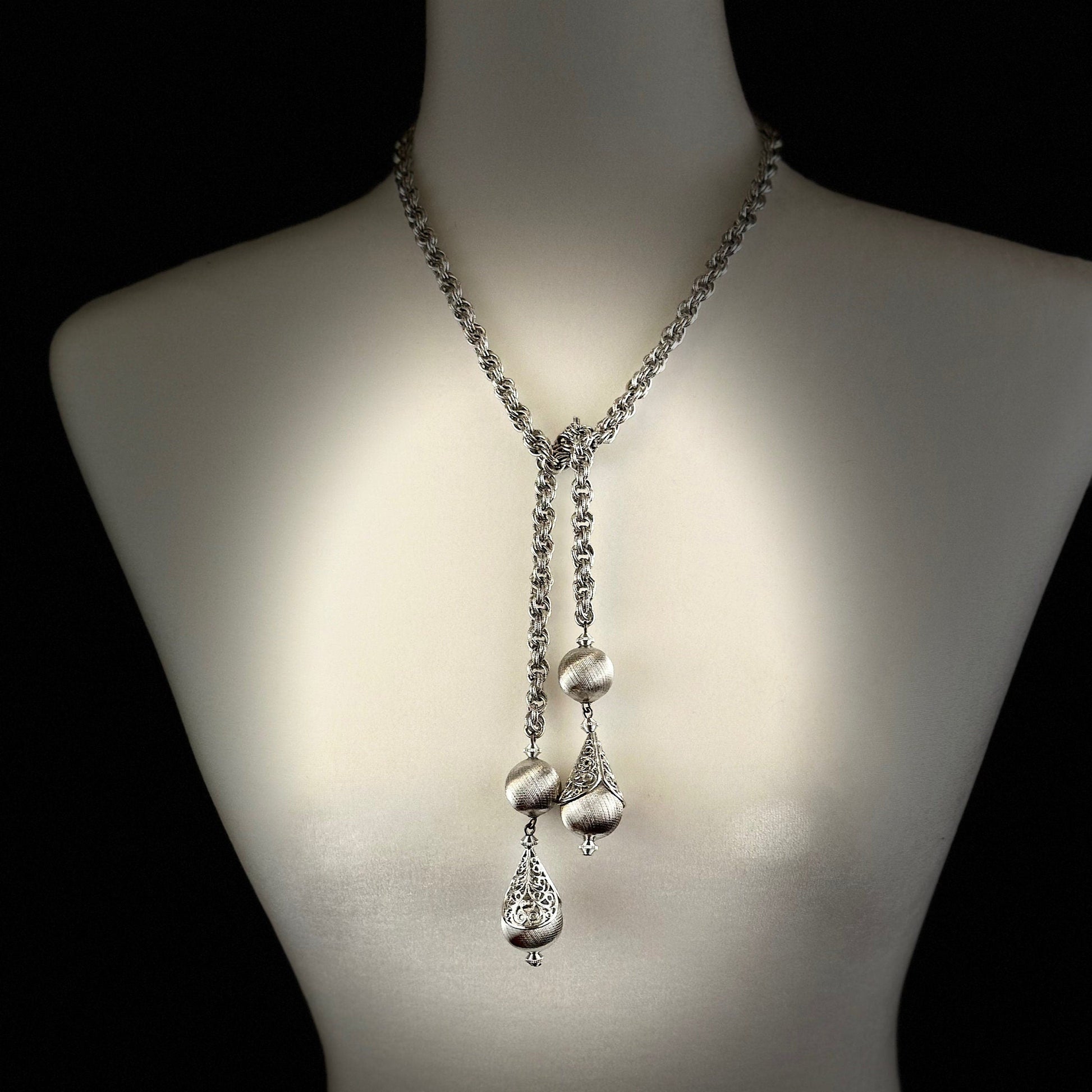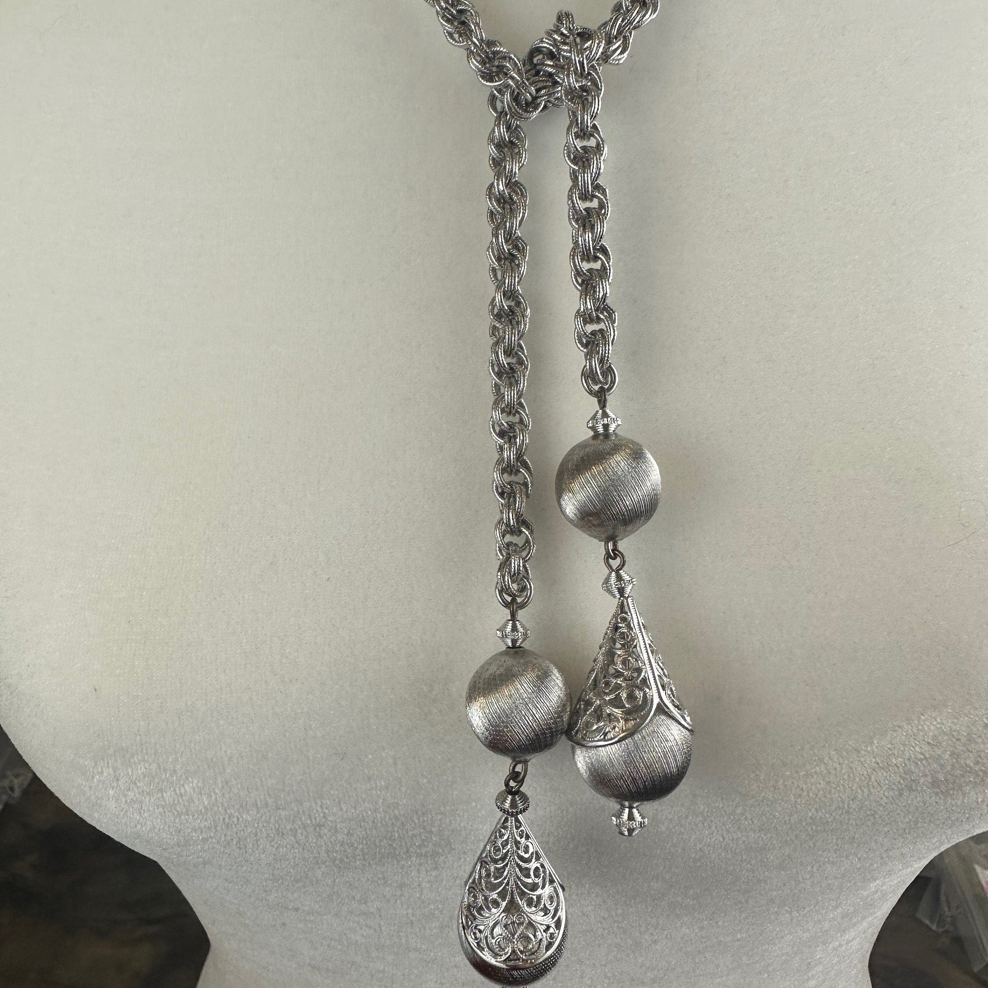 This fabulous lariat-style necklace from Monet offers a wonderfully thick silver tone chain that ends with finely textured silver tone balls and decorative caps.