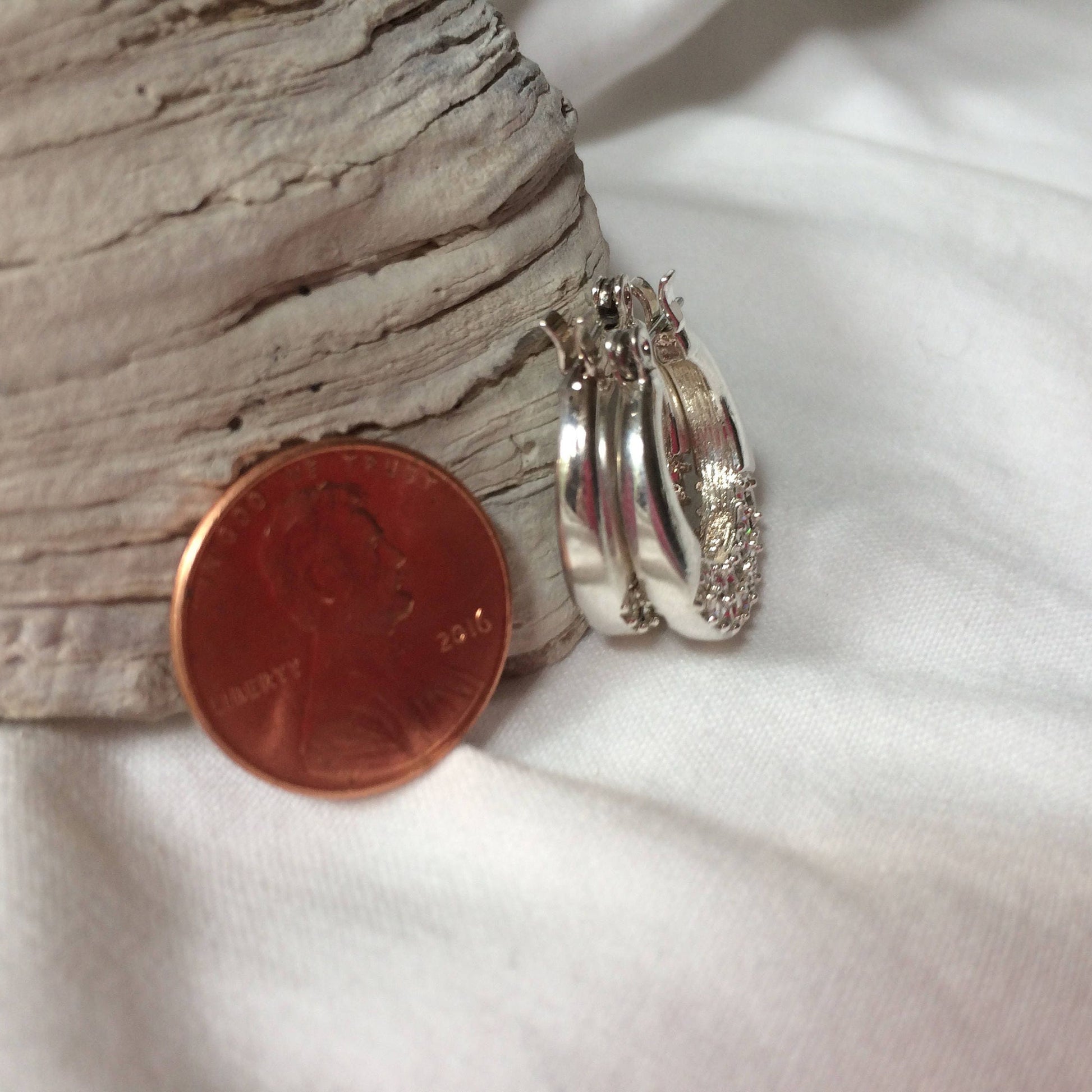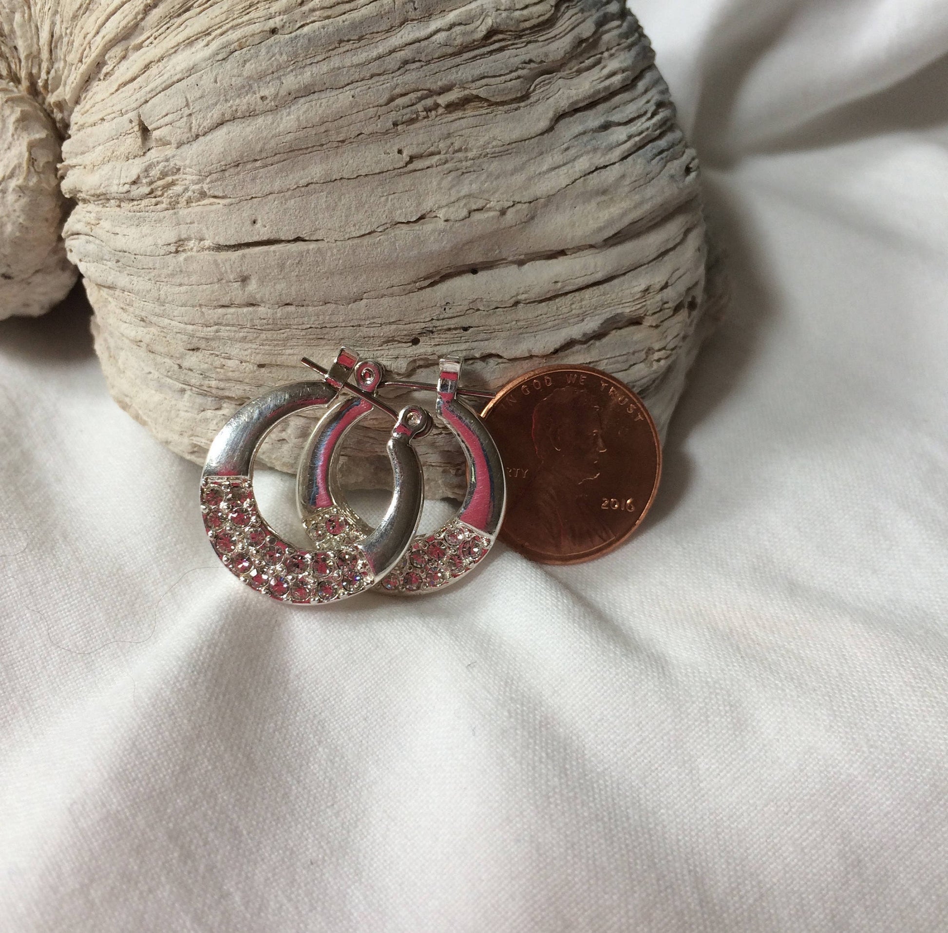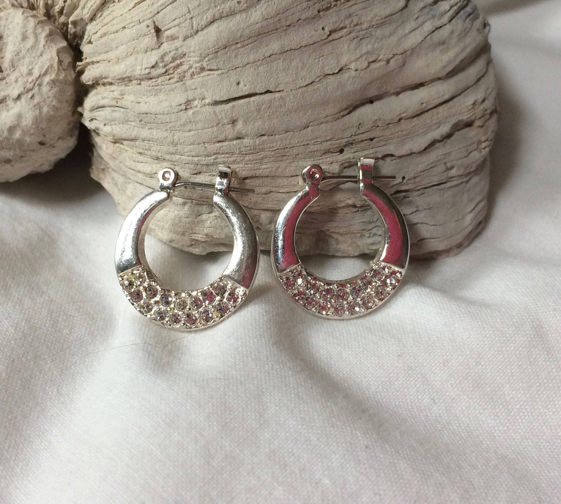 Vintage Napier Silver plated and pave crystal round hoop earrings- width 2cm. Crystal are in two rows at the bottom of both sides of the hoops- marked Napier inside the hoops. These hoops are classy and timeless, have been worn several times and polish up nicely- All crystals present and in wonderful shape. Great costume piece that will last for years!!!