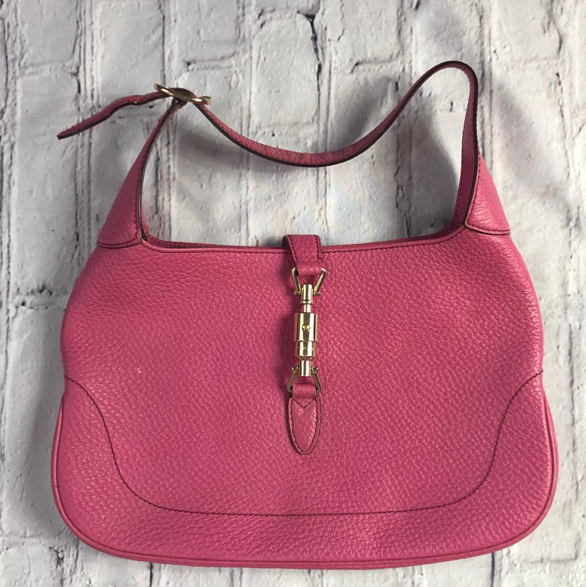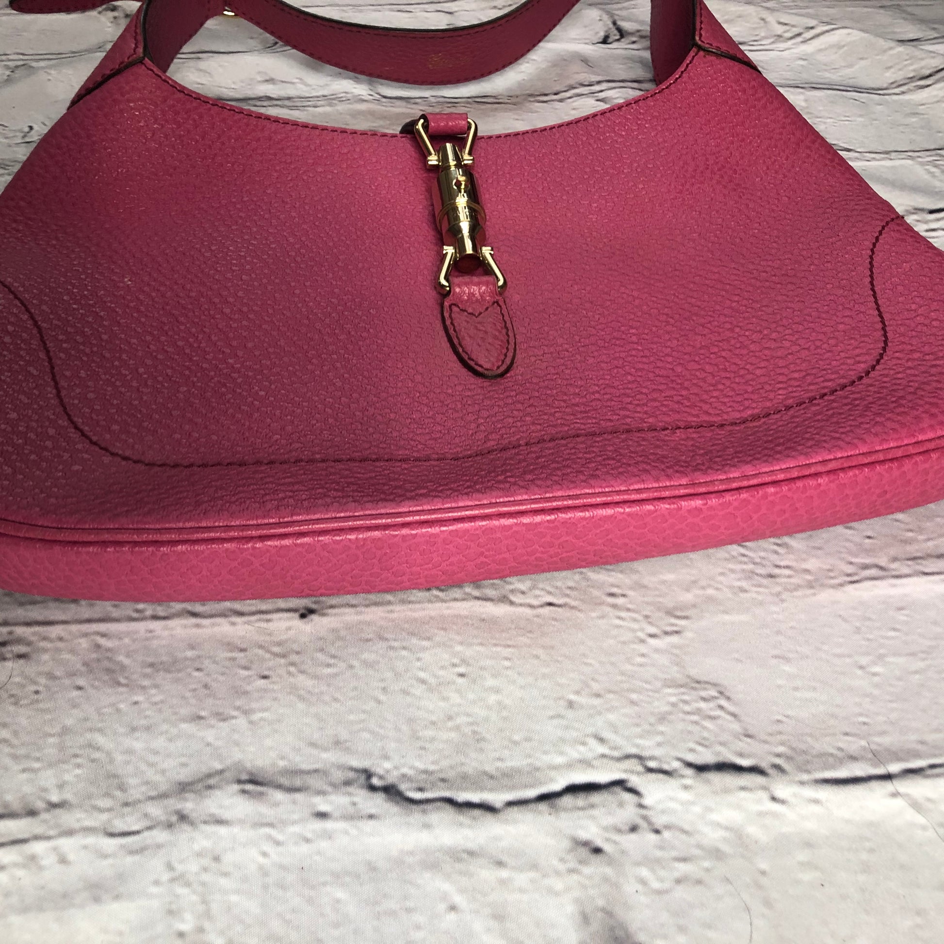 As a vintage addition to your ensemble, this pebbled leather Gucci 1961 Jackie Hobo purse is perfect for a day out. Measuring 13"x1"x8"(LxWxH), with 7" strap, it securely closes with a gold heavy Piston-lock clasp. The black leather interior boasts 1 zip pocket while the 1lb 1.9oz weight adds little to your load. In almost perfect condition, with a little wear behind the piston lock and in the corresponding leather at the buckle on the strap